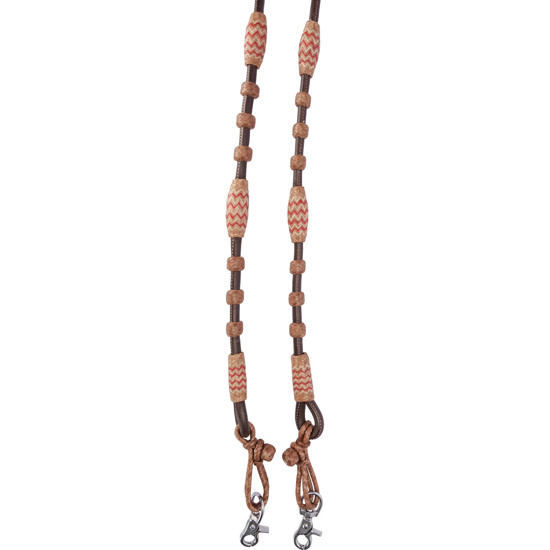 Add polished style to your western setup with the Schneiders® Chocolate Leather Romel Reins with Rawhide Accents. These beautifully rolled reins are crafted from rich harness leather and finished with alternating rawhide knots, red and white accents, and your choice of connection ends. Ideal for ranch riding, trail work, or performance classes requiring romel reins.