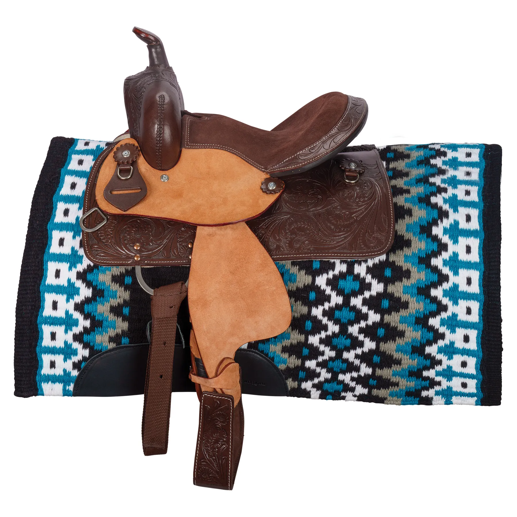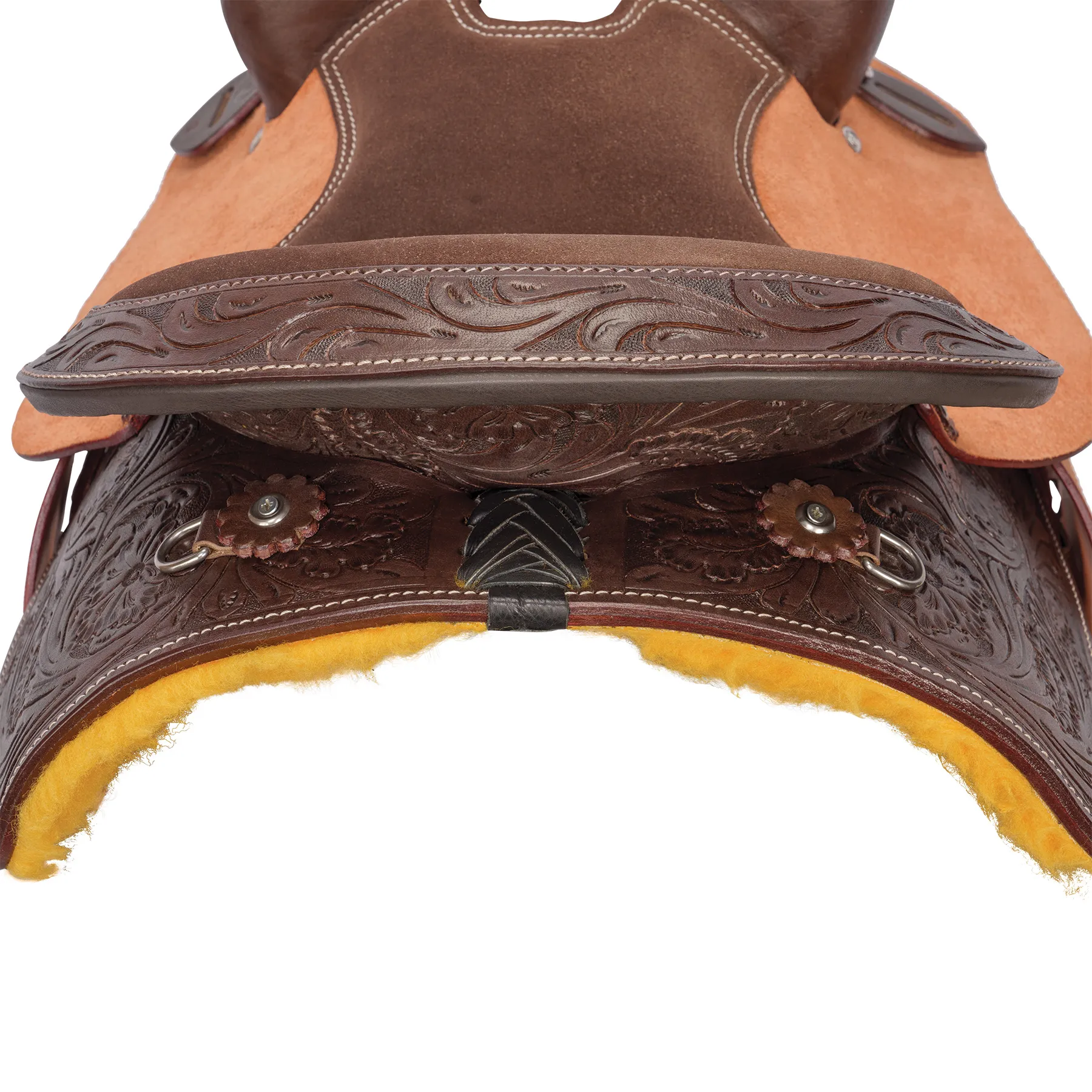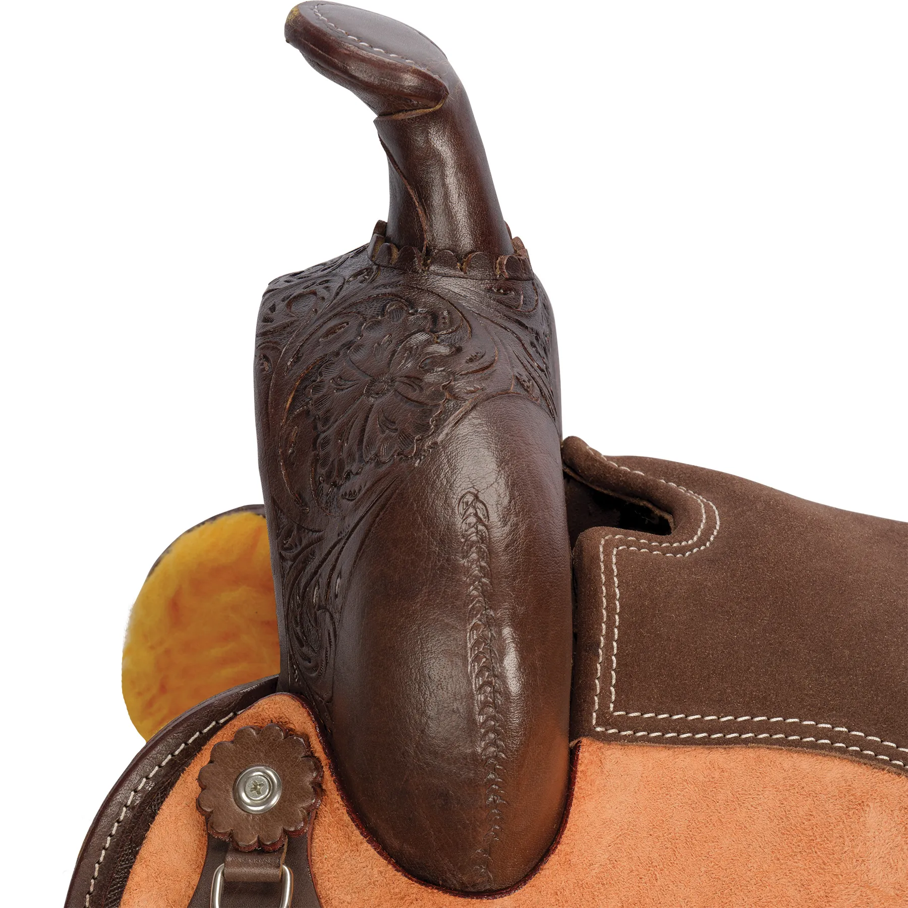 When your young rider needs a Western saddle, they need a saddle that meets them where they are. This is an ideal first saddle for young riders. It is crafted from premium leather with a semi-quarter horse bar for a versatile fit. The beautifully crafted floral tooled leather skirt, pommel, cantle, and stirrups add flair and style so your young rider feels like a real Western rider. The roughout seat jockey and fenders provide extra 'stick' in the saddle, and it has a comfortable hand-shaped padded seat for great balance, so young riders can concentrate on their lessons and get the seat and movements just right. Built on a lightweight fiberglass tree with a 5-year warranty, this saddle is light enough for young riders to lift, teaching them the importance of being able to tack and untack their horse.
