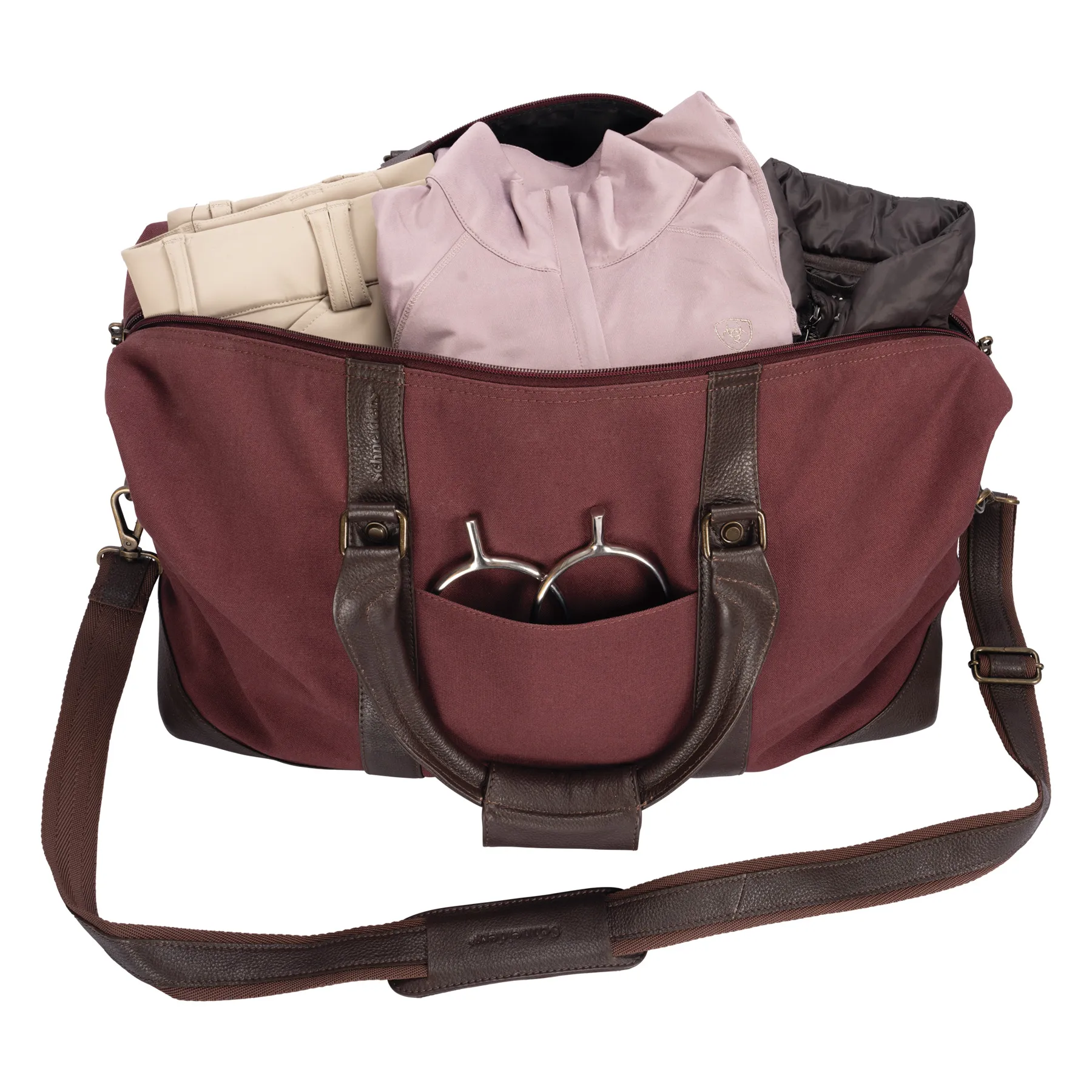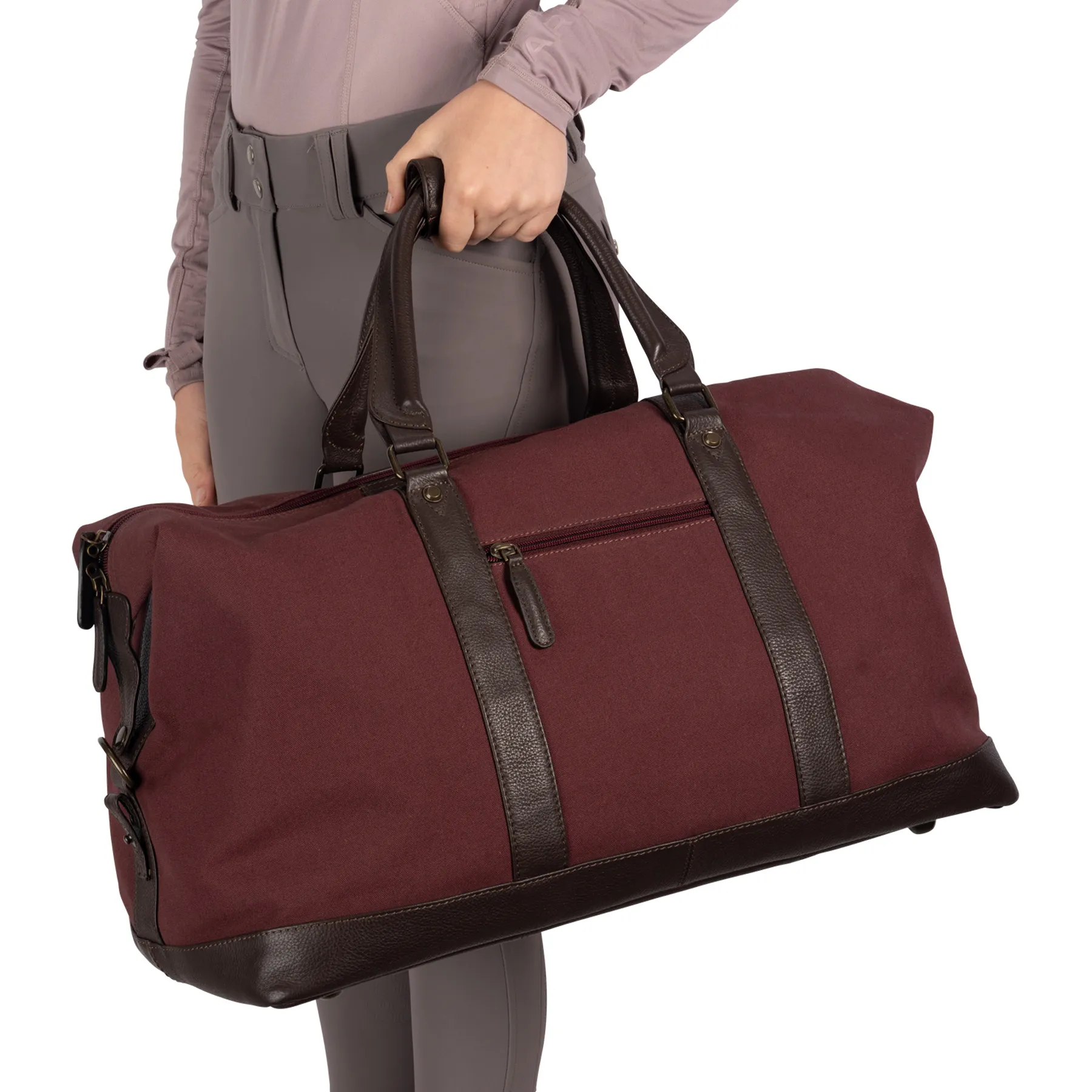 Our Limited Edition Canvas Duffle Bag combines timeless design with practical storage, ideal for weekend shows, barn overnights, or stylish getaways. Crafted from heavy 14 oz burgundy canvas, rich brown leather, and antiqued bronze hardware, this roomy duffel has just the right blend of rugged durability and refined detail. With multiple pockets and smooth nylon lining, it's ready to carry it all in style.