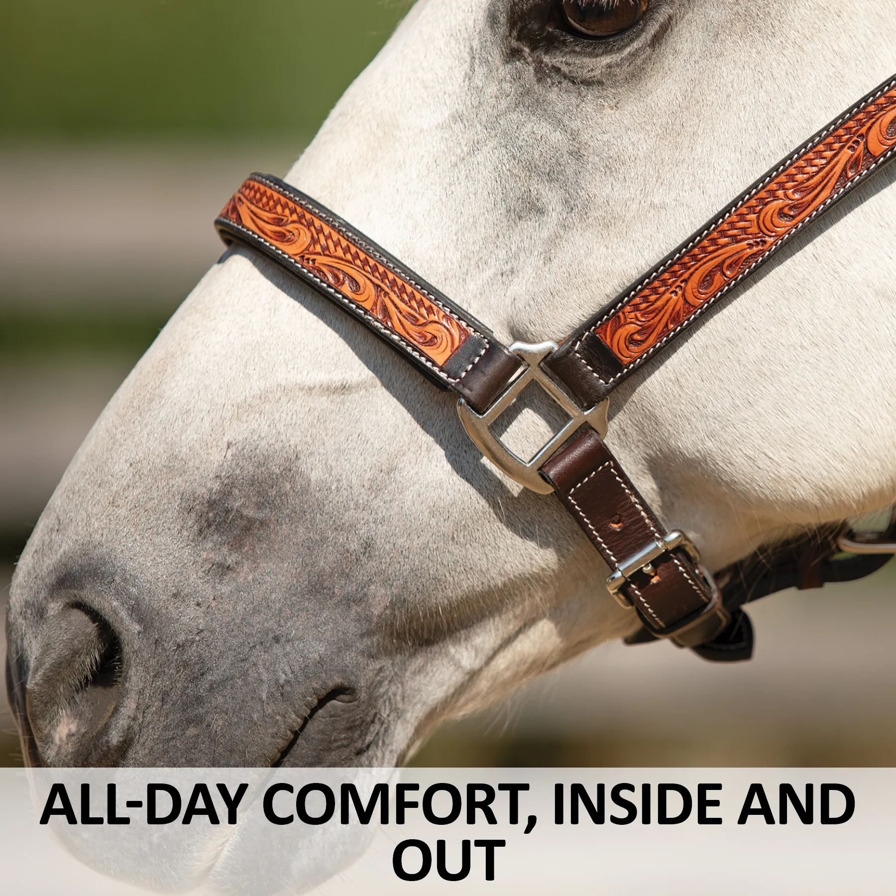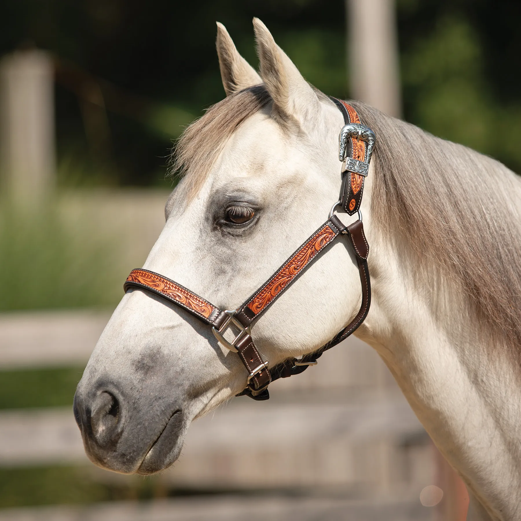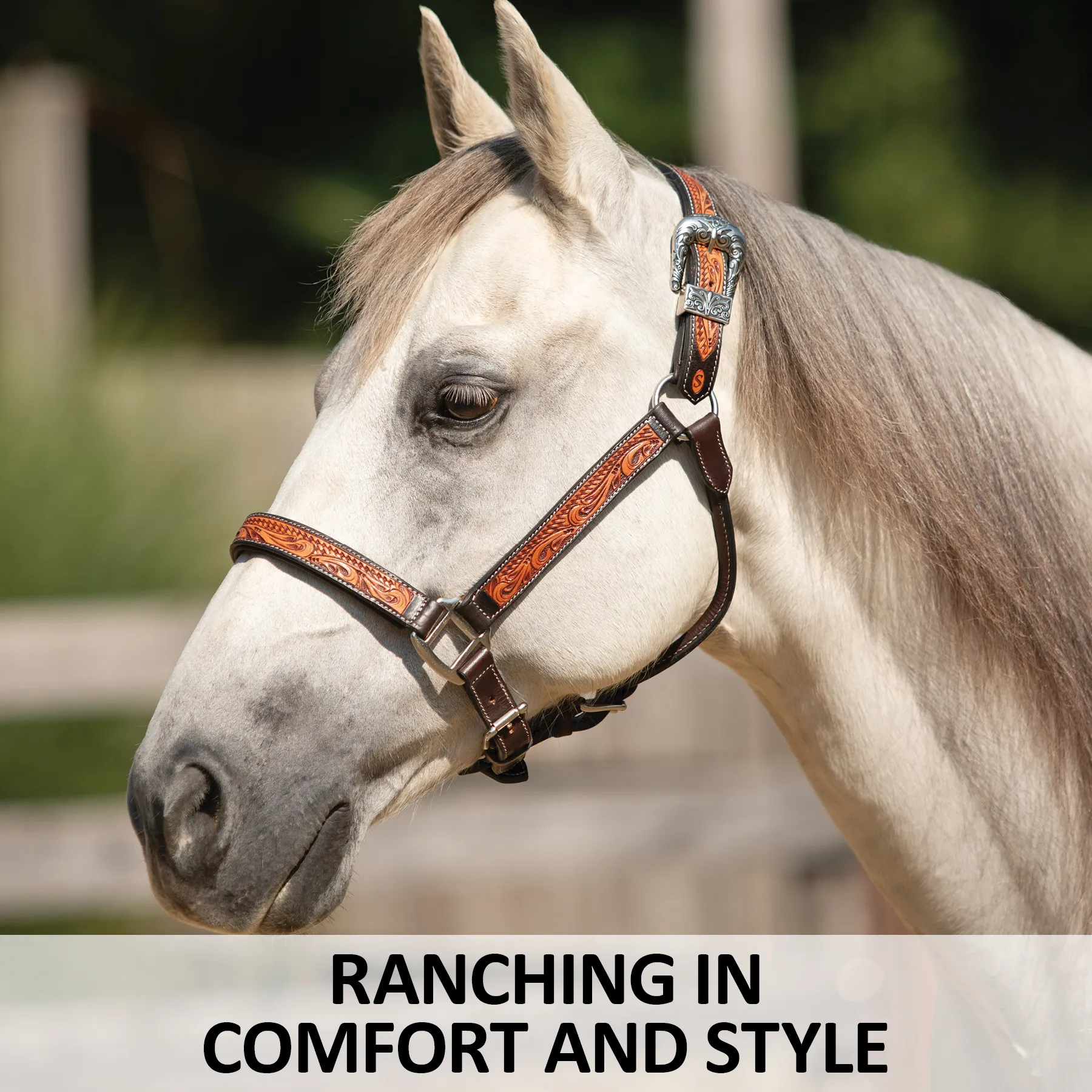 Bring both rugged durability and refined elegance to your barn with this handcrafted leather ranch halter, designed for performance, built for comfort, and styled to stand out. Whether you're heading into a Ranch Halter class or just want your horse looking sharp at home, this halter blends hand-tooled artistry with practical comfort. Made from premium Argentine leather, it features a striking combination of basketweave and floral tooling, a padded nose and crown for pressure relief, and a semi-custom fit that flatters petite mares, Arabians, and full-size stock horses alike.