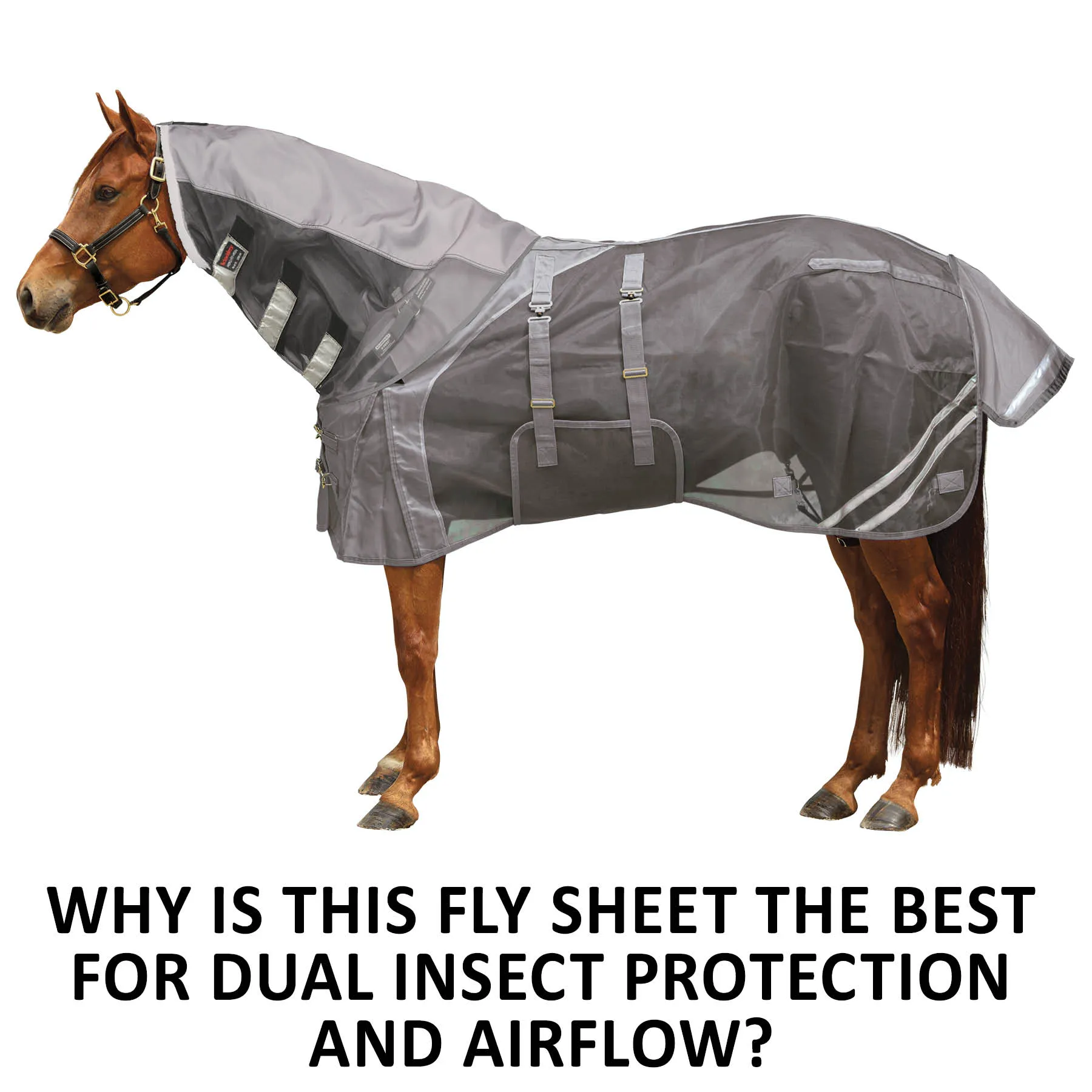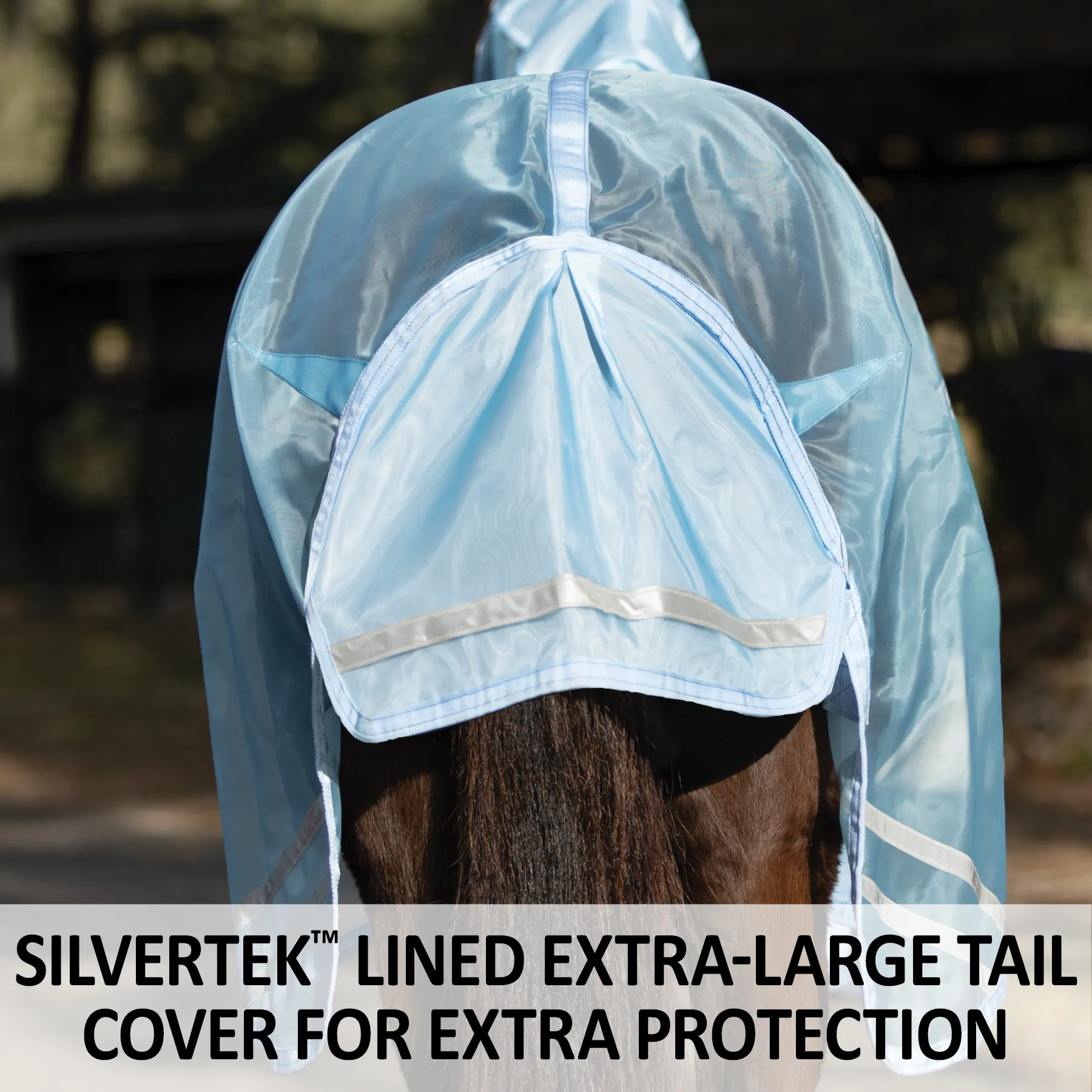 When the bugs are bad, the sun is glaring, and you need to protect your horse from the widest range of flying insects, reach for this fly sheet with an attached neck, open front design, and a bellyband closure for extra protection. The extra fine "window screen" 350D nylon mesh material prevents even the tiniest gnats from getting to your horses while providing exceptional airflow. Plus, it features reflective stripes for safety and SilverTek® technology with antibacterial nylon lining on the chest, shoulders, and tail flap. It comes in our comfortable Attached Neck V-Free® Wither Relief fit option that relieves pressure on low to moderate-withered horses, offering full protection from ears to tail. The sheet contours to your horse's body for a comfortable fit, providing 40% UV protection.