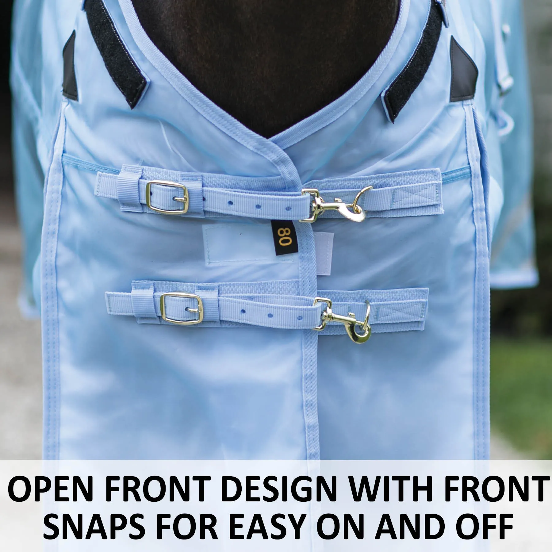 When the bugs are bad, the sun is glaring, and you need to protect your horse from the widest range of flying insects, reach for this fly sheet with an open front design and a bellyband closure for extra protection. The extra fine "window screen" 350D nylon mesh material prevents even the tiniest gnats from getting to your horses while providing exceptional airflow. Plus, it features reflective stripes for safety and SilverTek® technology with antibacterial nylon lining on the chest, shoulders, and tail flap. It comes in our comfortable V-Free® Wither Relief fit option that relieves pressure on low to moderate-withered horses, such as Arabians, Quarter Horses, and other Stock breeds. The sheet contours to your horse's body for a comfortable fit, providing 40% UV protection.