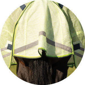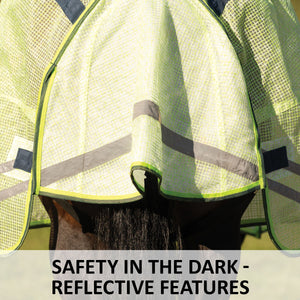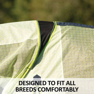 Do you have a mischievous horse that likes to play hard or their pasture mates play hard when playing or biting other horses? Then this is the sheet for you! This sheet, complete with an attached neck cover, provides your horse with the best airflow, and the 'No-Chew' coating deters horses from biting their sheet and destroying it. The 300D soft, shiny, and reflective nylon stays cool in hot weather, allowing for the greatest airflow while protecting your horse from irritating biting bugs, such as gnats and flies, AND providing 40% UV protection.