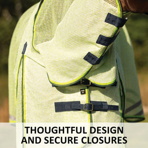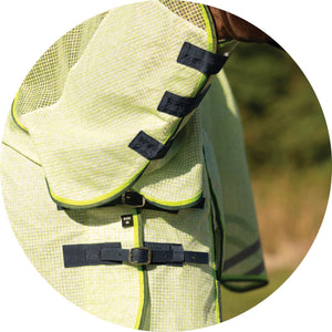 This fly sheet features a powerful, hot flavor coating that horses don't like. This deters horses from chewing on the sheet, keeping it safe from themselves and their buddies. This coating doesn't impact the breathability of the sheet, and it's not harmful if ingested. Lasts for up to 4 washes.