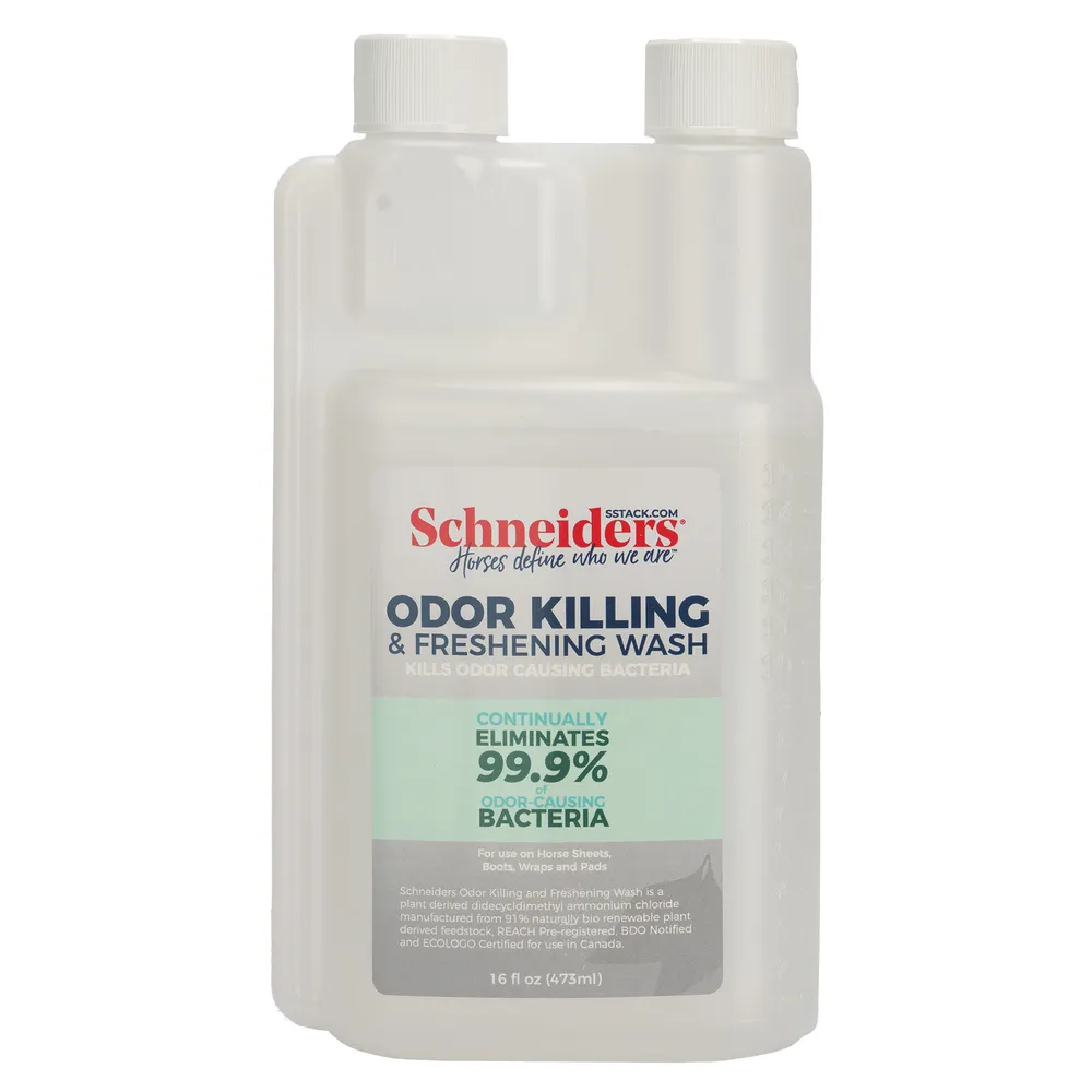 This odor-killing and freshening wash is a concentrated formula that kills odor-causing bacteria long after washing. This REACH pre-registered, BDO-notified and ECOLOGO-certified cleaner kills 99.9% of odor-causing bacteria while being safe for the environment. It stays active on the textile surface, continuing to prevent cross-contamination from multiple odor-causing bacteria. The wash doesn't affect the waterproofing or breathability of your horse's clothing, making it the ultimate cleaner for your horse's sheets, blankets, wraps, and pads. Use it with your Schneiders Blanket Wash or laundry detergent.