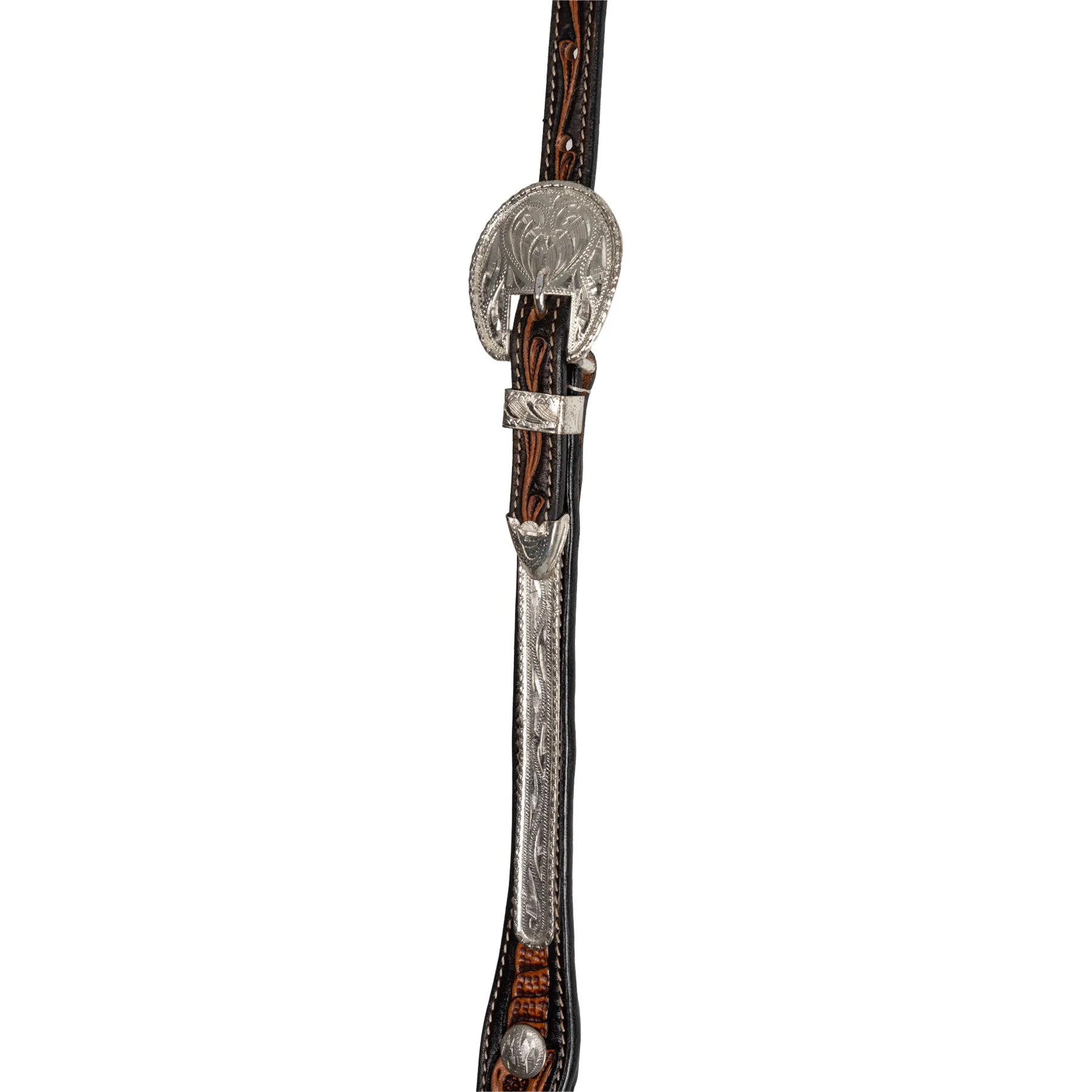 - Flat silver cheeks with a matching silver buckle keeper and tip