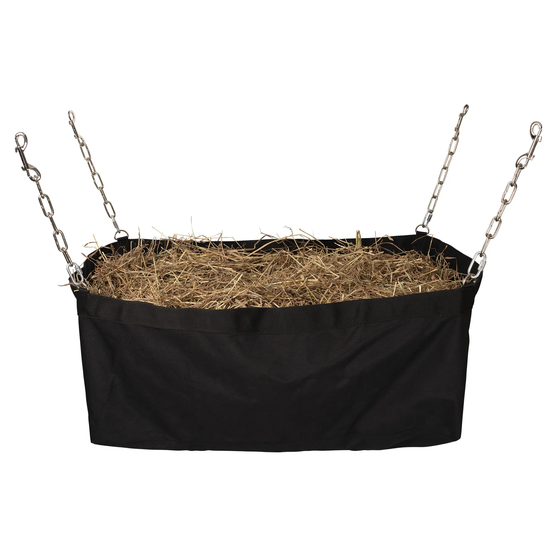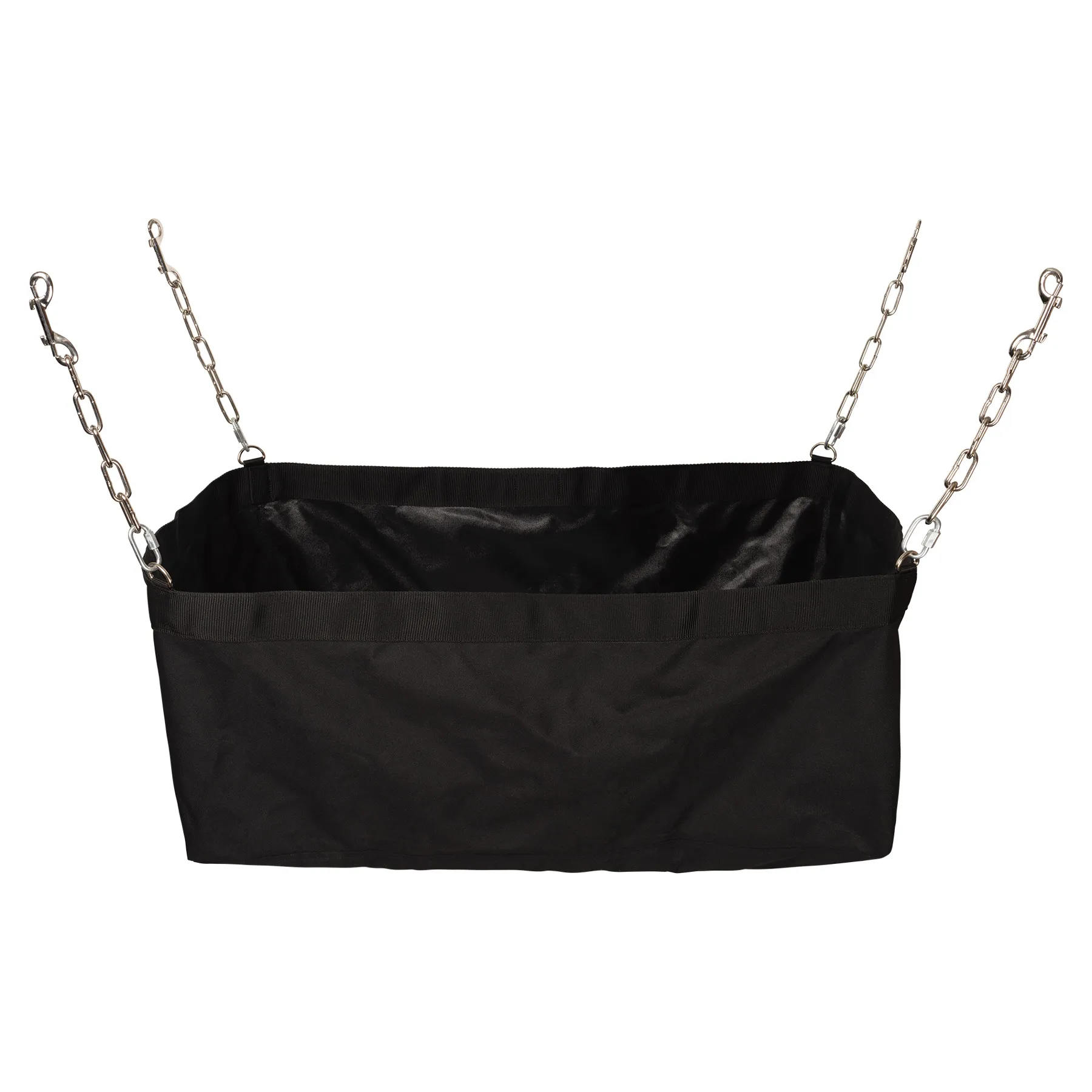 The Schneiders® Open Nylon Square Feeder is a practical, easy-access hay solution designed specifically for front load horse trailers. The rectangular shape fits securely against chest bars, making it ideal for organized feeding during travel while helping keep hay contained and off the trailer floor. Its wide open-top design allows horses to eat naturally without small net openings, making refills quick and simple between stops. Constructed from durable 600 denier polyester with reinforced nylon web trim, this feeder is built to handle regular hauling and daily barn use. Four adjustable link chains with double end snaps allow secure attachment to existing trailer rings so you can position it at an appropriate height for your setup. Designed for convenient travel feeding and routine hauling needs.