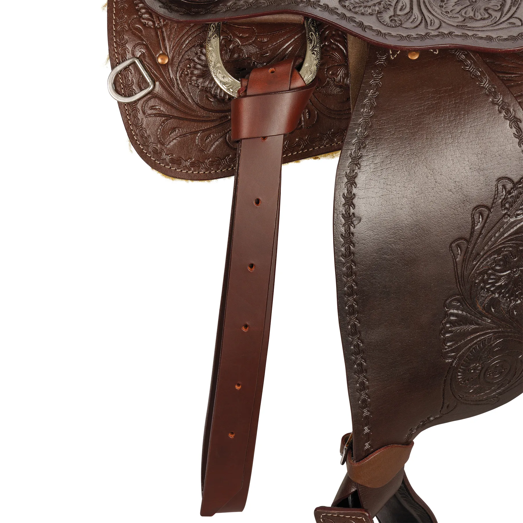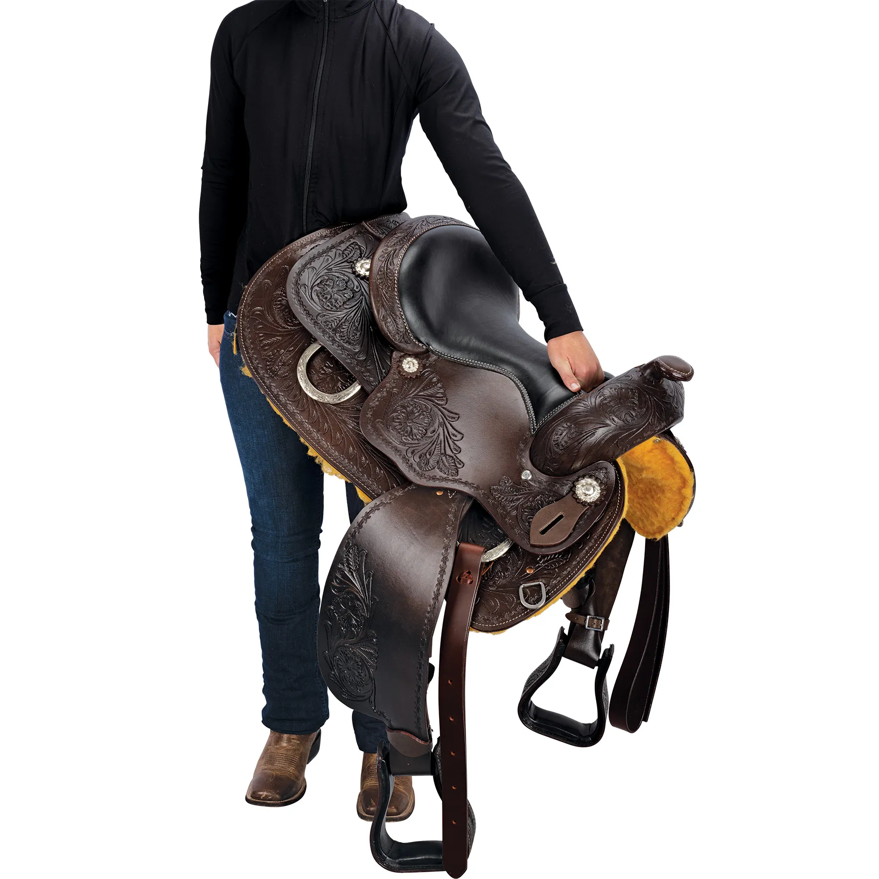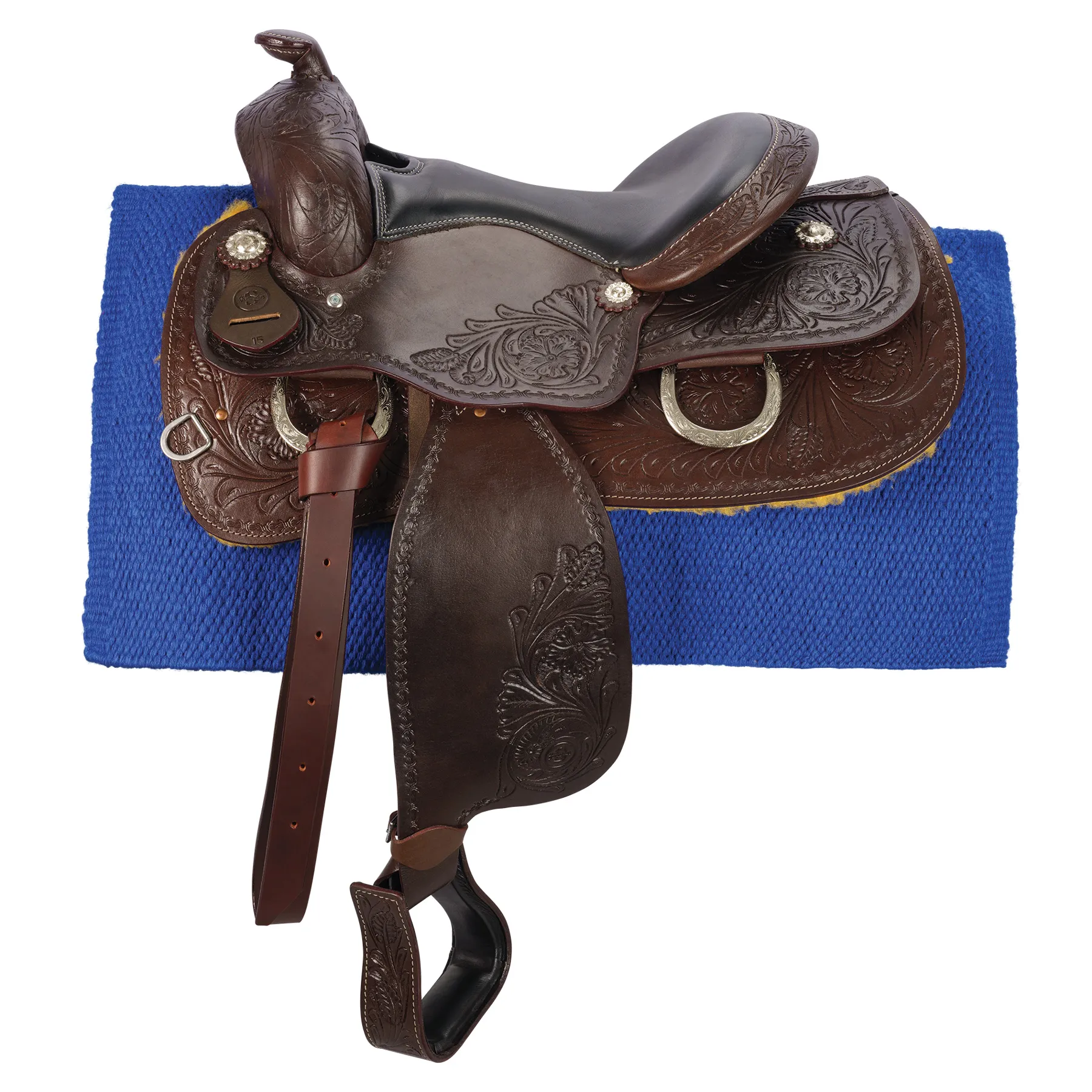 This western show saddle is exquisitely hand-tooled and versatile enough for shows, daily work, or trail riding. The lightweight fiberglass tree comes with a 5-year warranty, while the full horse bars accommodate most modern conformations. Our show saddle also features a gorgeous floral tooling pattern with a barbed wire border, smooth leather fenders, skirt jockey, and generously padded seat, ensuring both comfort and style.