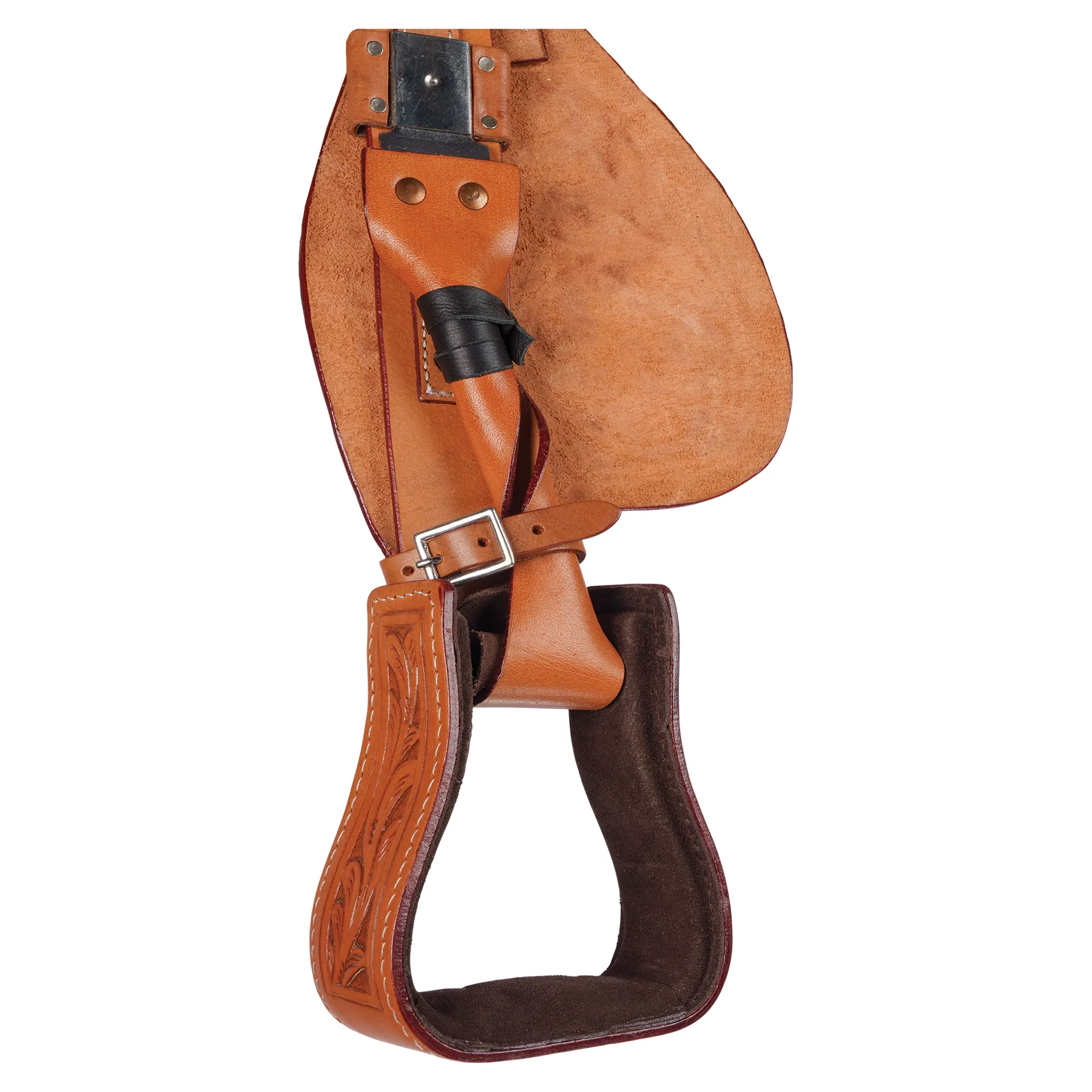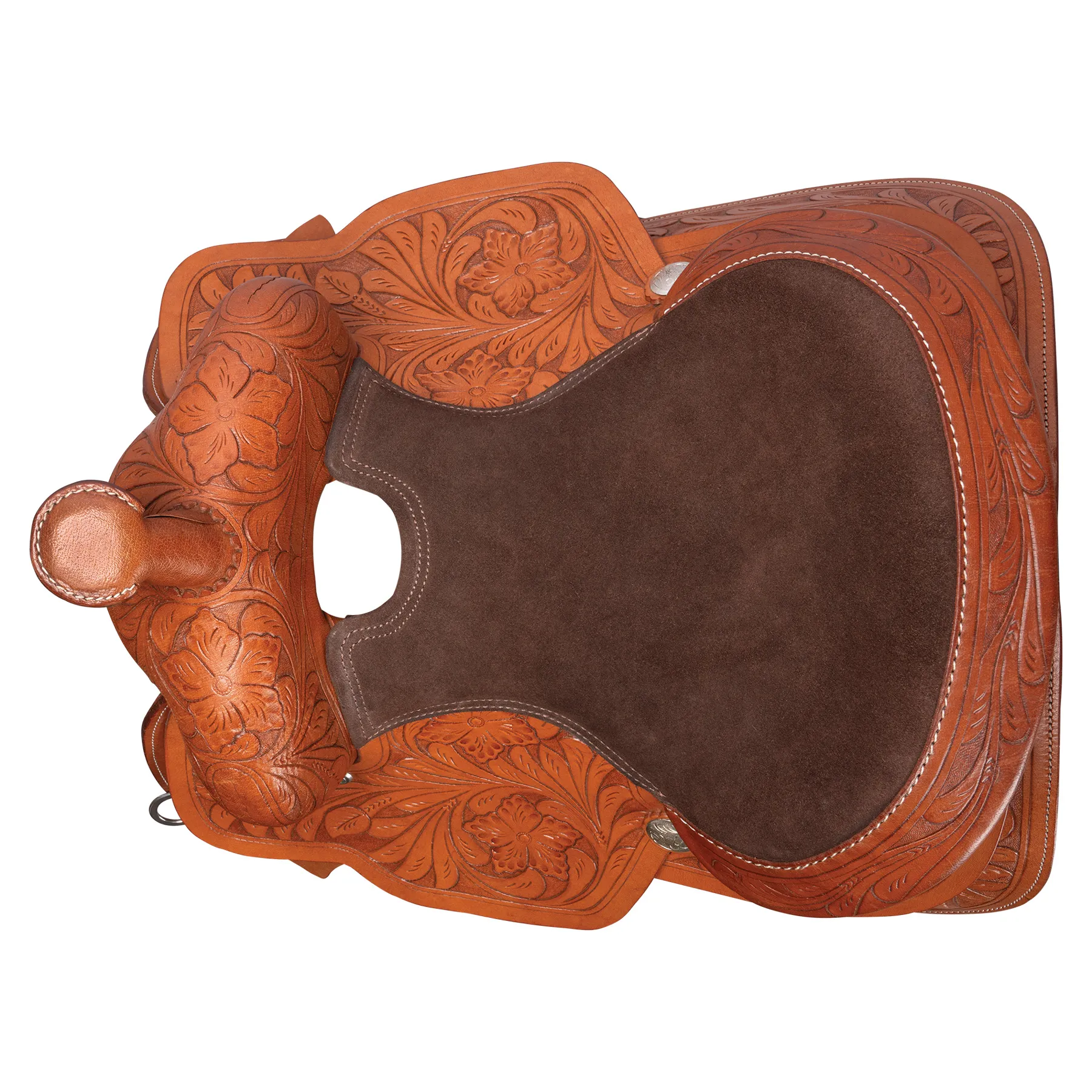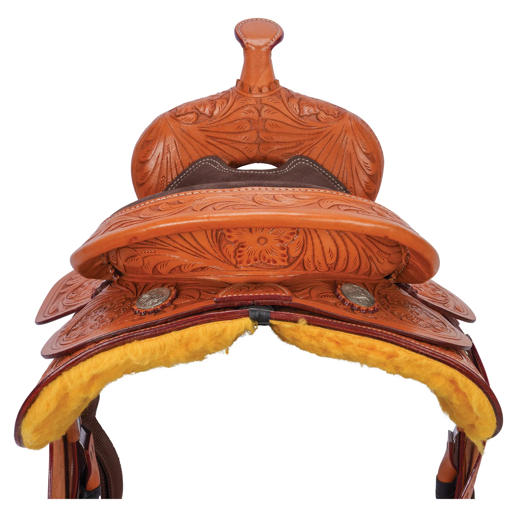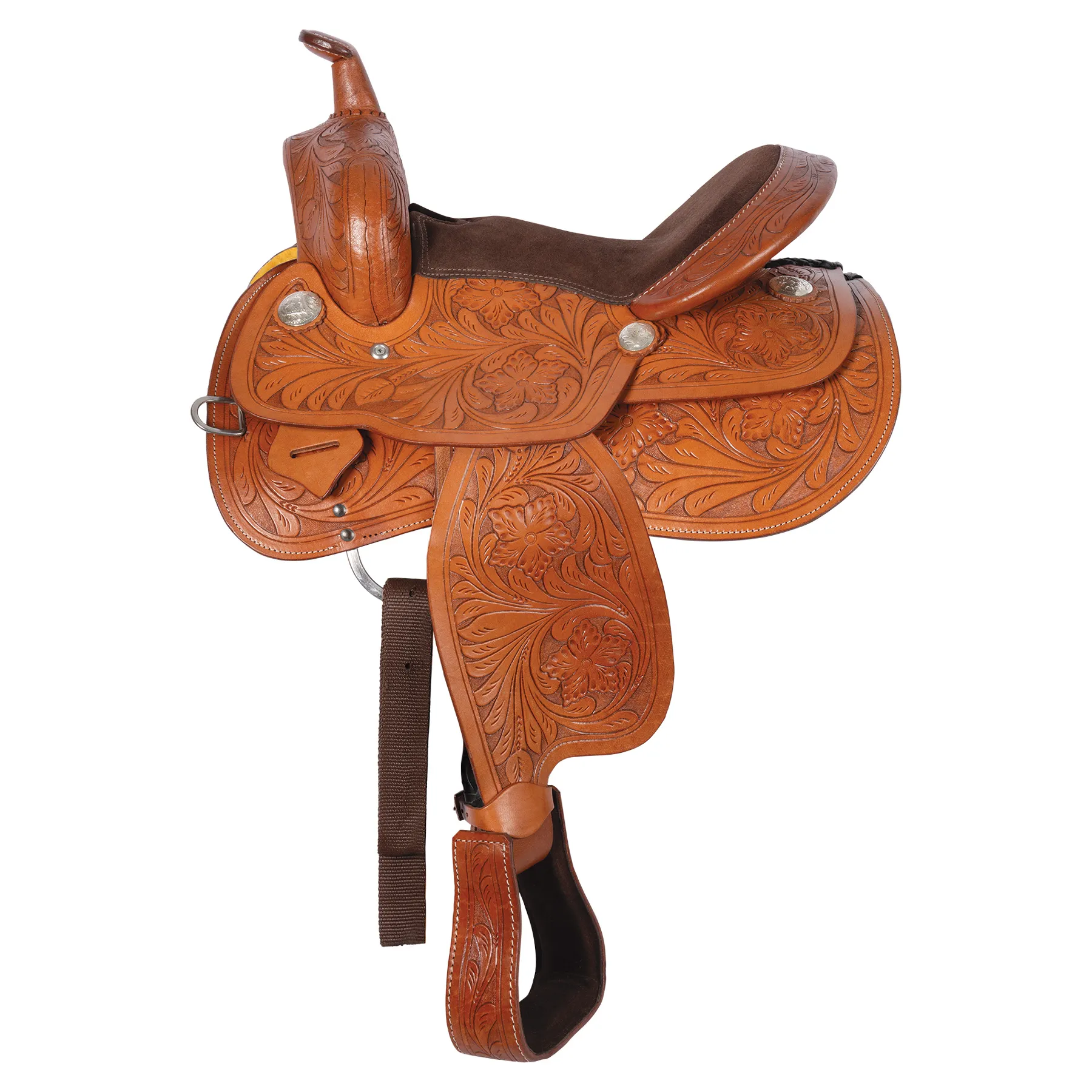 This is an outstanding entry-level western saddle for young riders at an amazing value and features a beautiful floral tooled crafted leather with silver plated accent conchos. The comfortable hand-shaped padded seat offers balance to help your kid stay secure while riding. The full horse bars fit a variety of withers, plus this saddle is built on a lightweight fiberglass tree with close contact skirting.