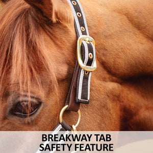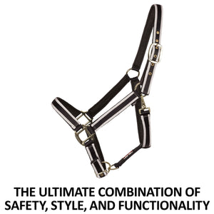 Crafted with your horse's safety in mind, this halter is made from durable, comfortable nylon material built to last. It also has safety features, such as a leather breakaway tab at the crown and a reflective strip to make your horse visible in the dark.