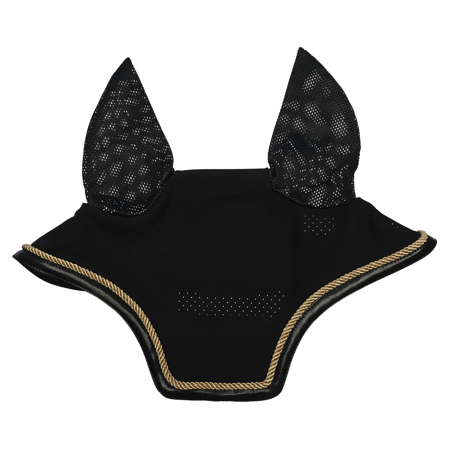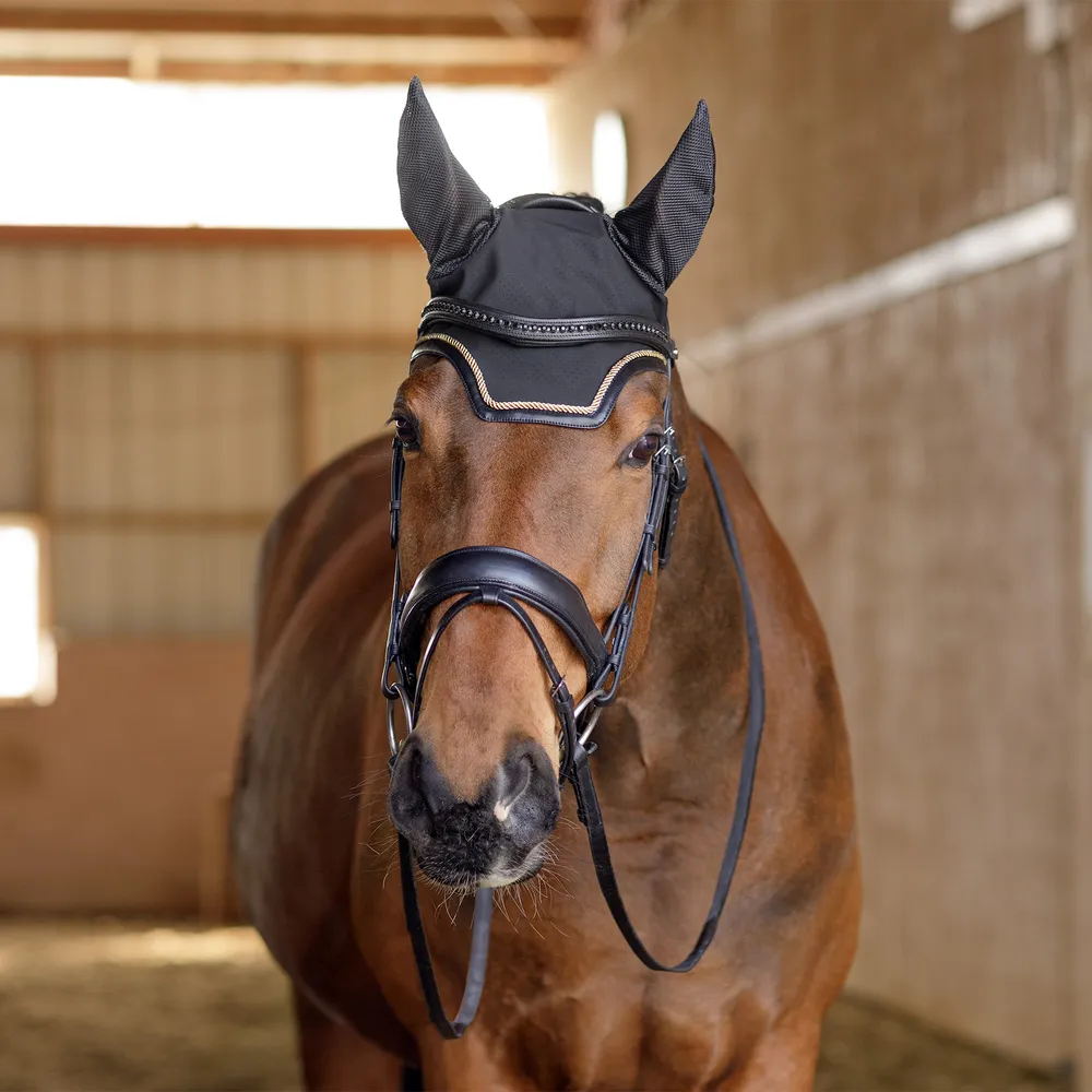 Keep your horse comfortable, protected, and stylish with this performance mesh fly veil. Designed for both performance and everyday riding, this breathable fly bonnet helps shield your horse from insects while enhancing airflow and flexibility. With premium materials, a squared-off front design, and elegant leather binding, it's a must-have for any well-dressed horse.