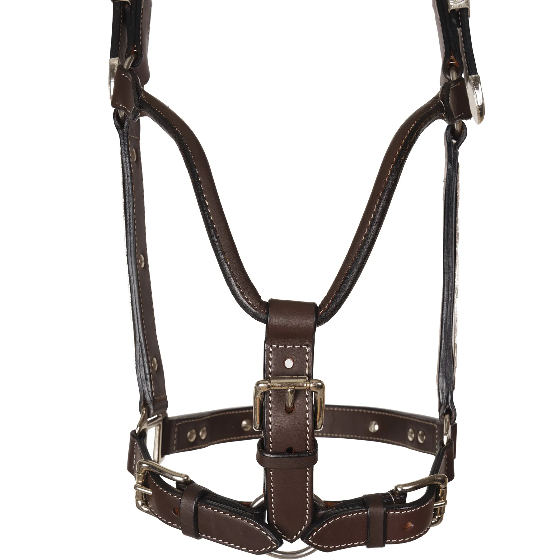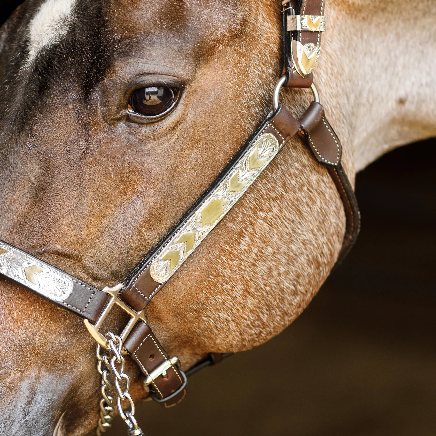Turn heads in the show ring with this understated yet elegant halter, perfect for open and 4-H level competition. Crafted from soft, high-quality Argentine leather with crisp white stitching, it features hand-engraved silver accented with a gold Southwest design for just the right amount of shine. Designed for comfort and adjustability, it includes a matching leather lead with chain - ready for your next entrance.
