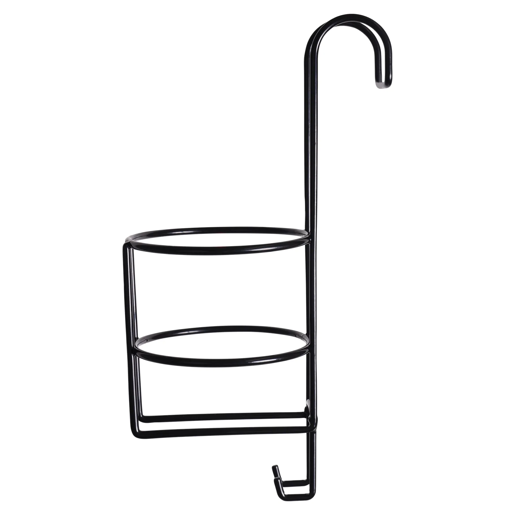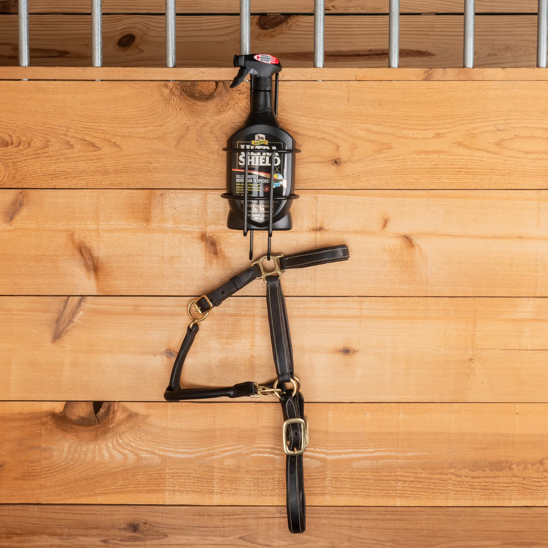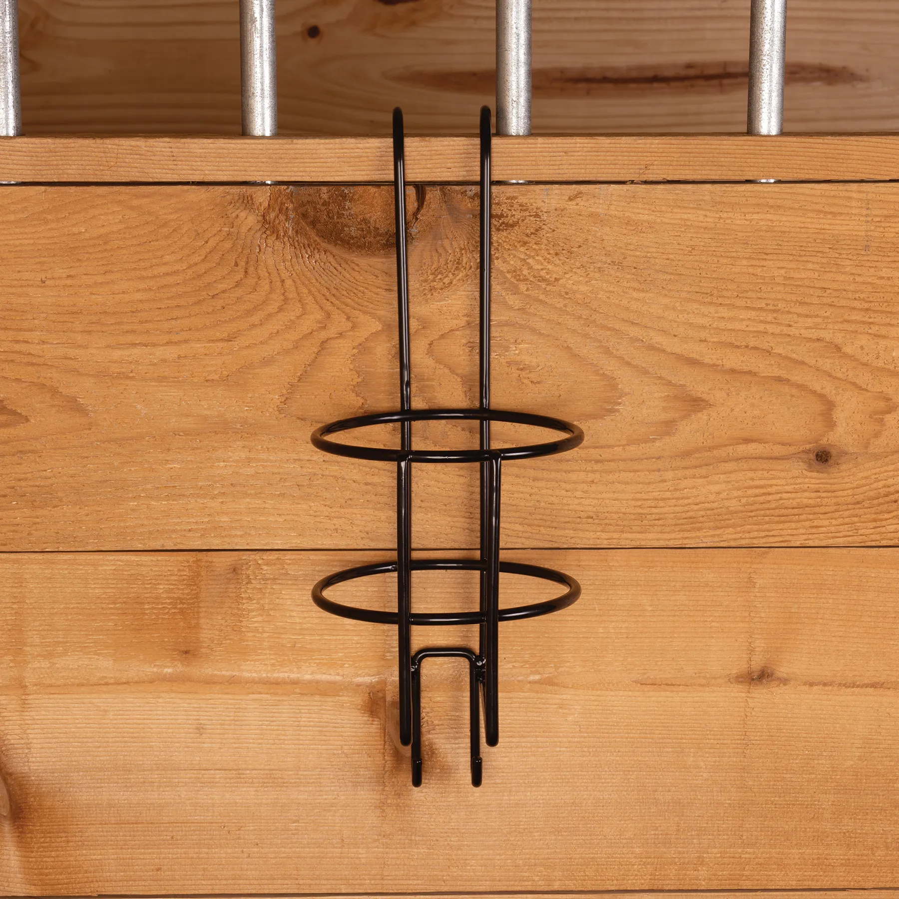 This portable spray bottle holder is a durable and versatile accessory that hangs conveniently on stalls, fences, gates, or doors. Perfect for holding your grooming supplies wherever you need them at home or on the go. The holder is crafted to fit both standard and irregular oval 32-ounce spray bottles, so you don't have to compromise on your favorite incompatible products! Extra hooks on the bottom are perfect for hanging fly masks, halters, and other items for easy access. Crafted from durable carbon structural steel, this spray bottle holder is built to last. The perfect accessory for your grooming supplies!