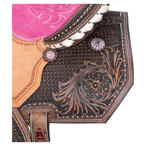 This pink barrel saddle is a state of style and passion for spirited barrel racers. This hand-tooled saddle features a fun, pink-padded suede seat designed to position the rider optimally. It combines traditional craftsmanship with a playful design, including antiqued silver conchos with pink accents and a studded cantle. The saddle'scut-away skirt under the fenders enhances the rider's contact with the horse, providing a more intimate riding experience. Built on a lightweight rawhide-wrapped fiberglass tree, this saddle offers durability while staying light enough for easy handling.