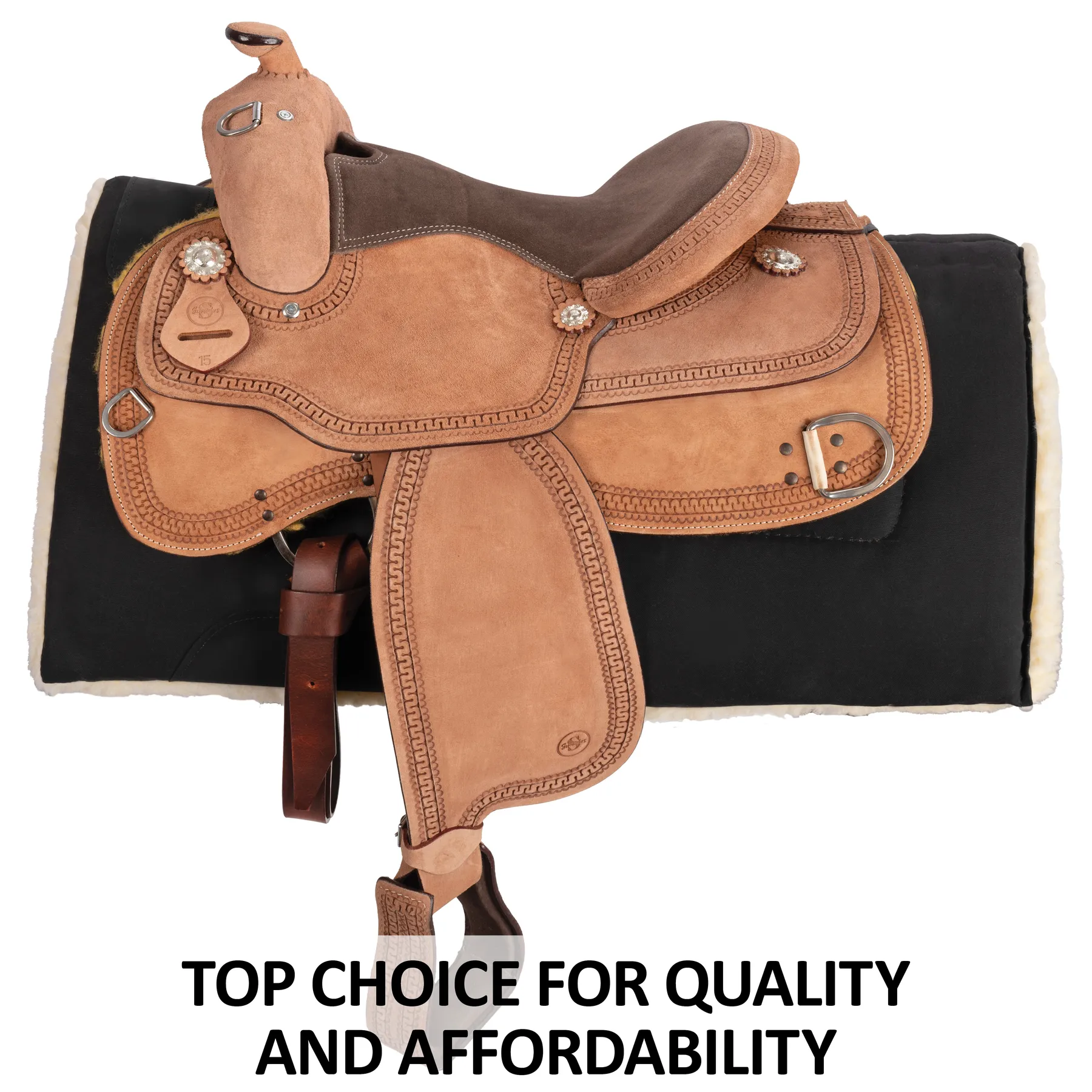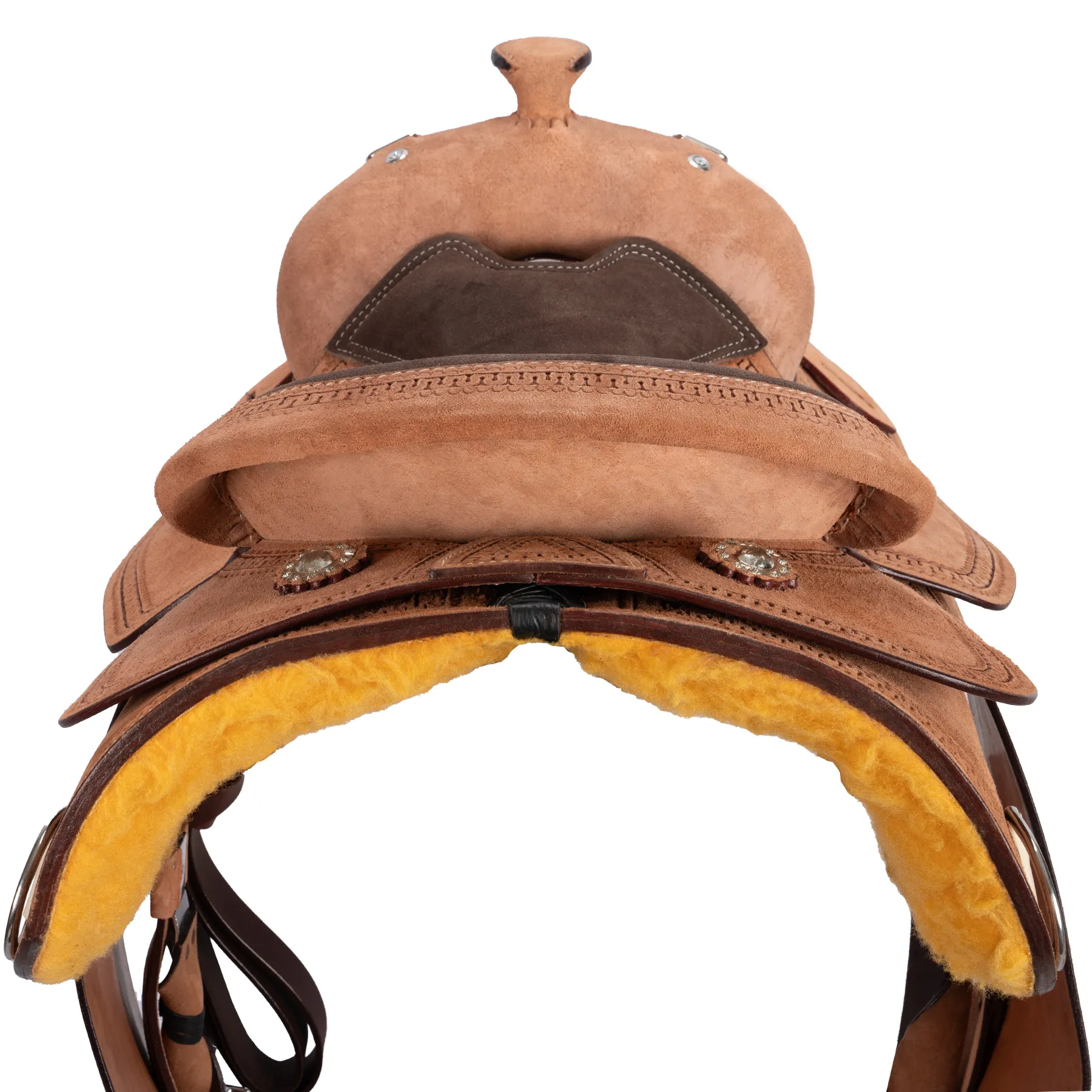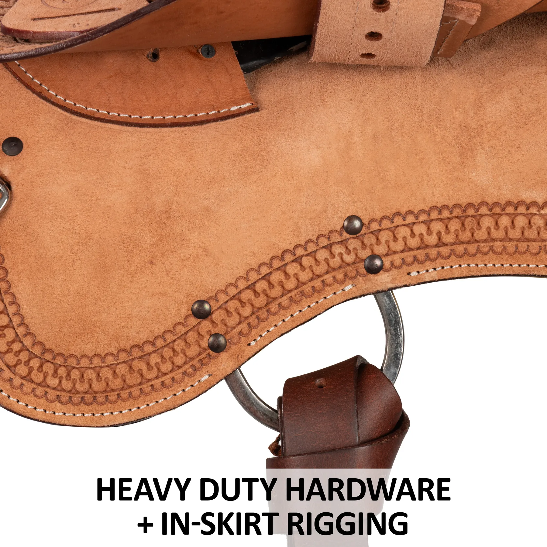 Perfectly blending superior quality and affordability, this western work saddle is designed with full horse bars to accommodate most conformations and a close contact feel for an optimal connection with your horse. It even features a total roughout design for added grip and security for training rides or ranch work. Plus, the saddle is made from a super lightweight injected-molded plastic tree and has a 5-year warranty.