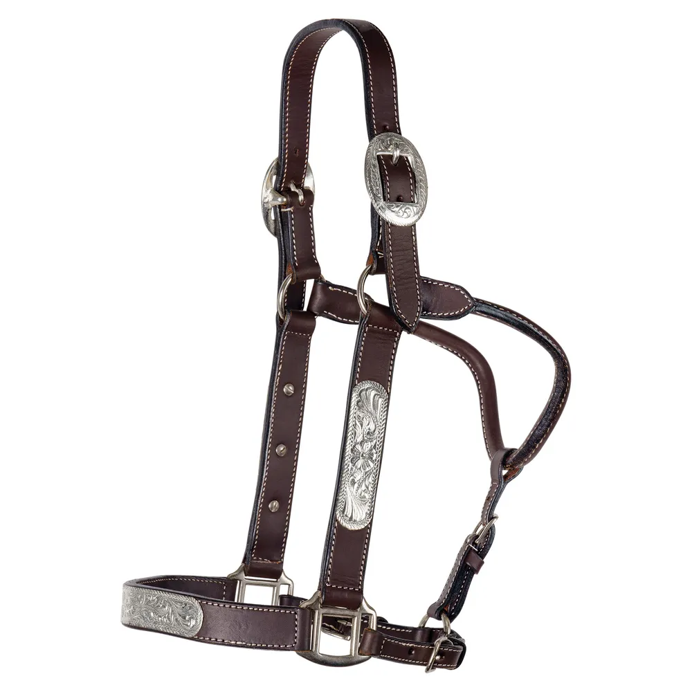 Enter the show ring in style with this starter show halter for the 4H or Open rider. It's crafted from high-quality Argentine leather with cream accent stitching and beautiful, hand-engraved silver plating over the nose and cheek. This halter is extremely adjustable and fits most head sizes for an elevated look. Not only is it of exceptional quality, but it's at an unbeatable price.