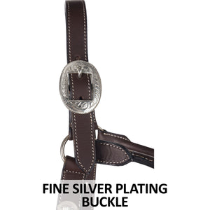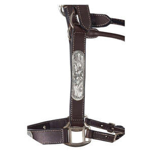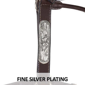 The hand-engraved silver plating over the nose and cheeks creates a stand-out look for the entry-level horseman. The cheek buckle measures 2" tall x 1 3/4" wide.