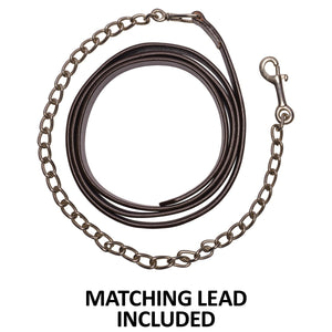 This halter includes a matching 1" wide x 6' leather show lead with a 30" chrome-plated lead.