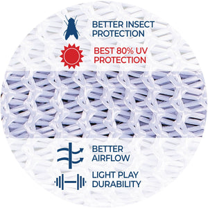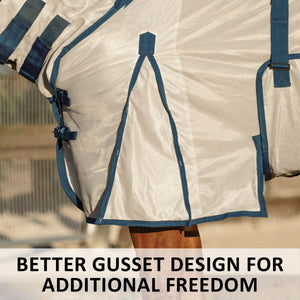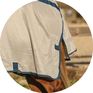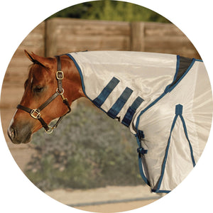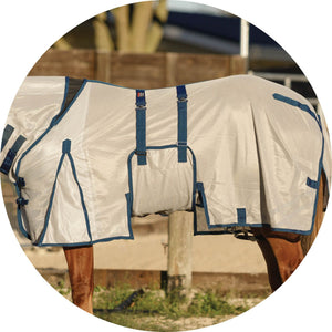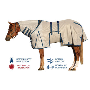 The Soft Interlock Mesh Attached Neck Euro Bellyband Leg Shield Horse This sheet offers your horse the best UV protection. It's constructed with a 300D soft and comfortable polyester mesh material with an 80% UV protection rating. It allows for ample airflow for those horses that live in warm climates and insect protection against small to medium-sized insects, such as gnats and flies. So, if you're looking for a fly sheet to protect your horse from damaging UV rays, this fly sheet is perfect!