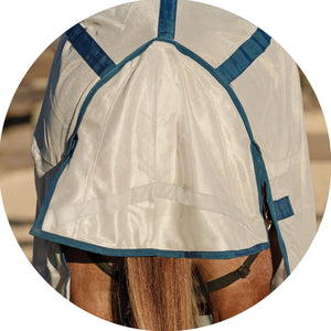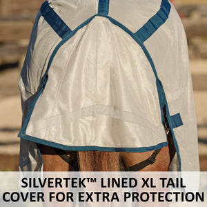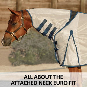 Our Attached Neck Euro fly sheets fit straight from the withers through the back for a comfortable fit for ALL breeds with the innovative SilverTek™ antibacterial nylon lining. The attached neck connects to the sheet with a stretchy lycra that allows your horse to put their head down to graze comfortably. It also prevents the sheet from slipping forward, maintaining coverage no matter the conditions. With the Attached Neck Euro Fit, your horse will be protected from ears to tail.