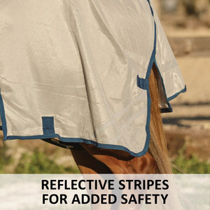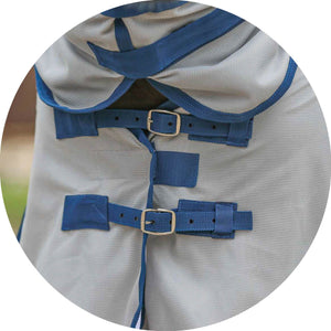 When looking for the best UV protection for your horse, look no further than this fly sheet. The extended leg panels, attached neck, and bellyband closure offer additional insect and UV protection to protect your horse. These sheets are made from a soft and comfortable 300D polyester interlock mesh material offering an impressive 80% UV protection level and the best protection against small to medium-sized insects, like gnats and flies. Plus, it features NEW reflective stripes for safety and SilverTek® technology with antibacterial nylon lining on the chest, shoulders, and tail flap.