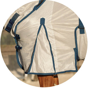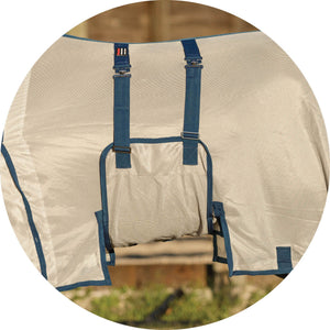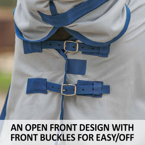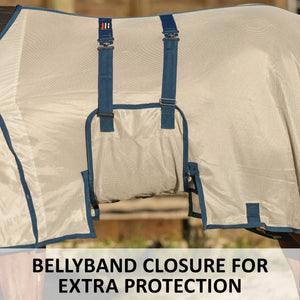 The bellyband closure option protects from flies and midges biting along the sensitive underbelly. Chrome-plated hardware is positioned to avoid rubbing or poking while your horse is lying down, and the t-post hardware on the bellyband closure includes locking bands and incorporates elastic inserts for more give as the horse moves since the proper fit is with the bellyband snug and flush to the belly.