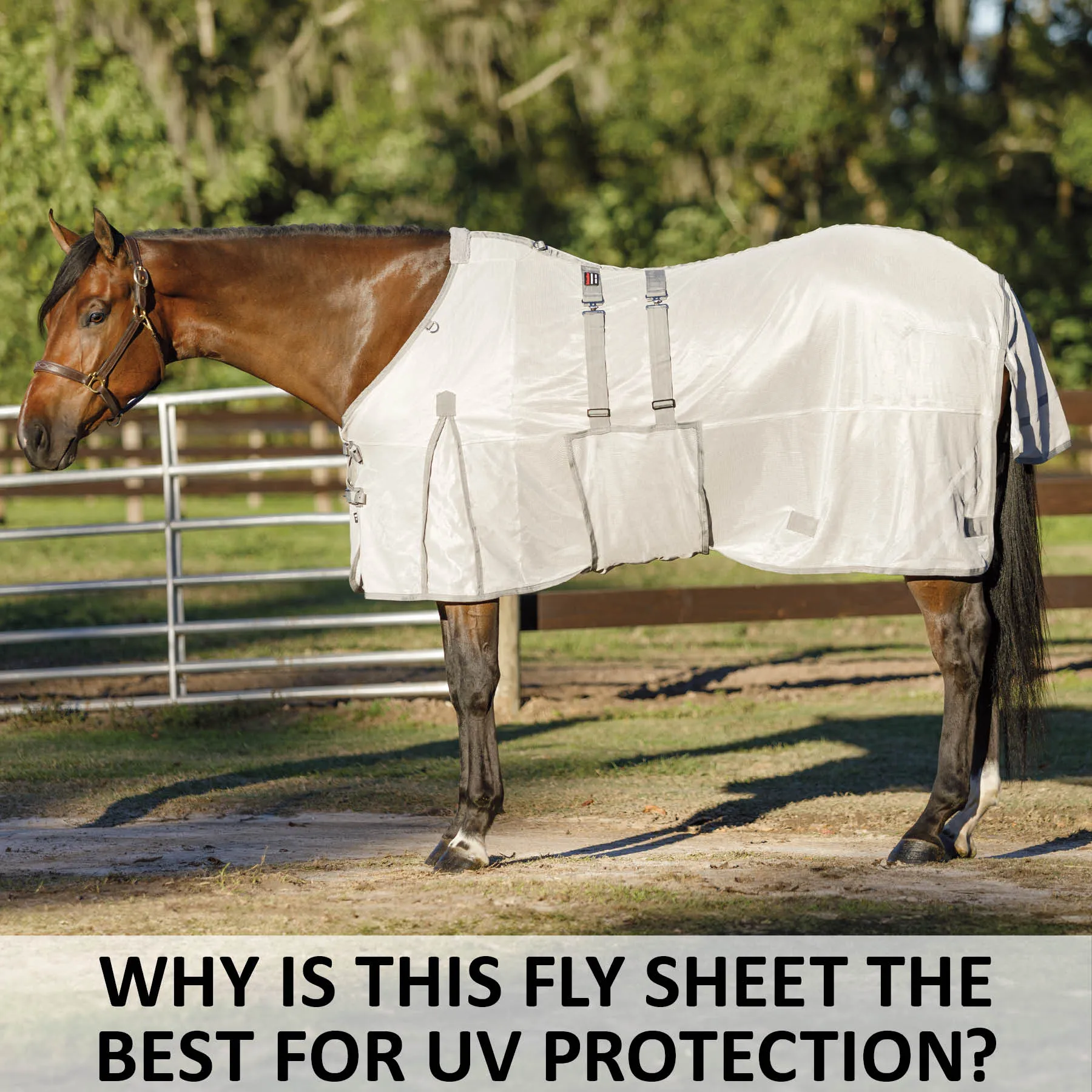 When looking for the best UV protection for your horse, look no further than this fly sheet. This sheet is designed in our Euro fit that's comfortable for all breeds and has a bellyband closure for extra protection from biting insects. These sheets are made from a soft and comfortable 300D polyester interlock mesh material offering an impressive 80% UV protection level and the best protection against small to medium-sized insects, like gnats and flies. Plus, it features NEW reflective stripes for safety and SilverTek® technology with antibacterial nylon lining on the chest, shoulders, and tail flap.