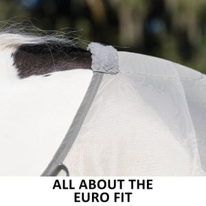 Our Euro fly sheets fit straight from the withers through the back that’s designed to drape comfortably and adapts to most breeds and conformations. The sheet comes up 4–6 inches onto the mane, fully covering the shoulders and withers. The Euro fly sheets also have extra comfortable fleece at the withers to prevent rubbing.
