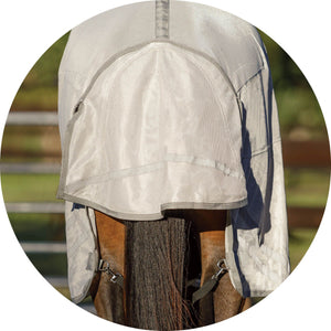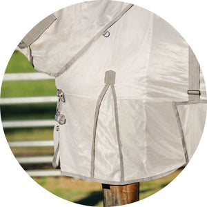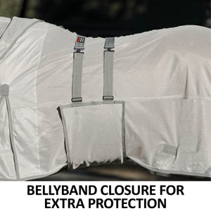 The bellyband closure option protects from flies and midges biting along the sensitive underbelly. Chrome-plated hardware is positioned to avoid rubbing or poking while your horse is lying down, and the t-post hardware on the bellyband closure includes locking bands and incorporates elastic inserts for more give as the horse moves since the proper fit is with the bellyband snug and flush to the belly.