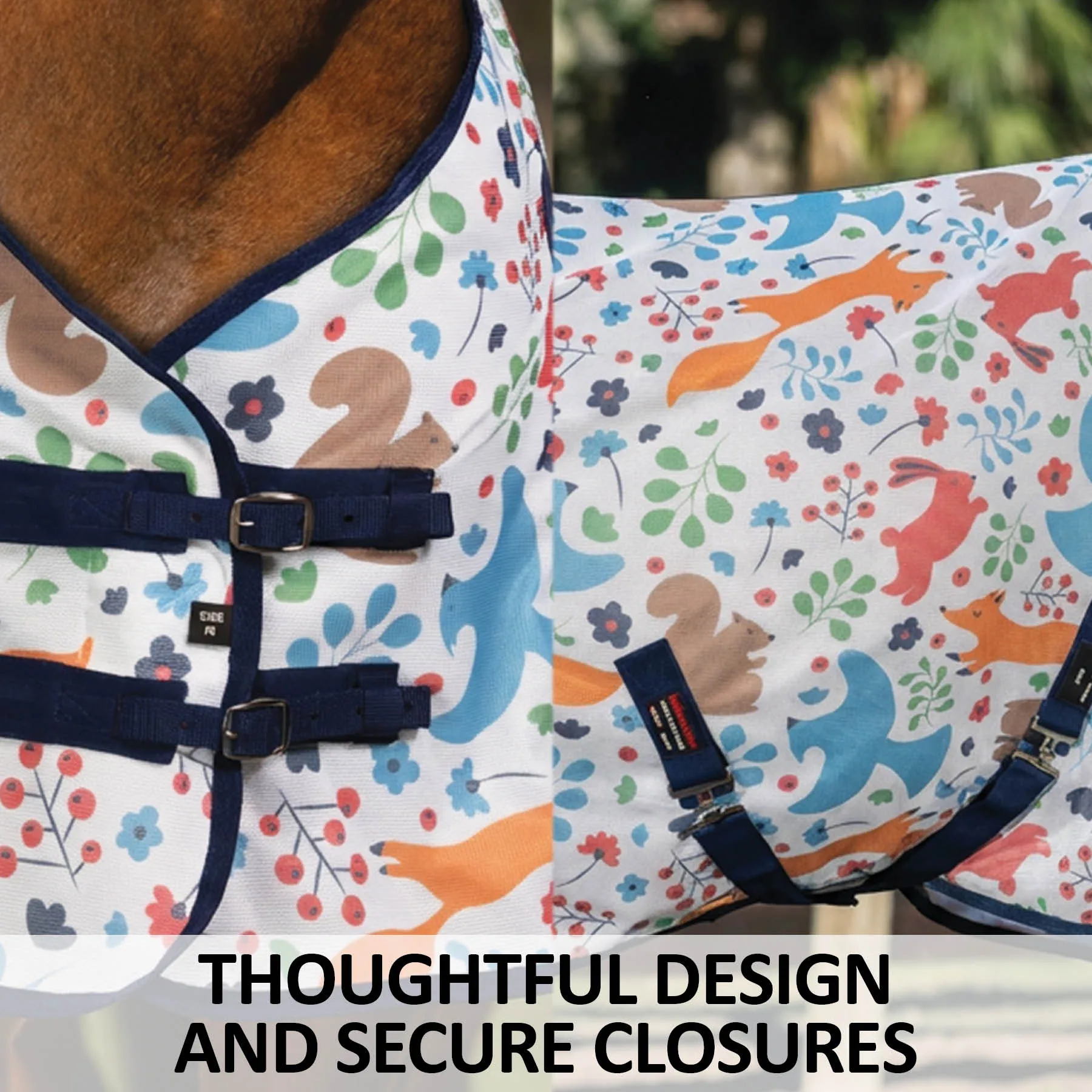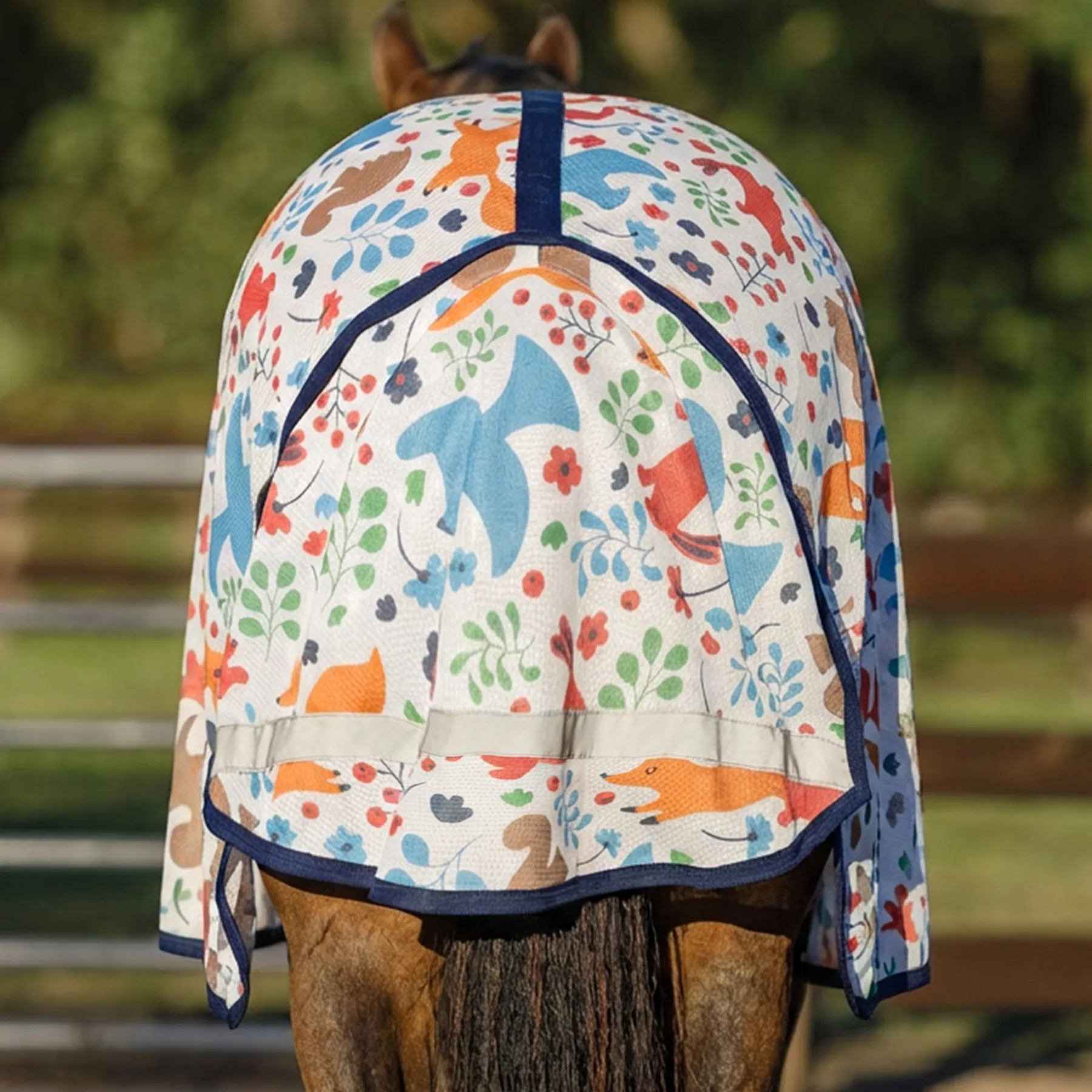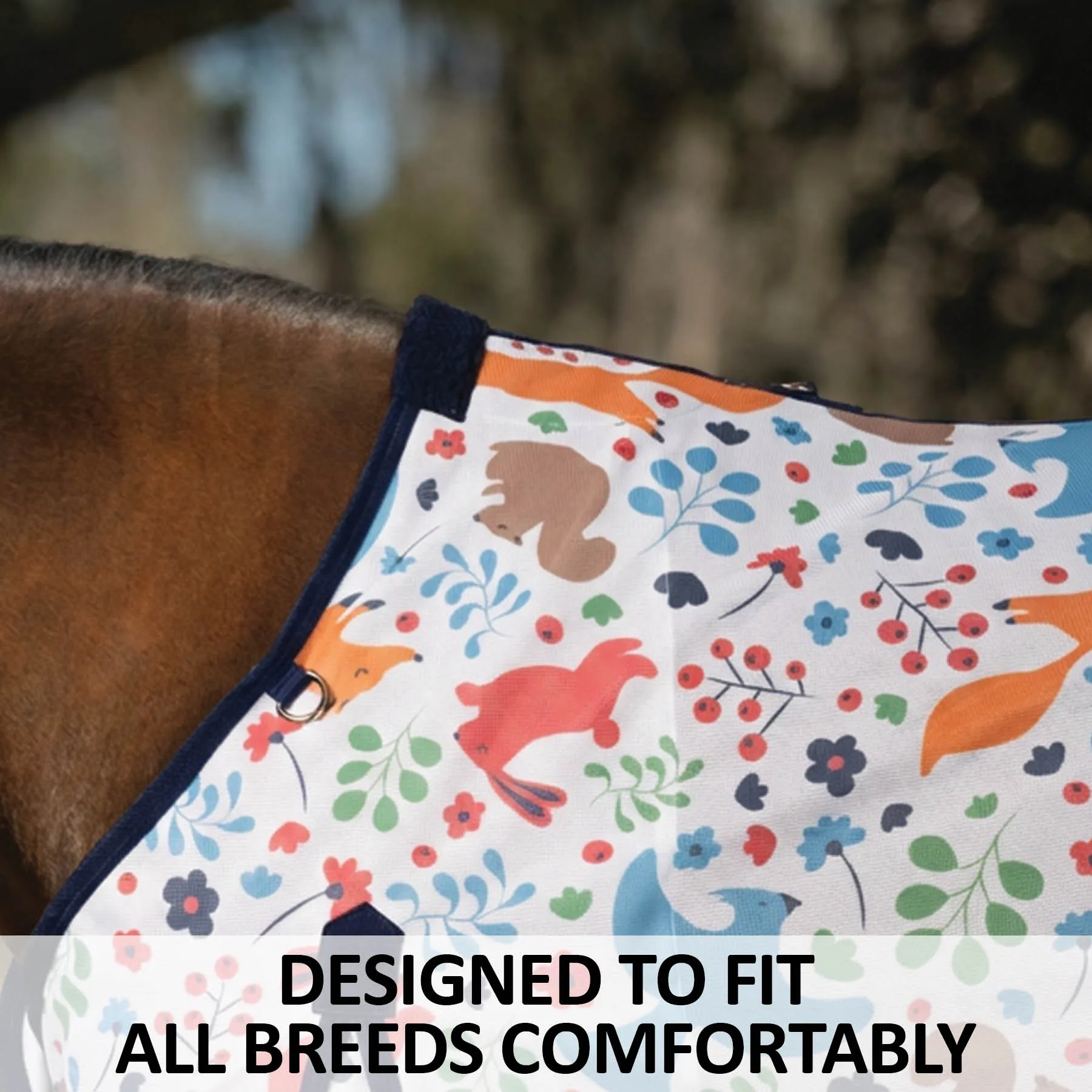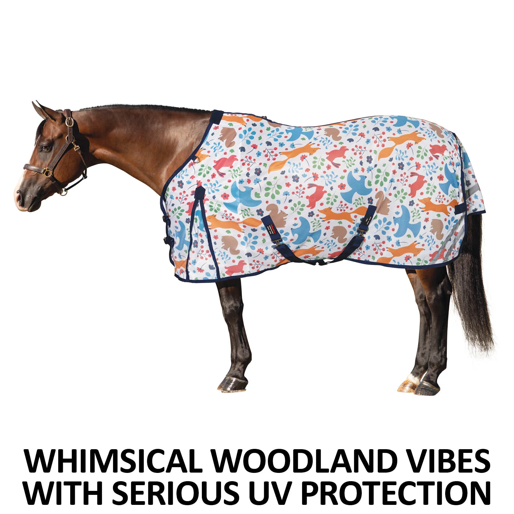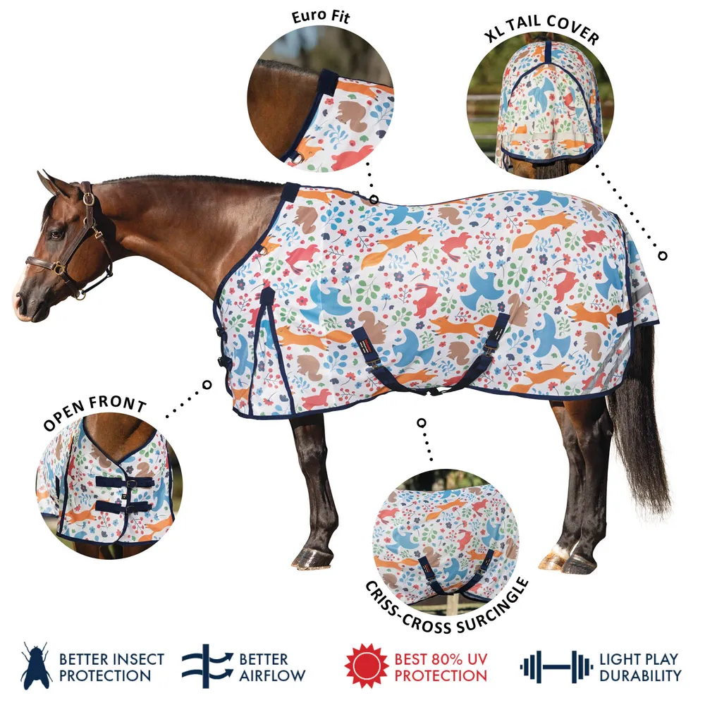 Bring a dose of charm to fly season with this playful woodland creature fly sheet, winner of our customer design survey and a fast favorite in the pasture. Beneath the adorable print lies a high-performance fly sheet that delivers serious protection. Crafted from breathable 300D interlock polyester mesh, it offers impressive 80% UV defense while shielding your horse from annoying gnats and flies. Designed with a comfortable Euro fit, reflective accents, and all the thoughtful touches you expect from Schneiders®, it keeps your horse cool, covered, and turning heads all summer long.
