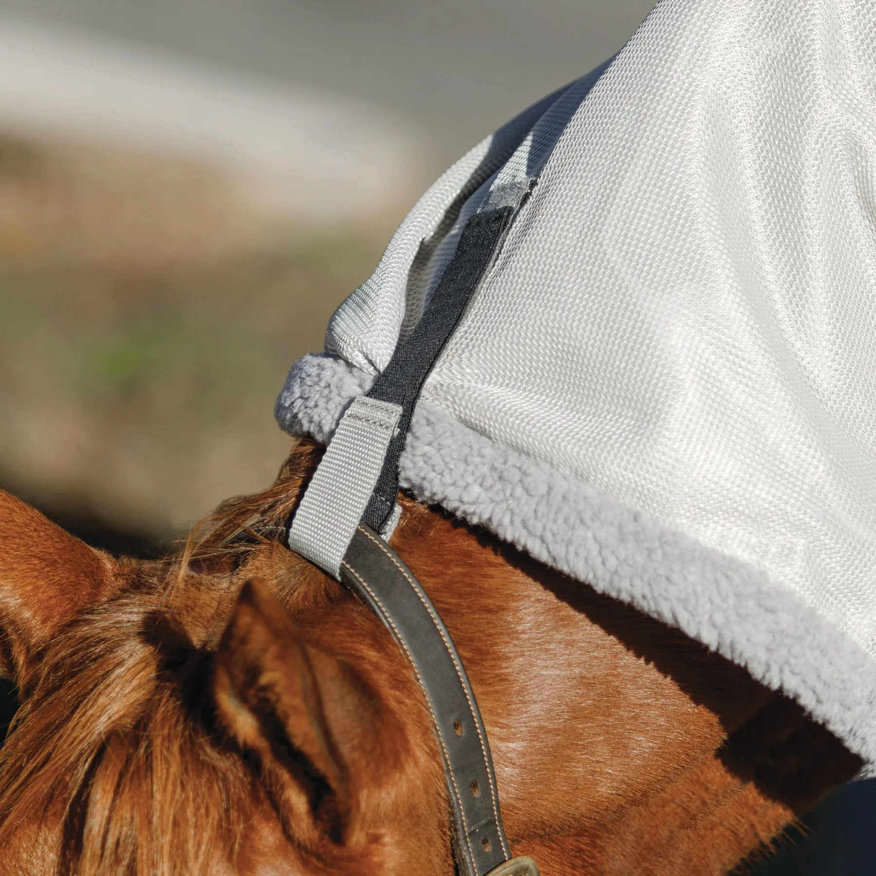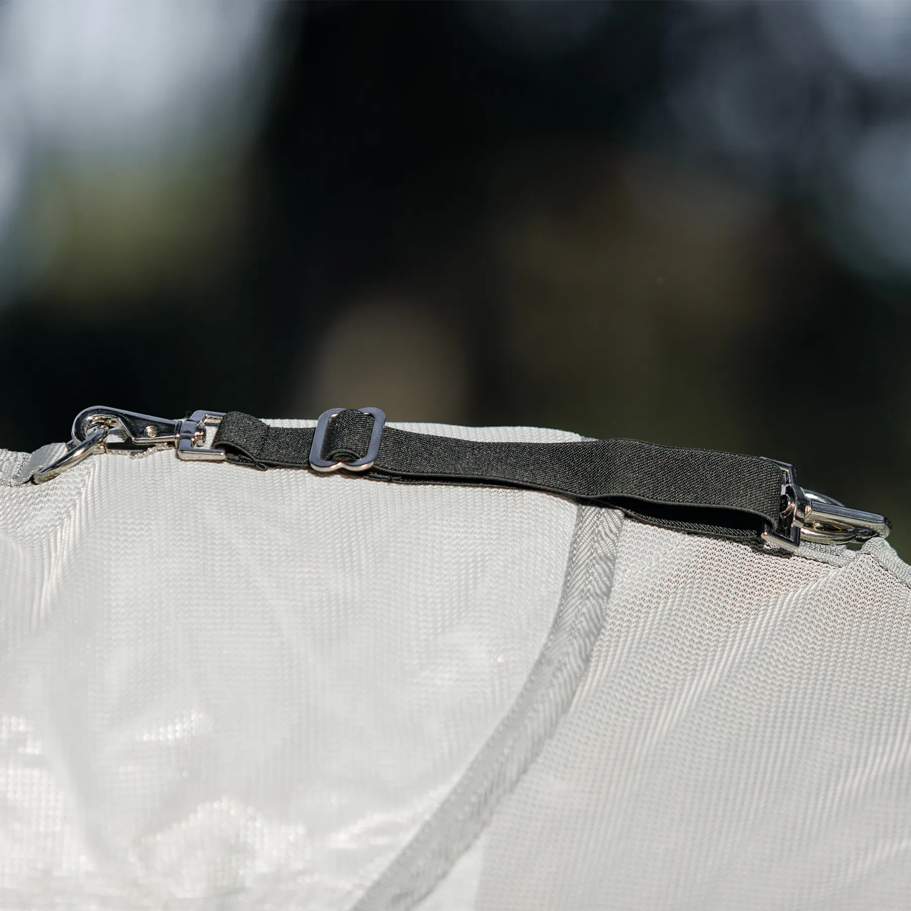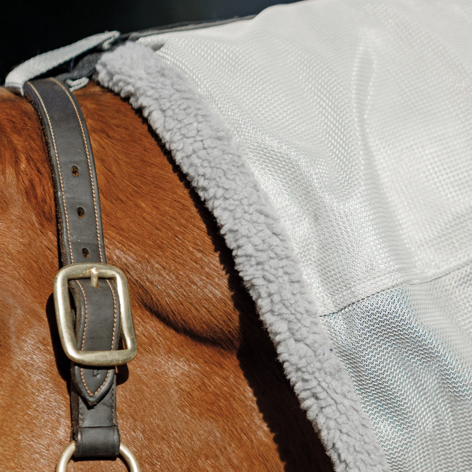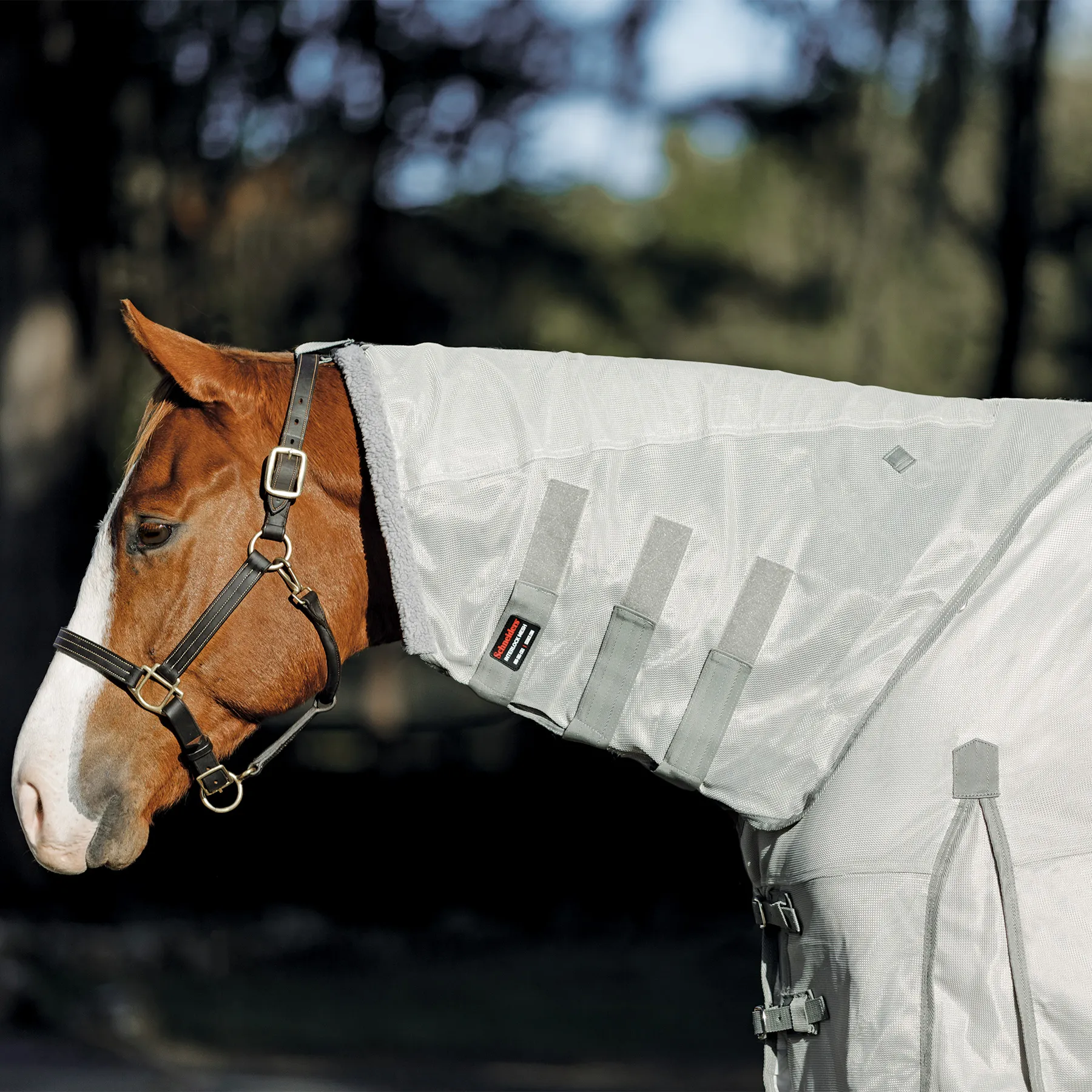 Soft and opaque, this fly sheet neck cover delivers outstanding 80% UV protection in a comfortable material. It's made of 300D soft polyester mesh, so it stays cool and wicks away moisture, keeping your horse comfortable even in hot weather. This neck cover now features SilverTek™ silver thread lining over the mane, which contains antibacterial properties that reduce odor and skin issues that can cause itching and irritation. SilverTek™ technology is tested to be 96% - 99% effective in killing bacteria - even after 20 washes. This neck cover prevents small to medium-sized insects from getting to your horse and easily attaches to the matching sheet with included carabiner clips and an elastic strap.