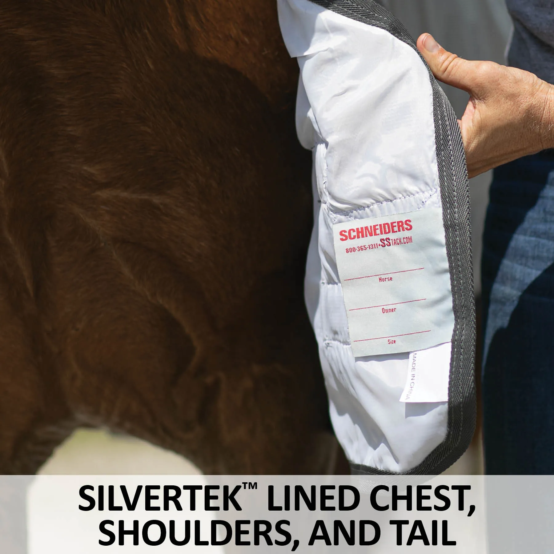 The most accurate and easiest way to determine your horse’s blanket size is to measure along the side of their body, from chest to tail. First, stand the horse square on a flat surface. Measure from the center of the chest, straight back to the very edge of the tail. Make sure to measure along the widest part of their shoulder and hindquarters. The number of inches measured in this way is your horse’s size. Look on the size chart for any Schneiders blanket for this number of inches to order your horse’s perfect size.