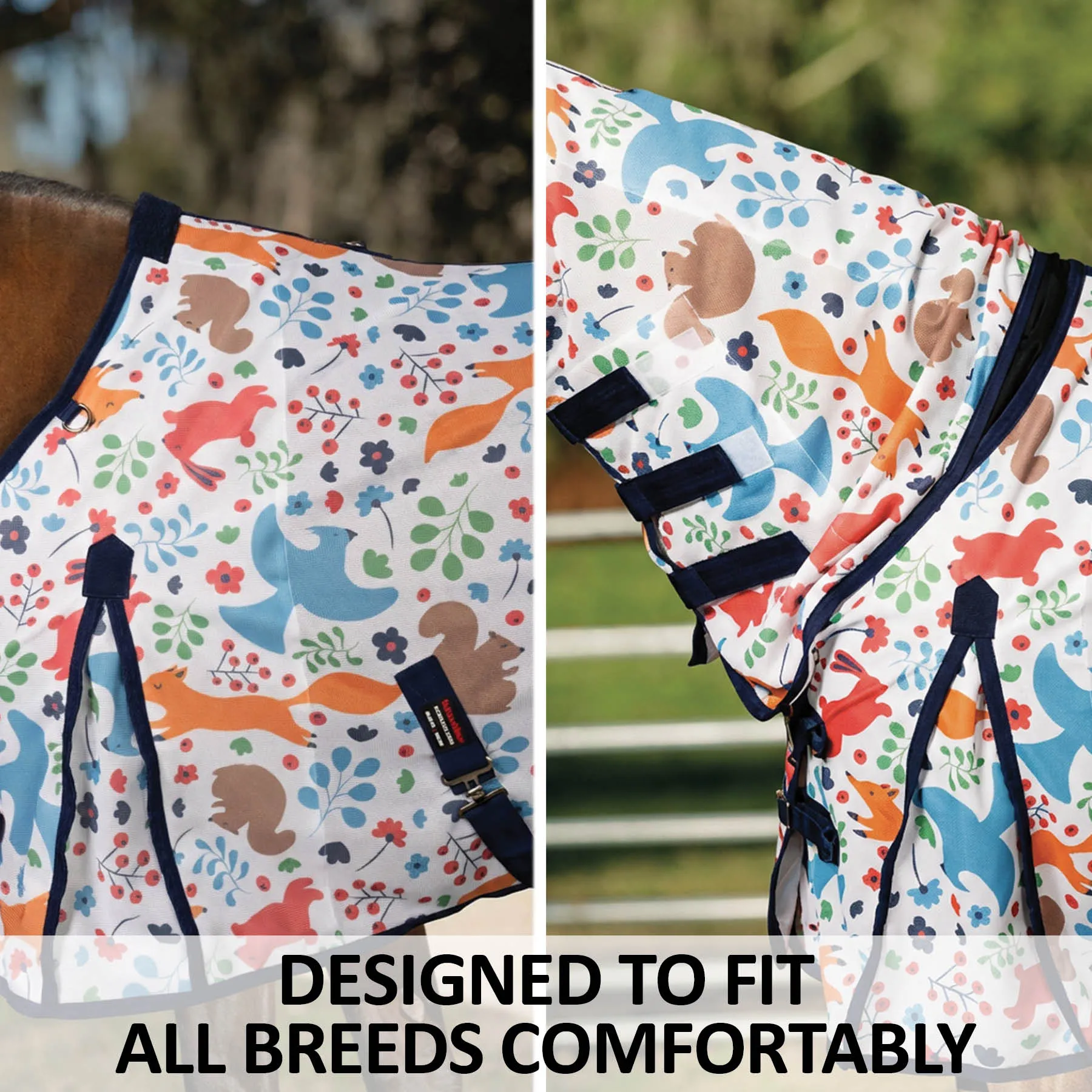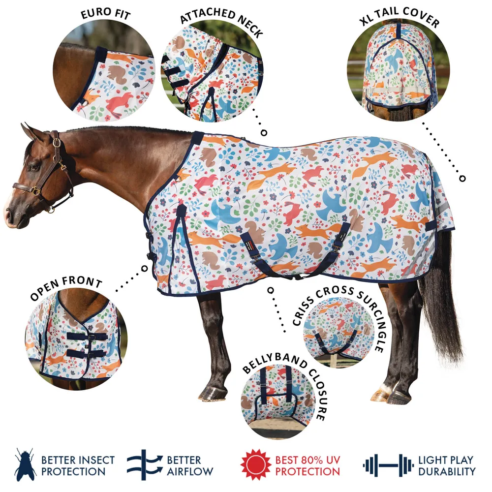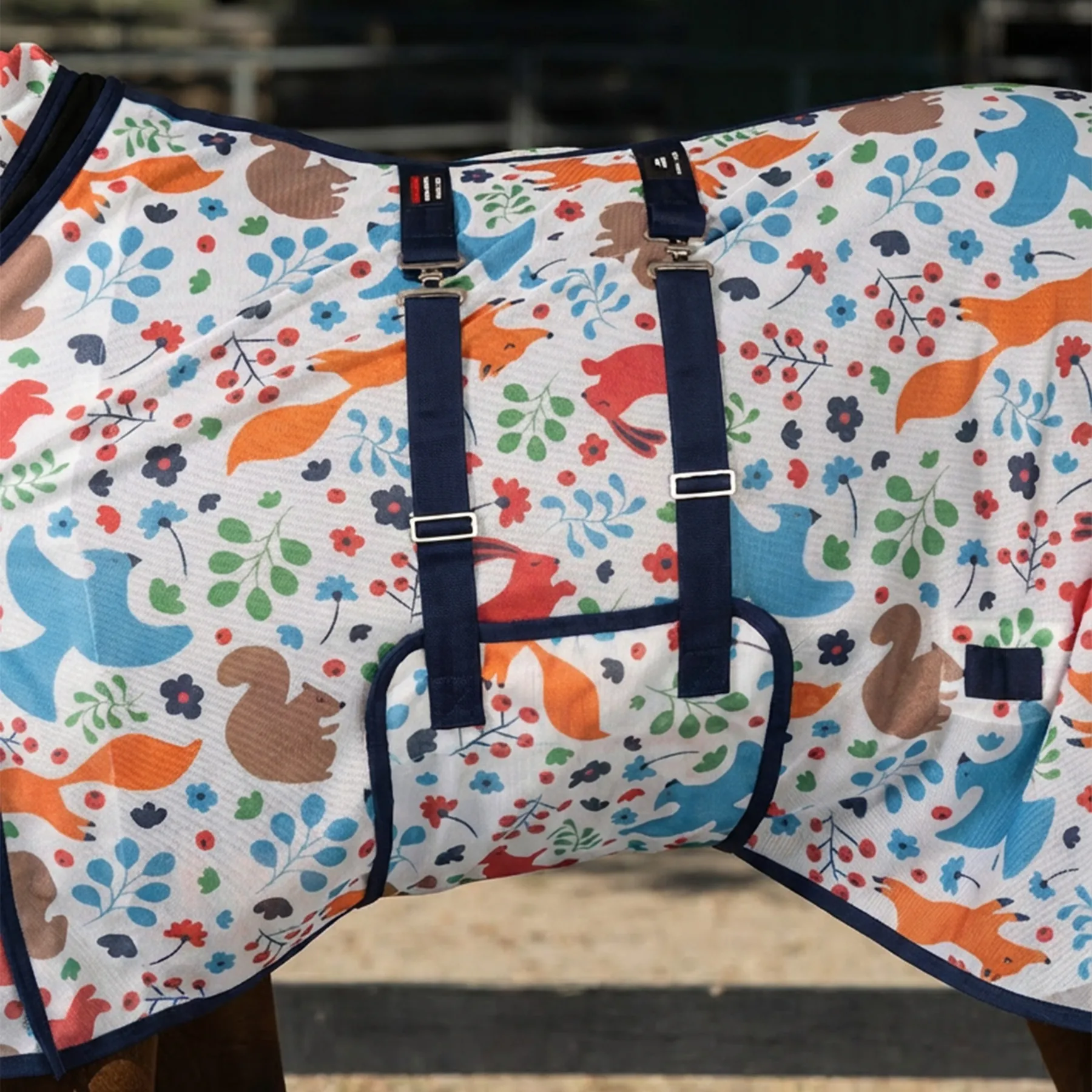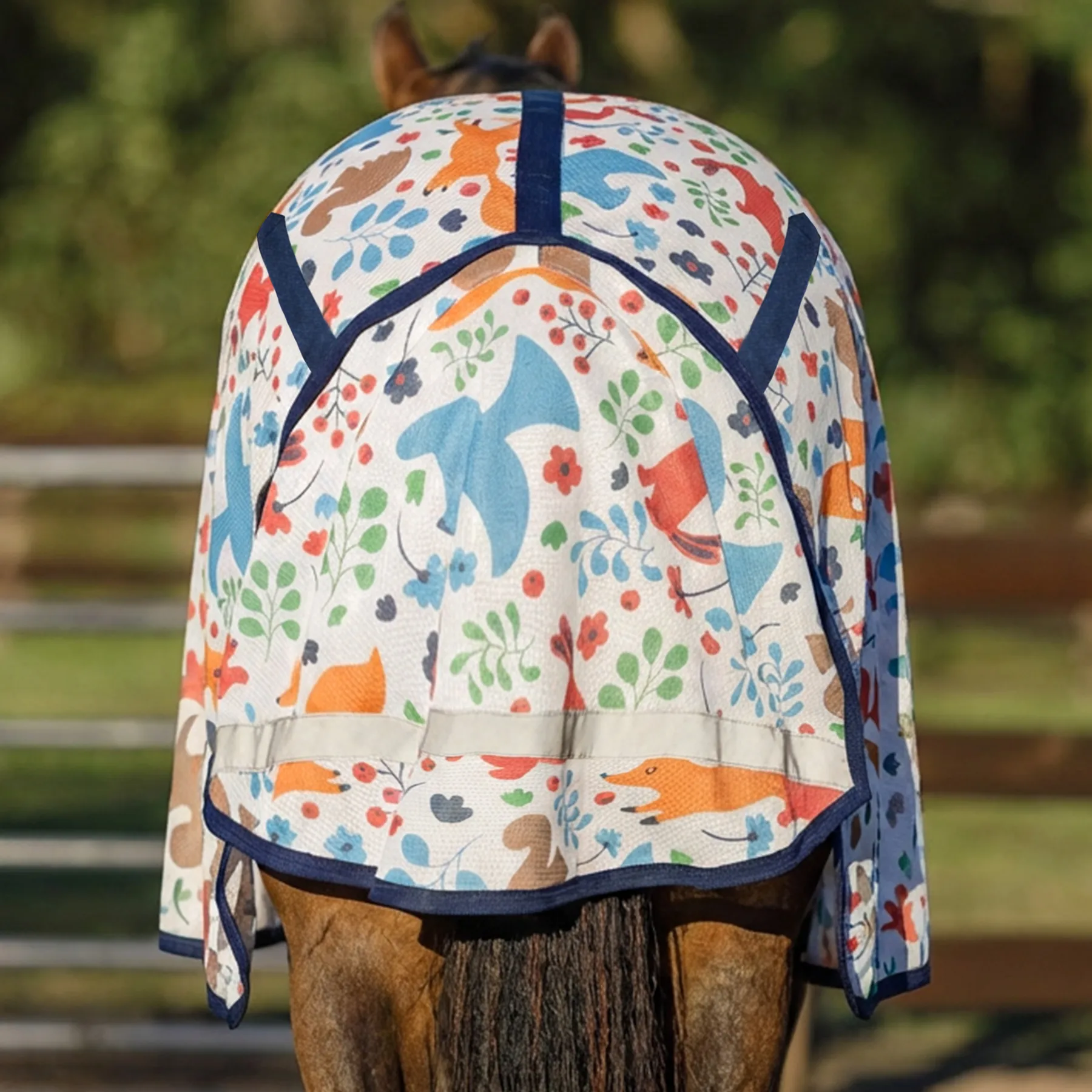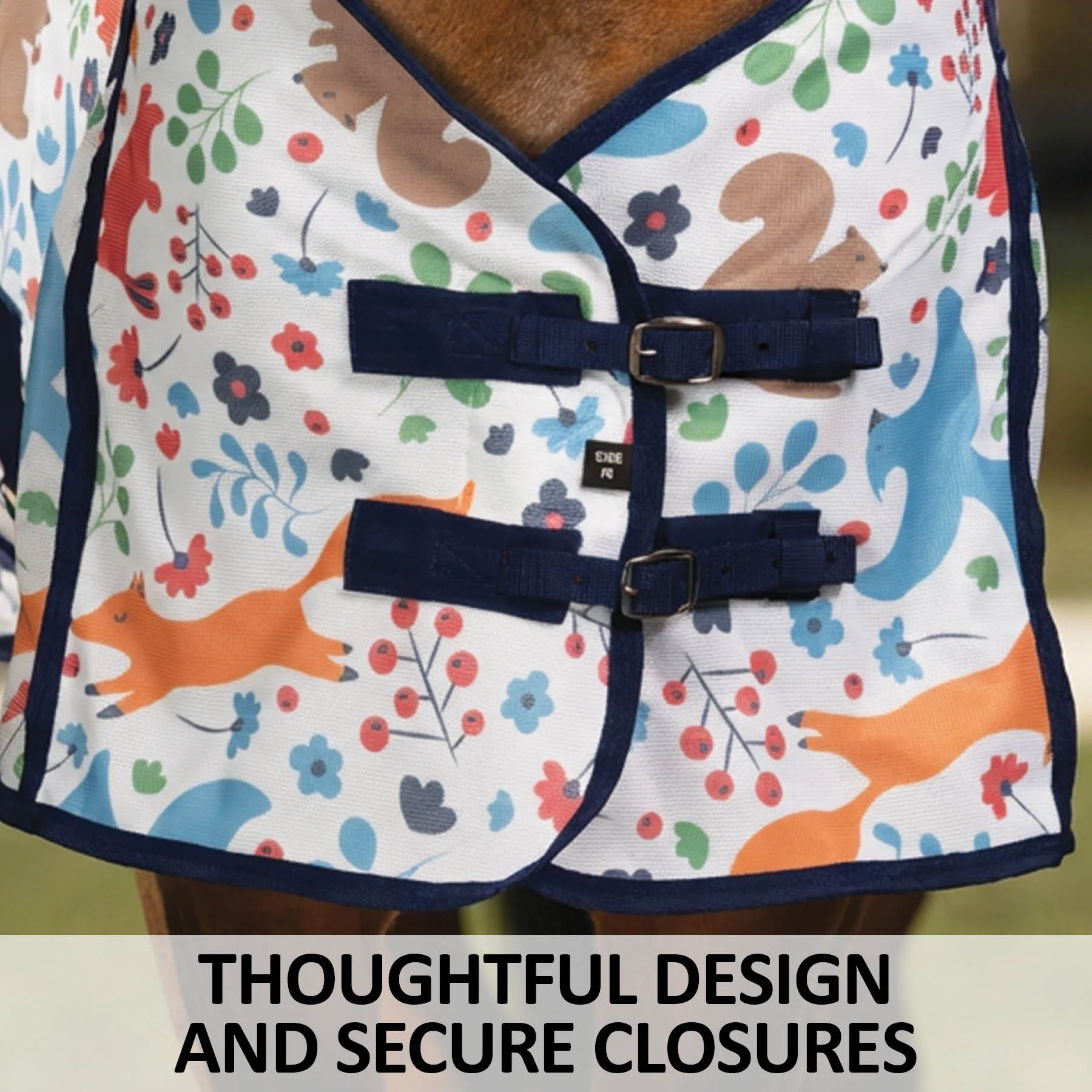 Turn heads and turn away pests with this whimsical woodland creature fly sheet that's more than just a pretty print. Designed for comfort, UV defense, and bug barrier brilliance, this fly sheet blends style and science. Its soft, breathable 300D polyester interlock mesh shields your horse from 80% of harmful UV rays and pesky gnats and flies, while the Euro fit comfortably contours to most breeds. With thoughtful touches like SilverTek® lining and reflective safety stripes, this fly sheet is a warm-weather essential.