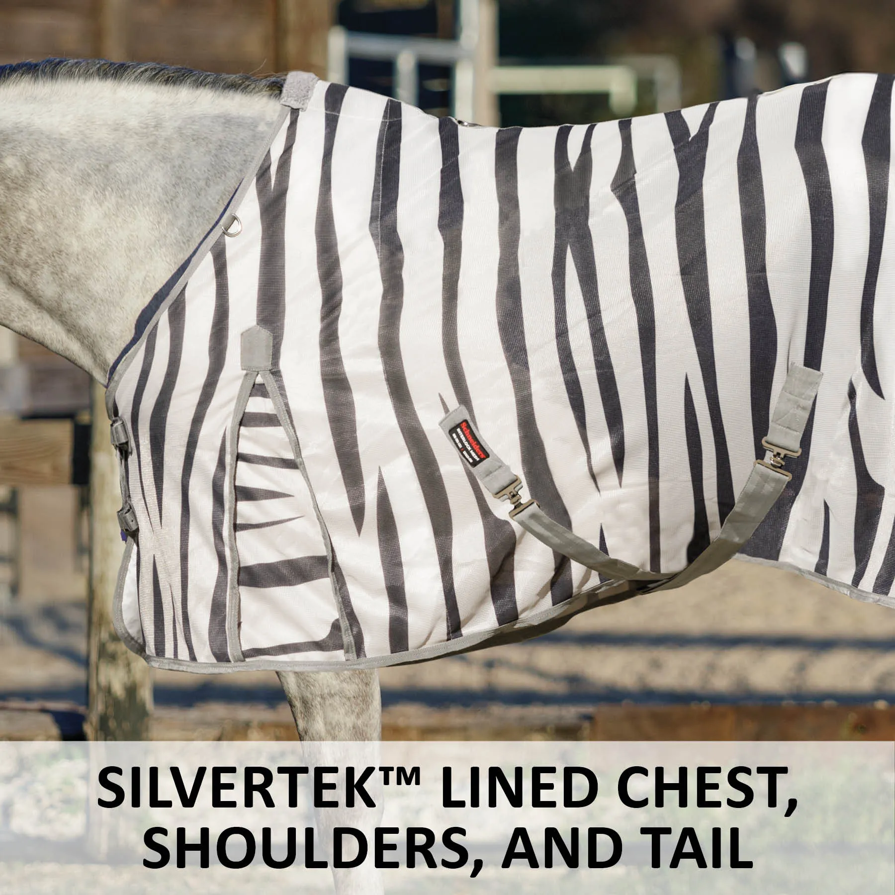 Bring out your horse's wild side with these Zebra Fly Sheets made with new reflective stripes and SilverTek™ technology on the chest, shoulders, and tail flap lining. Not only will your horse stand out with the amazing zebra pattern, but they'll be protected from harmful UV rays. The 300D soft and comfortable polyester mesh offers 80% UV protection, allows for airflow in moderate to warm climates, and has reliable insect protection from small to medium-sized biting insects, such as gnats and flies. It's available in our standard Euro Fit and Attached Neck Euro fit that conforms to all breeds. The zebra pattern is fun but also functional. Studies have shown that the zebra print deters flies from landing on your horse.