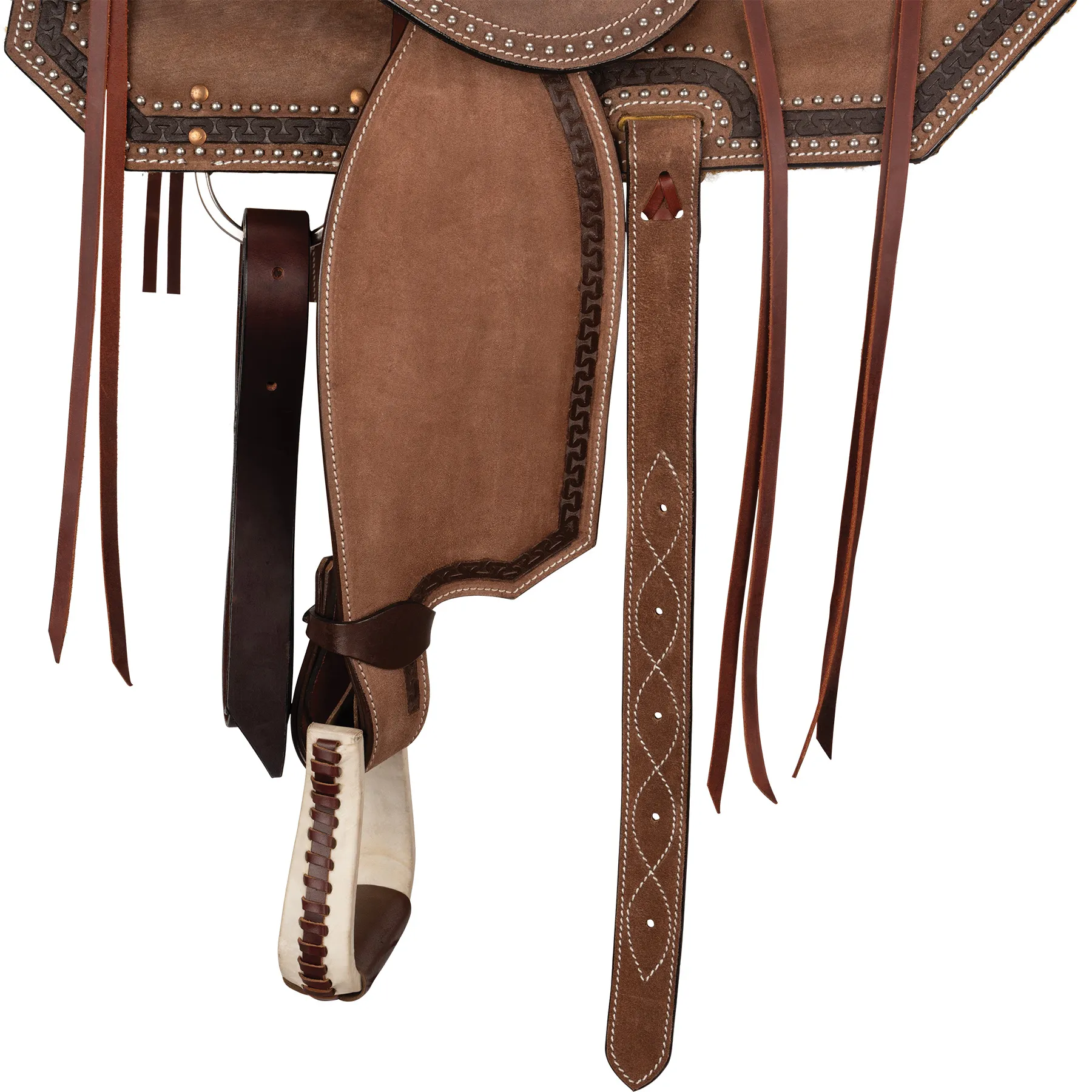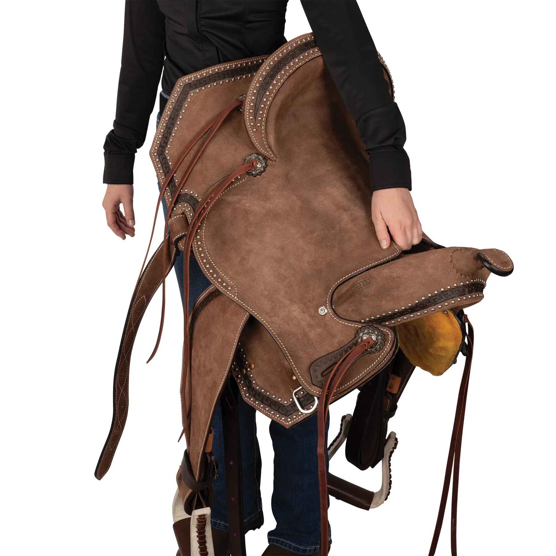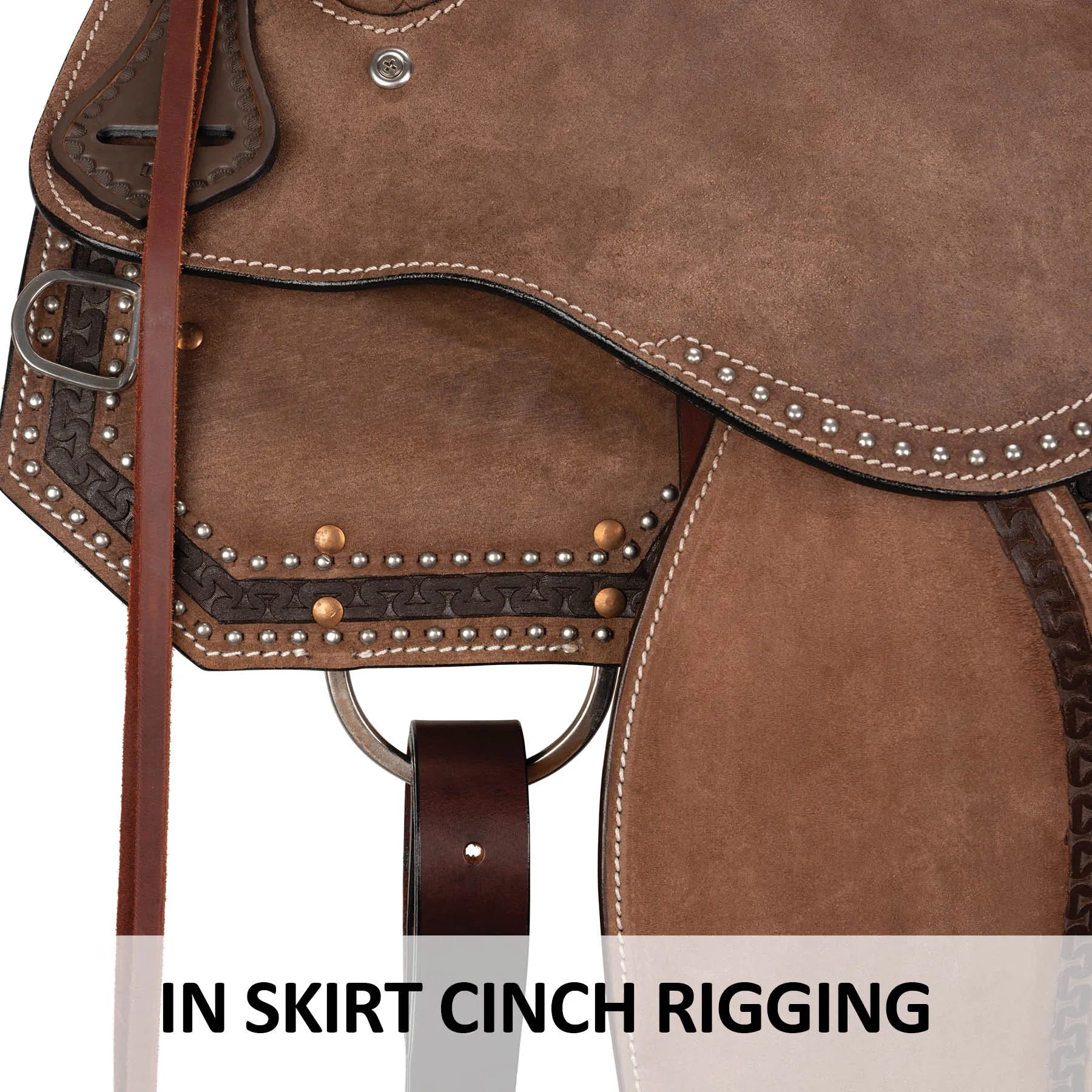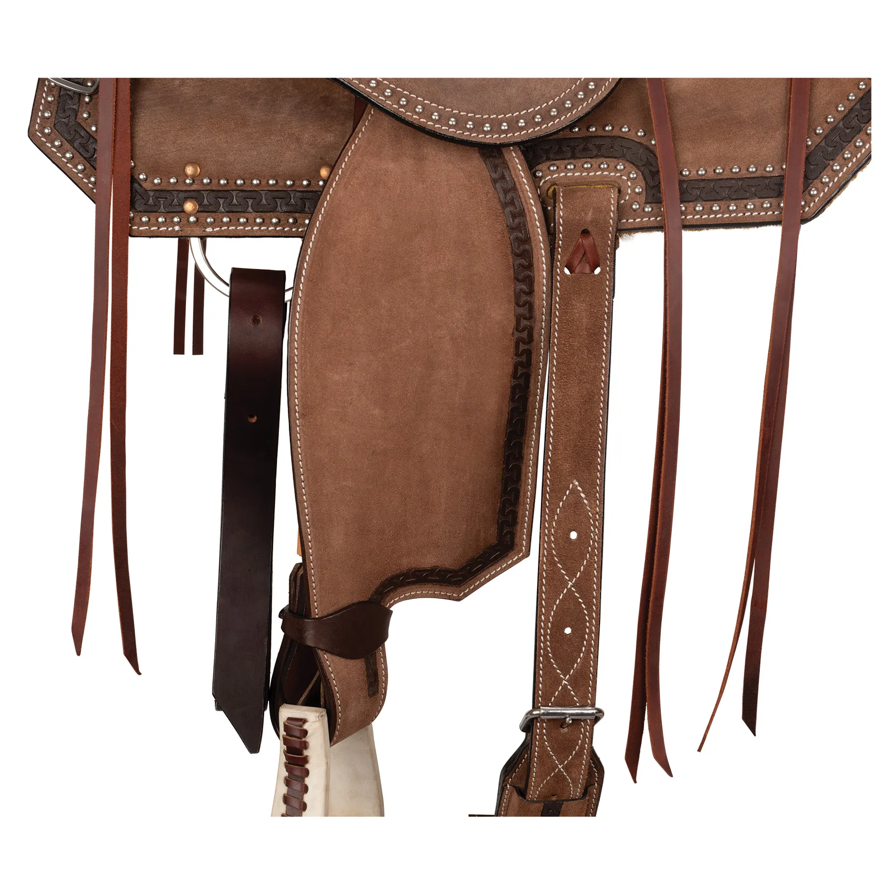 Race around the barrels in a western saddle designed for both functionality and fashion. This barrel saddle is a true classic, crafted from roughout leather, which provides exceptional grip and security for the deep seat. This saddle is rugged yet elegant, with a black leather running 'W' border outlined with studs. The cantle, pommel, and skirt are also studded for extra sophistication.