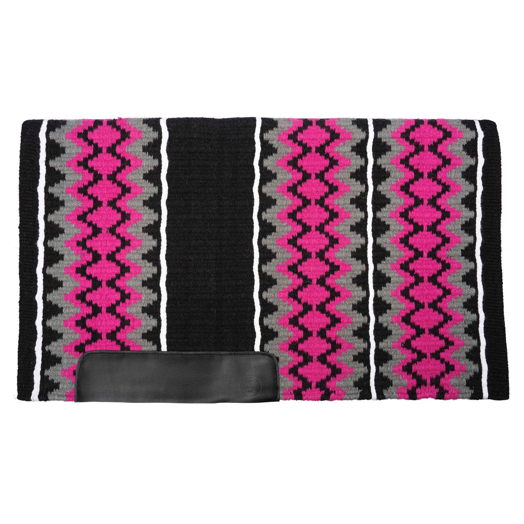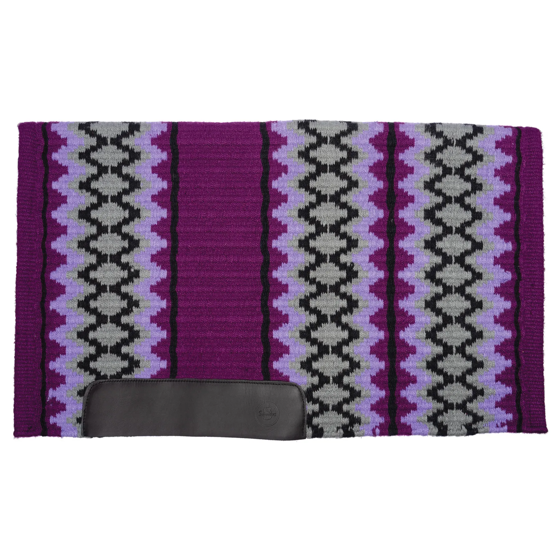 Make a bold impression in the show pen with this richly colored western show blanket, crafted from tightly woven New Zealand wool. Known for its strength, breathability, and moisture-wicking properties, this blanket not only adds style but also helps keep your horse comfortable in any weather. The vibrant red, purple, teal, and pink tones give you outfit flexibility, while black wear leathers protect your pad from cinch and fender wear.