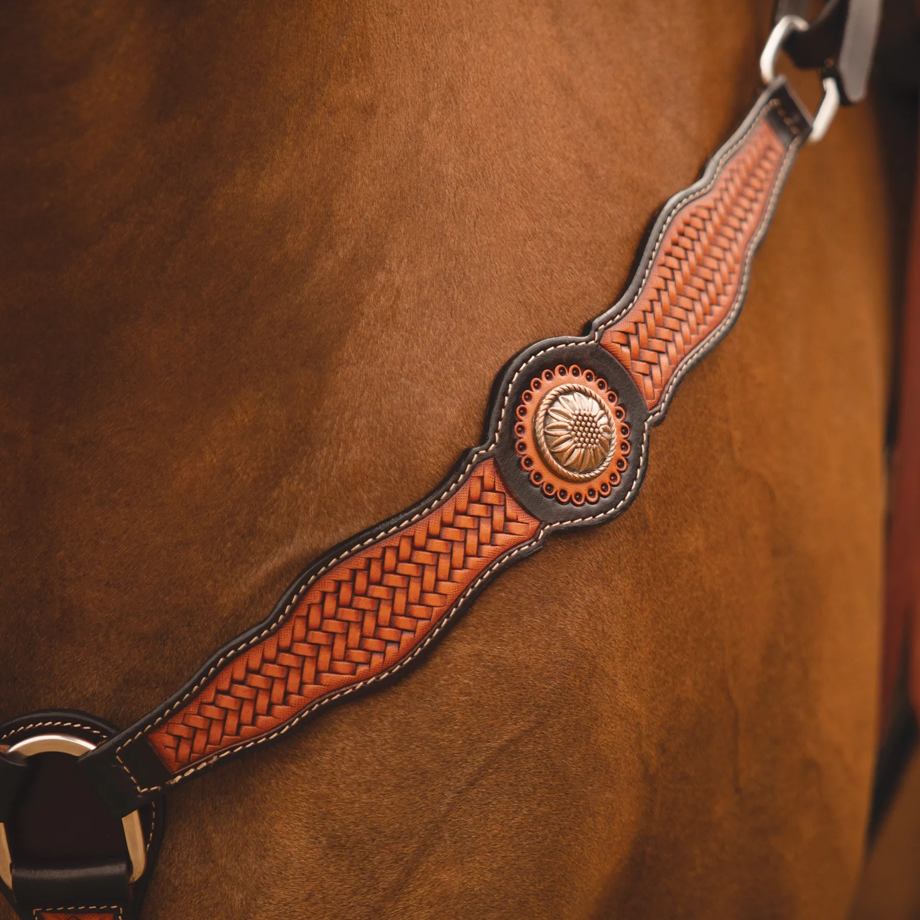 With a beautiful design and incredible functionality, this tooled concho western breast collar is a great addition to your Western tack. It has a basketweave and wave tooling, combined with daisy copper conchos, to show off your horse's style. Use it daily on the trail, in the ring, or any Performance Horse or Ranch class for a unique look. Not only is this breast collar a stunner, but it's incredibly functional, too; keeping your saddle or harness from sliding back.