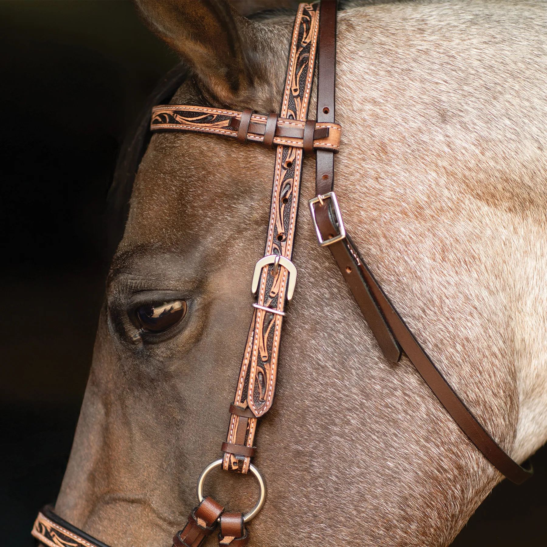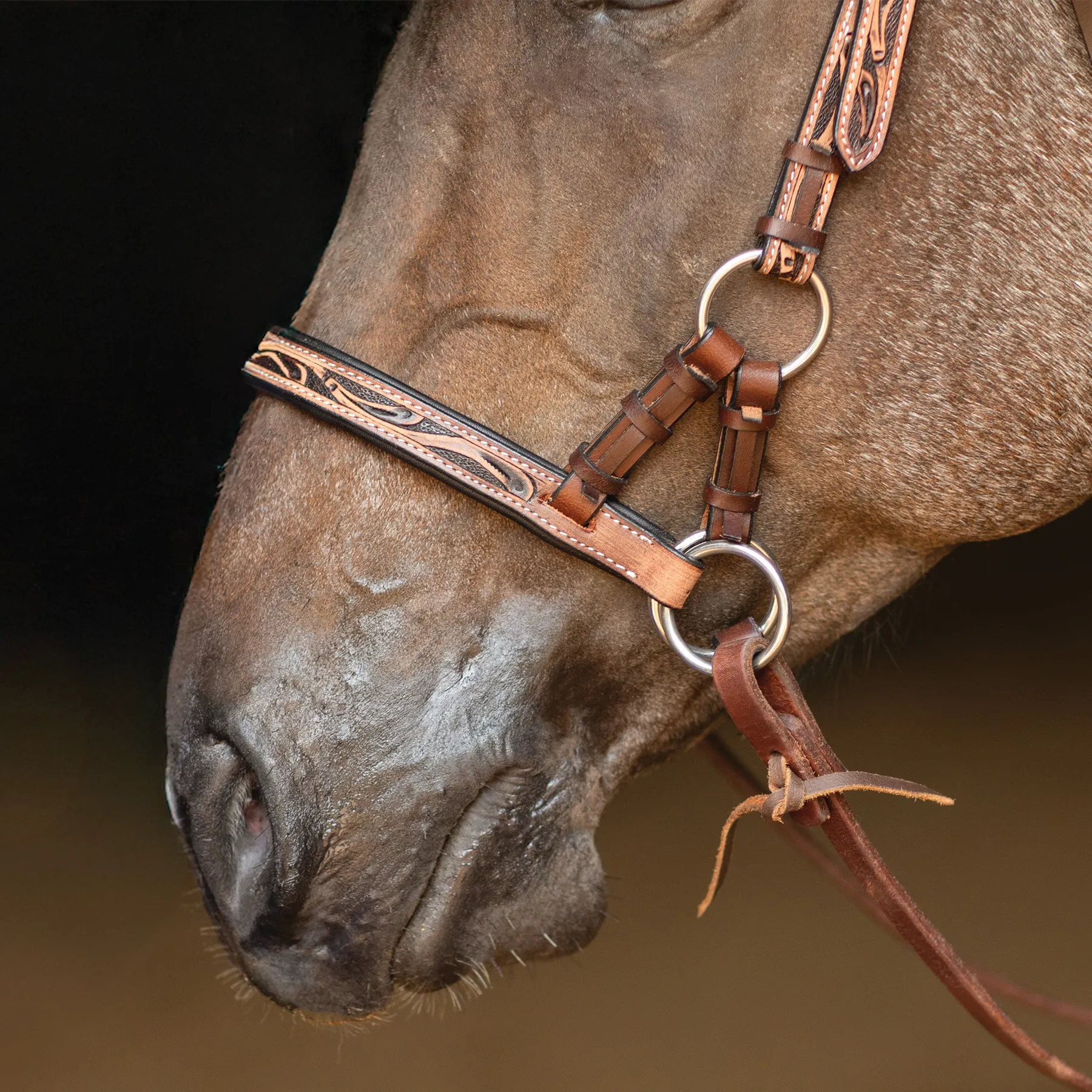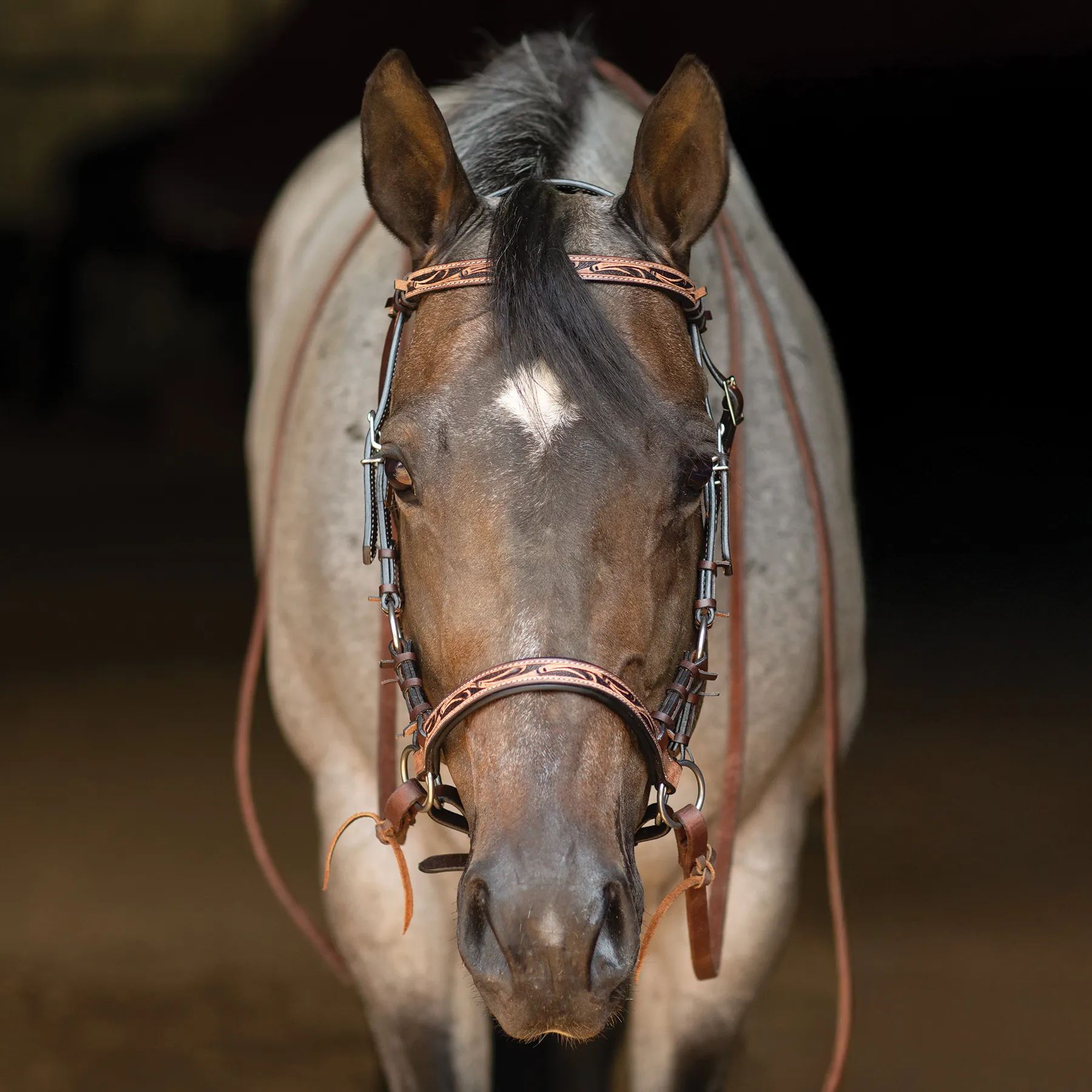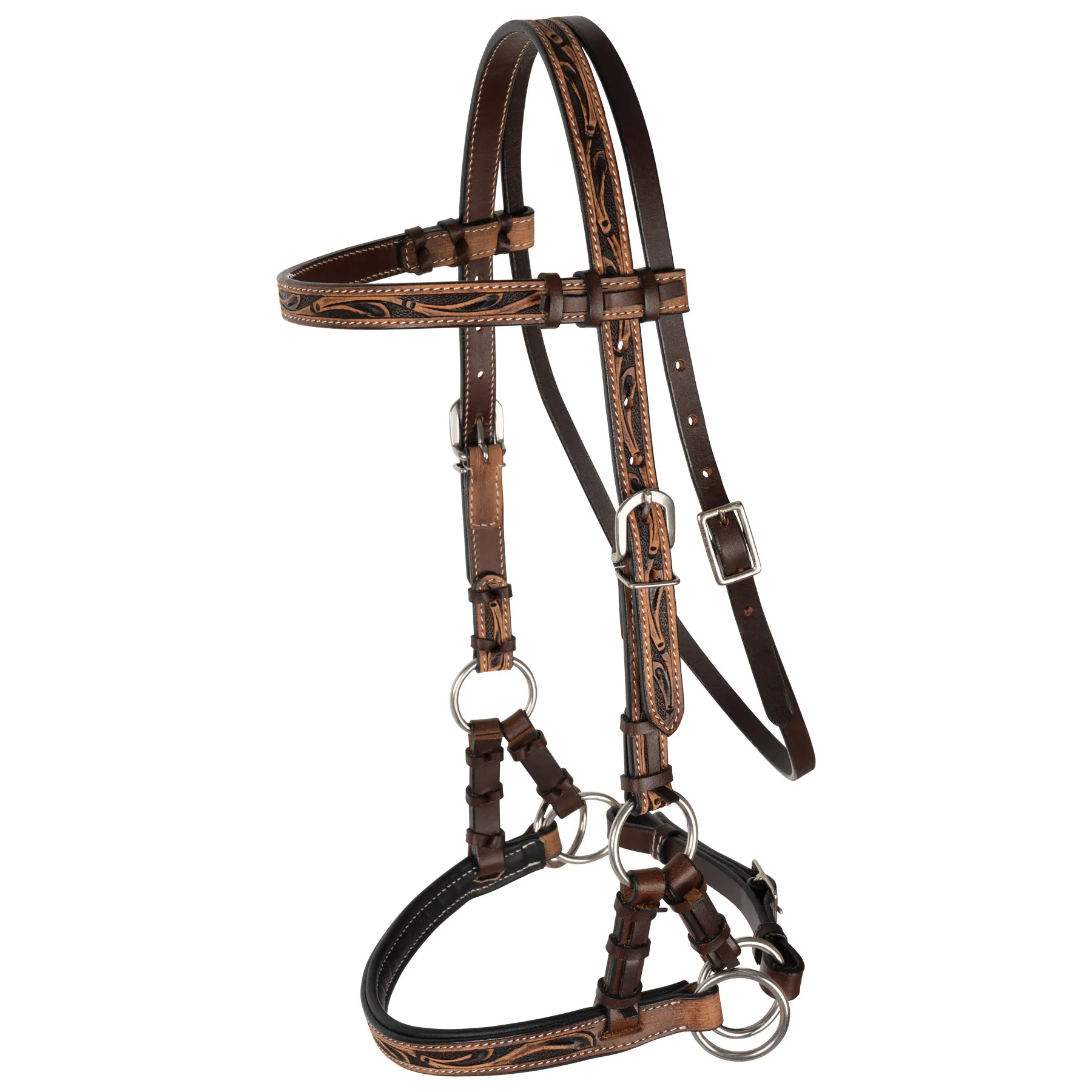 Ideal for young horses, sensitive mouths, or recovery situations, this tooled leather side pull bridle offers a gentle, bitless option for clear communication. Crafted from strong, supple Argentine leather with elegant tooling and contrast accents, it provides reliable pressure on the nose and cheeks instead of the mouth. Thoughtful design details like a padded noseband and stainless steel hardware make it both functional and stylish.