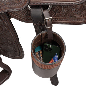 Whether you're on the trail or working hard in the saddle, our Tooled Leather Water Bottle and Snack Holder keeps your essentials close. Hand-tooled with a mix of basketweave and leaf patterns, this Argentine leather bag offers both style and function, perfect for holding a water bottle, phone, or snacks while you ride.