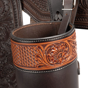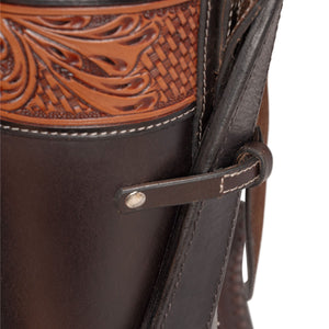- Hand tooled dark leather with basketweave and leaf detailing