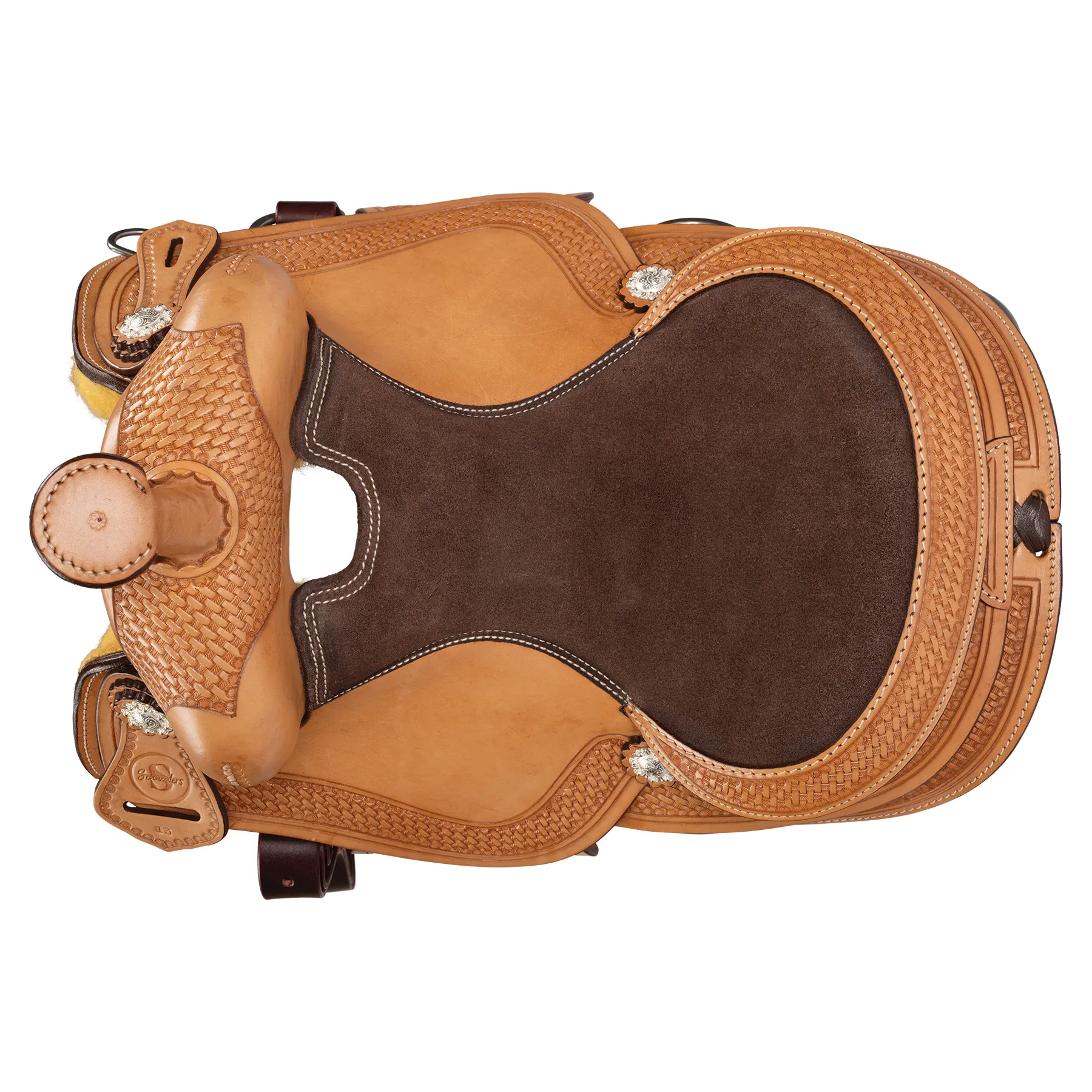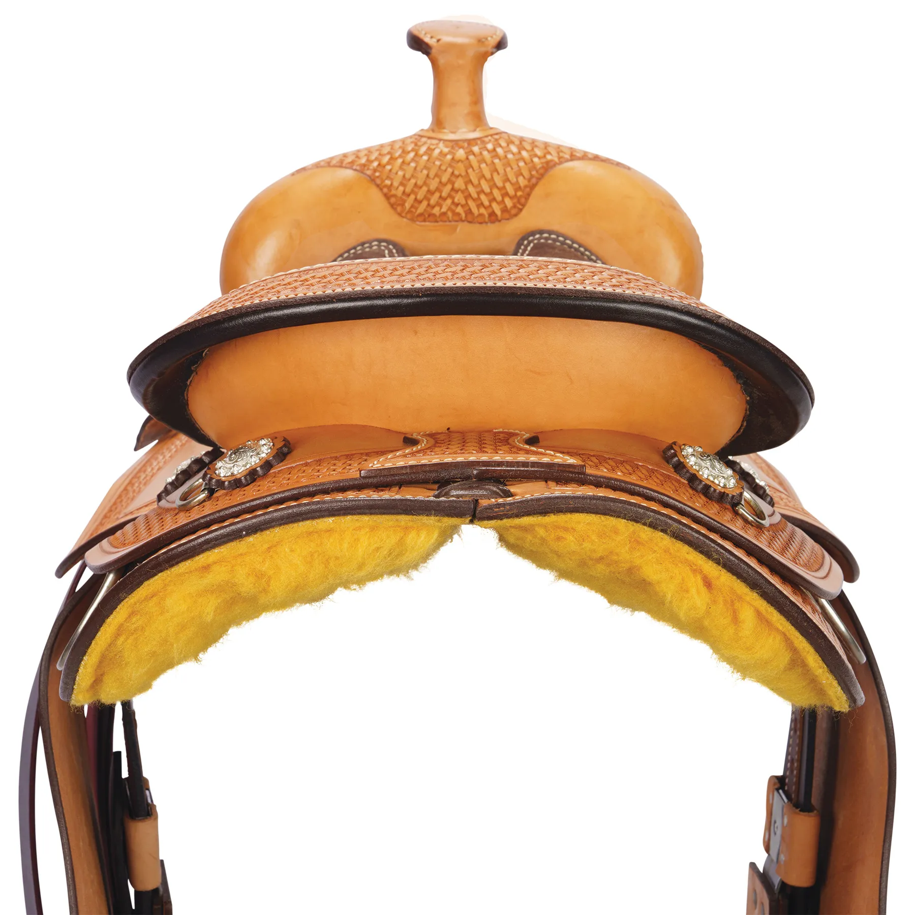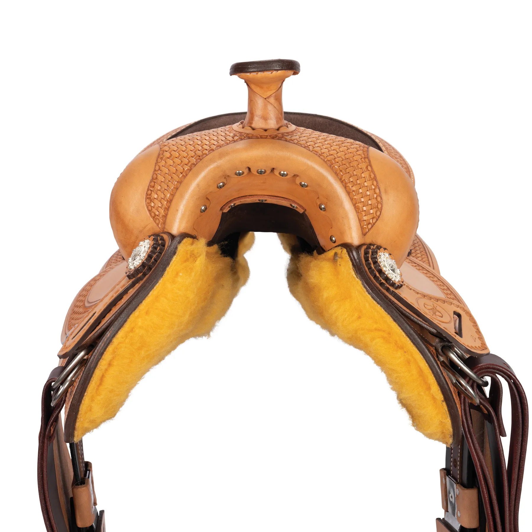 Perfect for young riders just starting out, this affordable youth saddle blends comfort, durability, and traditional Western styling. Featuring hand-tooled leather, a padded suede seat, and a lightweight fiberglass tree, it's ideal for everyday riding, trail adventures, or even trips into the show pen. Built to fit smaller horses with a 6" gullet and complete with stainless steel hardware, it's a smart, sturdy choice for growing riders.