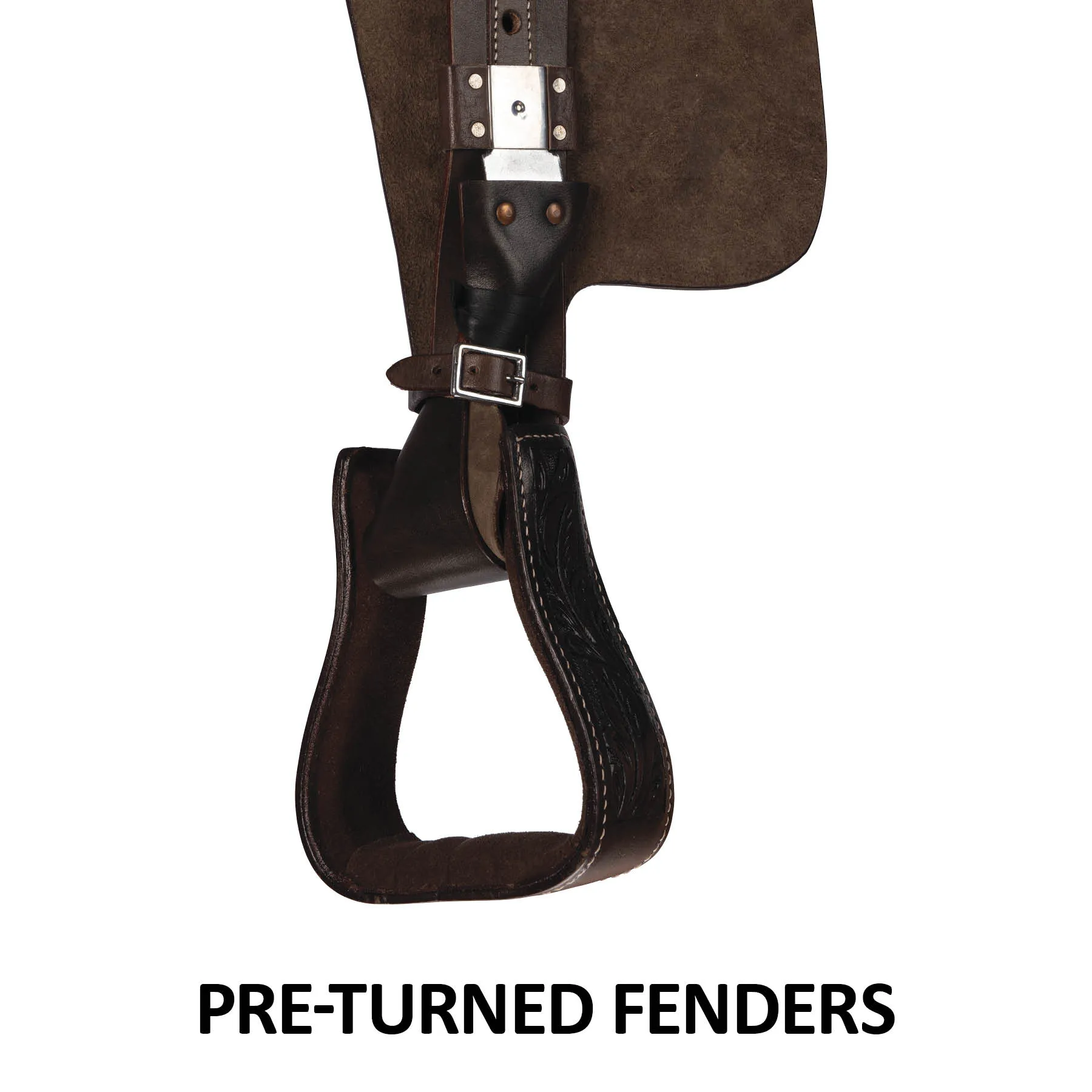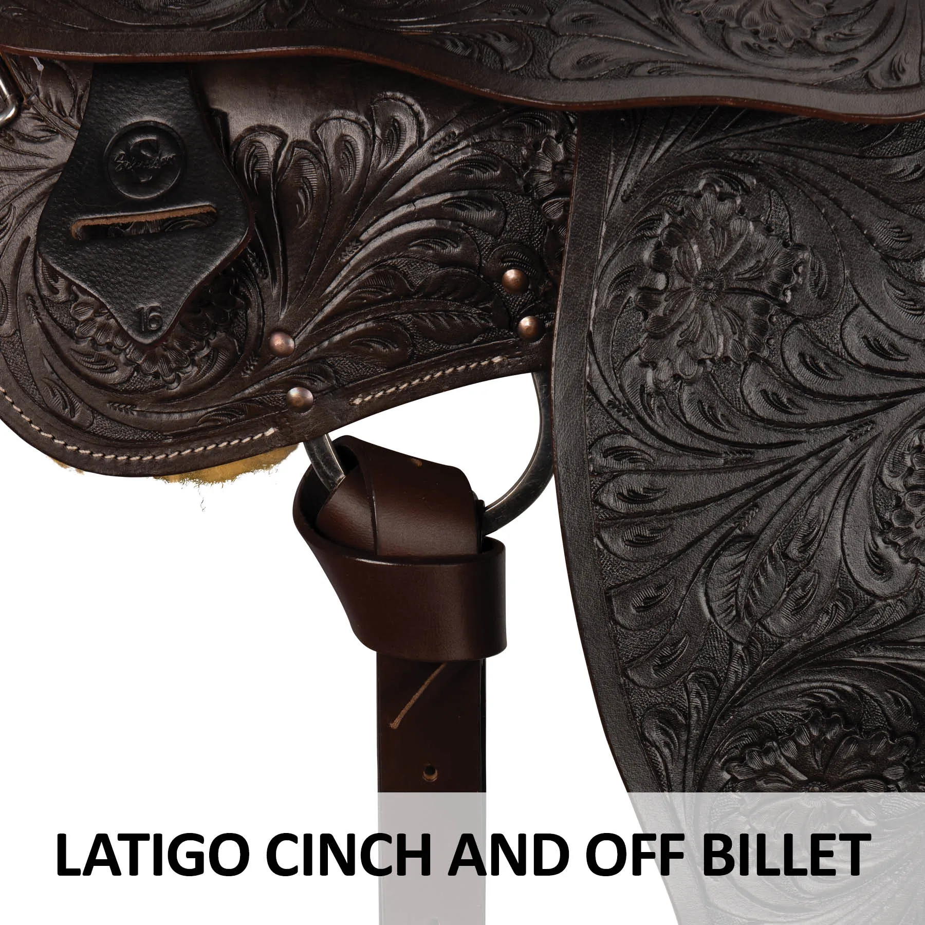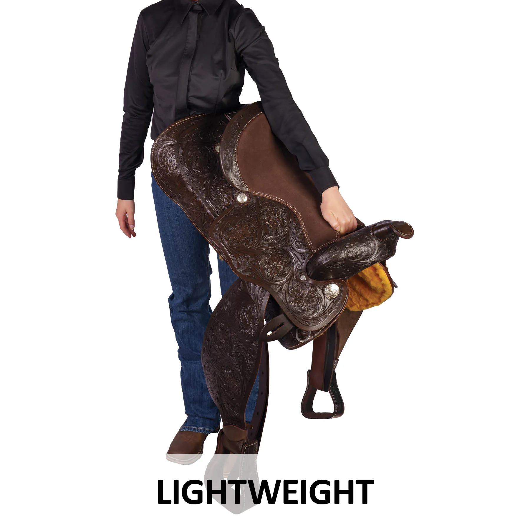 This all-around Western saddle is a beautifully tooled saddle that is your perfect companion! It's built on a lightweight fiberglass tree with a 5-year warranty, giving you peace of mind. Built with the modern horse in mind, this saddle features full bars to accommodate various horse sizes and is designed with a short skirt that is ideal for youngsters or shorter-backed breeds. The saddle boasts a comfortable hand-shaped and padded seat, ensuring a well-balanced ride every time.