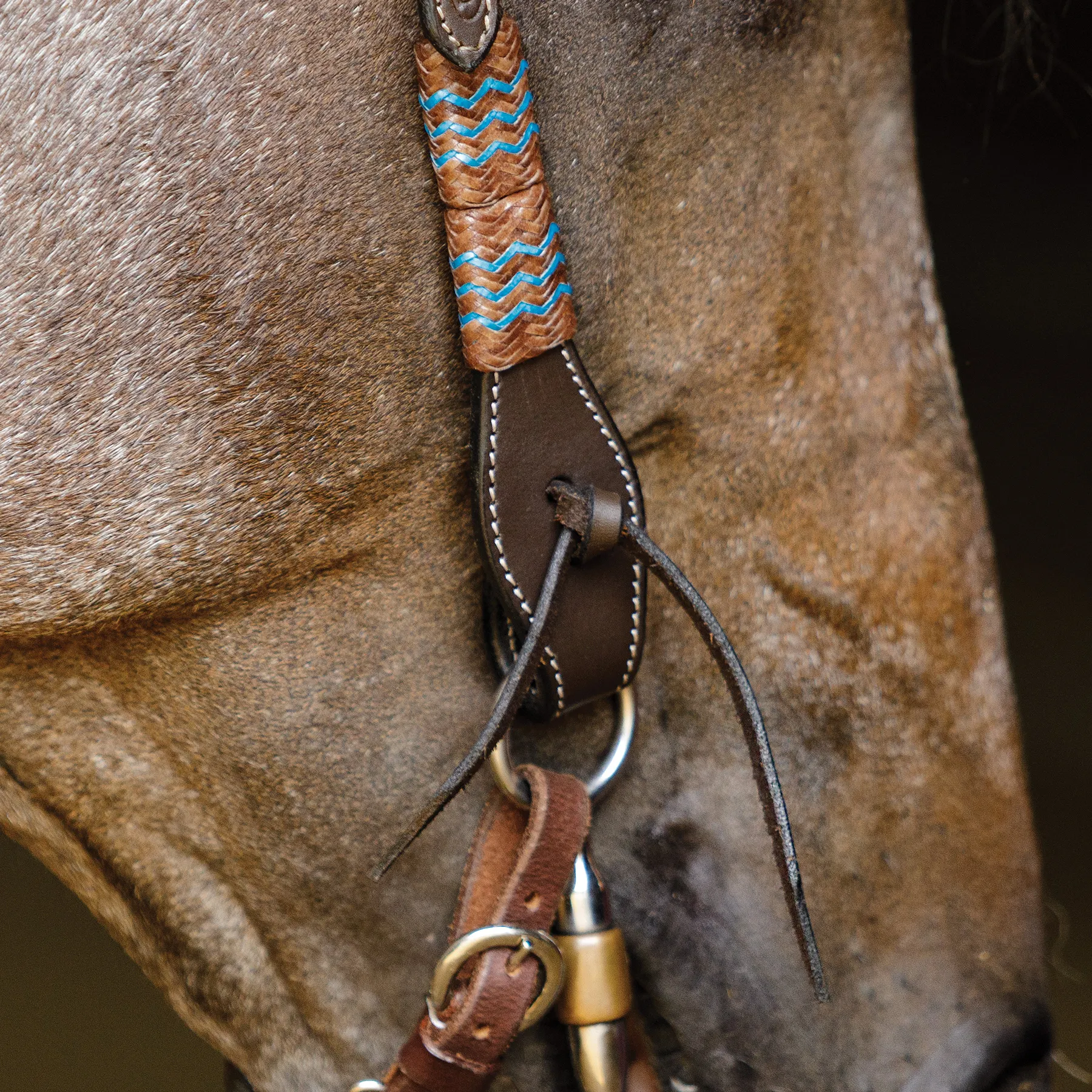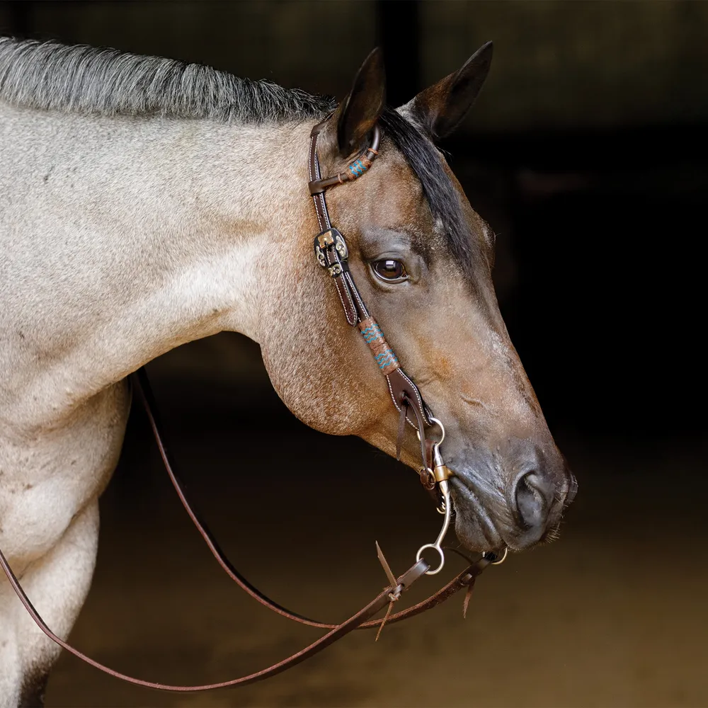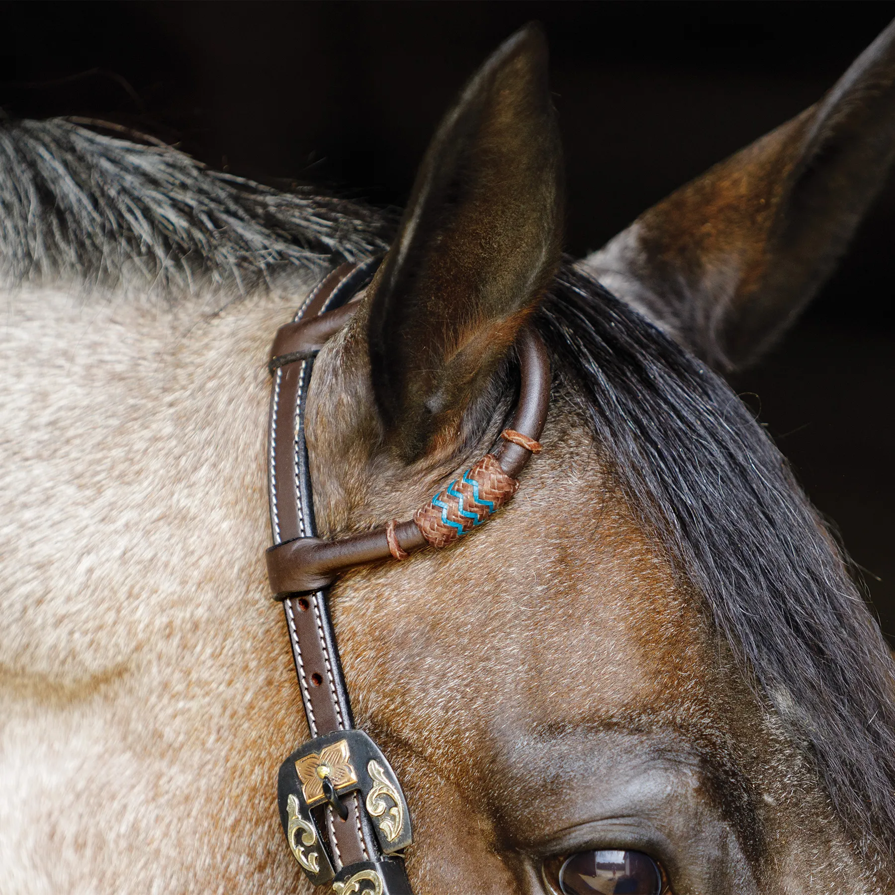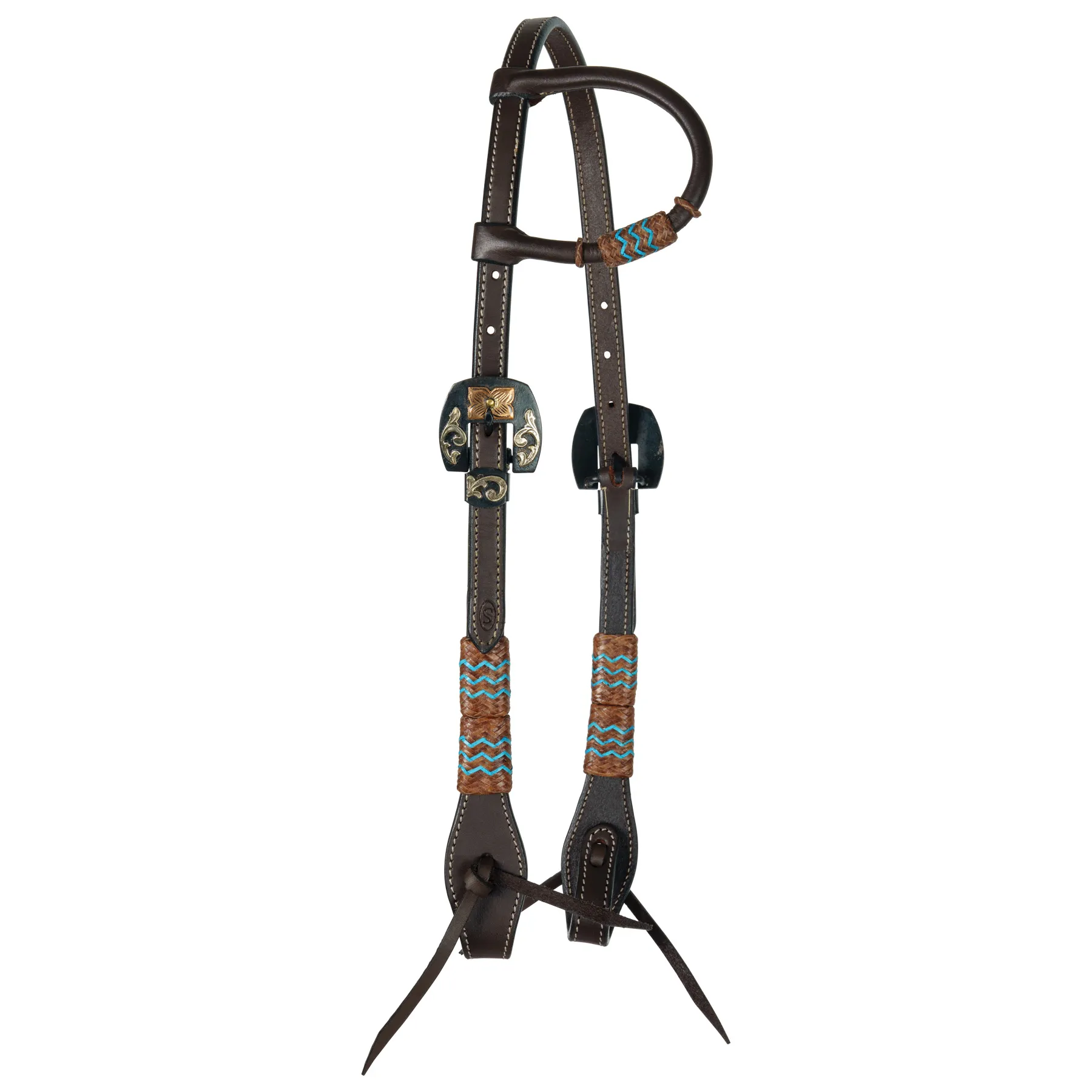 Add a touch of bold Western flair to your tack collection with this eye-catching one ear headstall. Crafted from rich chocolate Argentine leather and detailed with rawhide and turquoise accents, it blends classic craftsmanship with striking style. With durable construction and adjustable fit, it's as functional as it is fashionable.