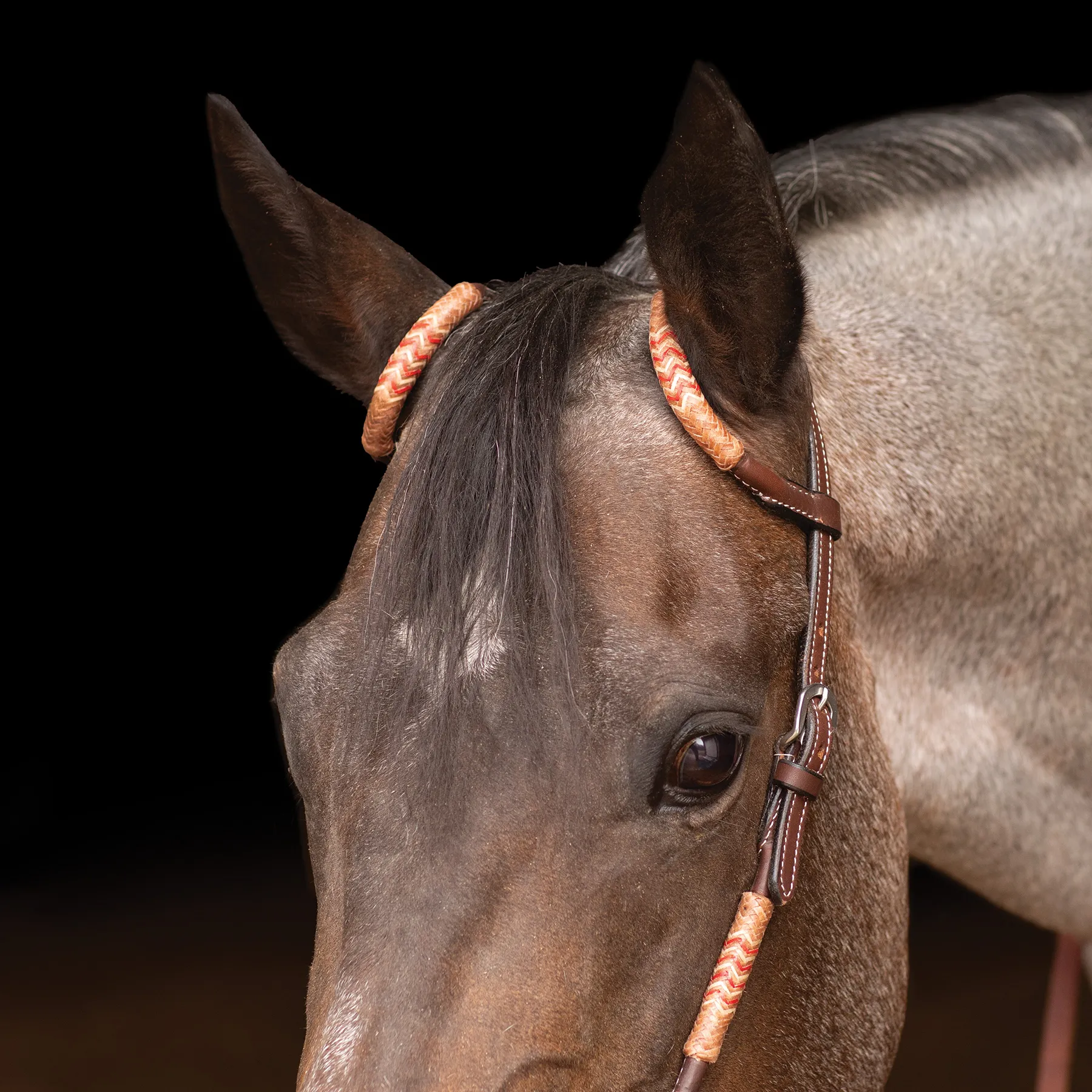 Elegant and functional, the Schneiders® Harness Leather Two-Ear Headstall with Chocolate Rawhide Accents is perfect for ranch classes, trail riding, and contesting. Made from high-quality Argentine leather, this dark oil headstall features hand-braided chocolate rawhide with red and white accents, giving it a refined yet rugged Western look. With rolled two-ear pieces, contrast white stitching, and stainless steel hardware, it's built for both style and durability.