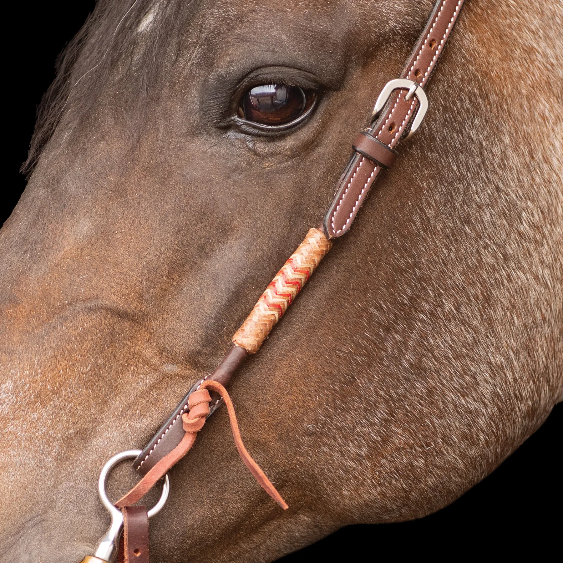 - Hand-braided chocolate rawhide accents with red and white detailing