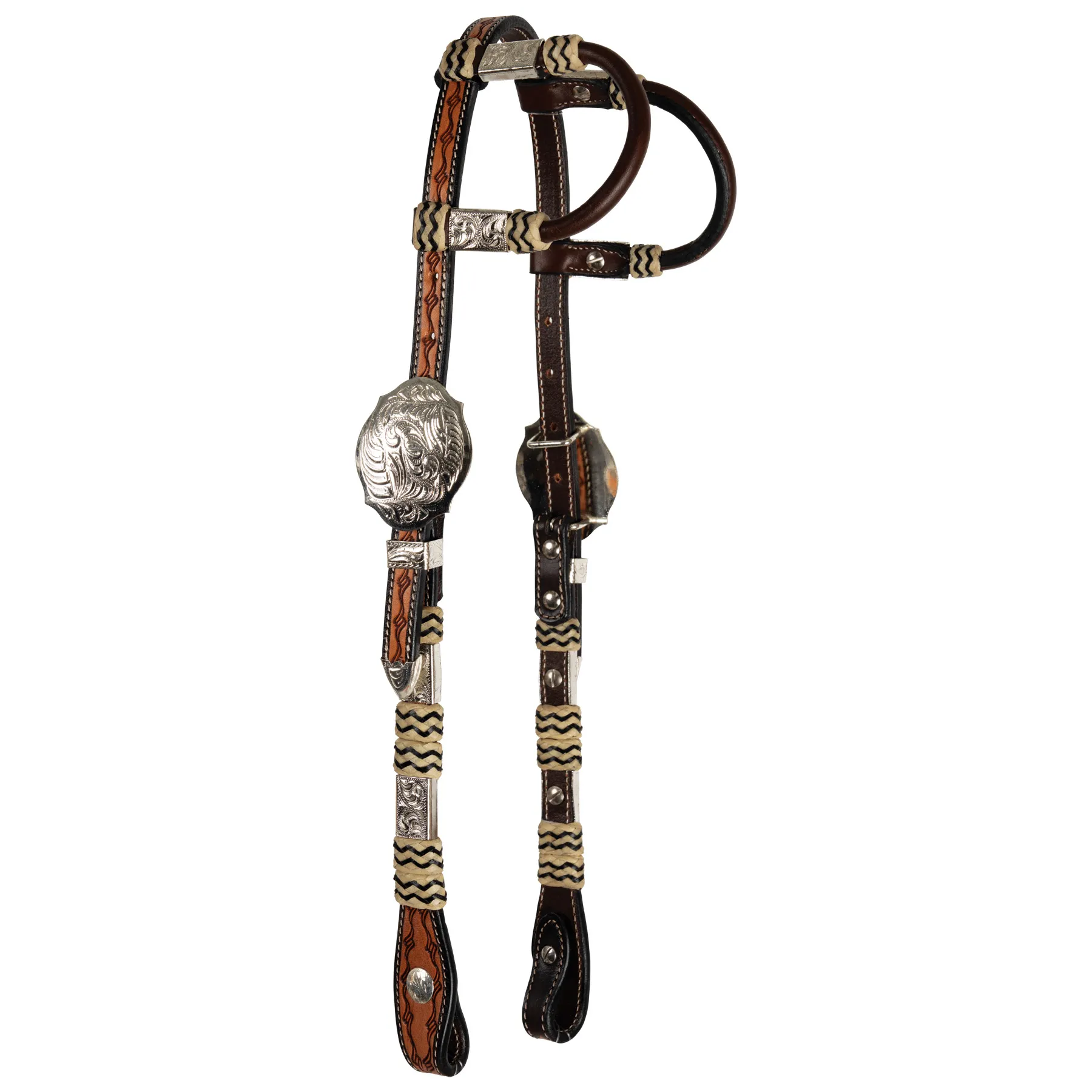 - Rolled two-ear design with silver and rawhide accents