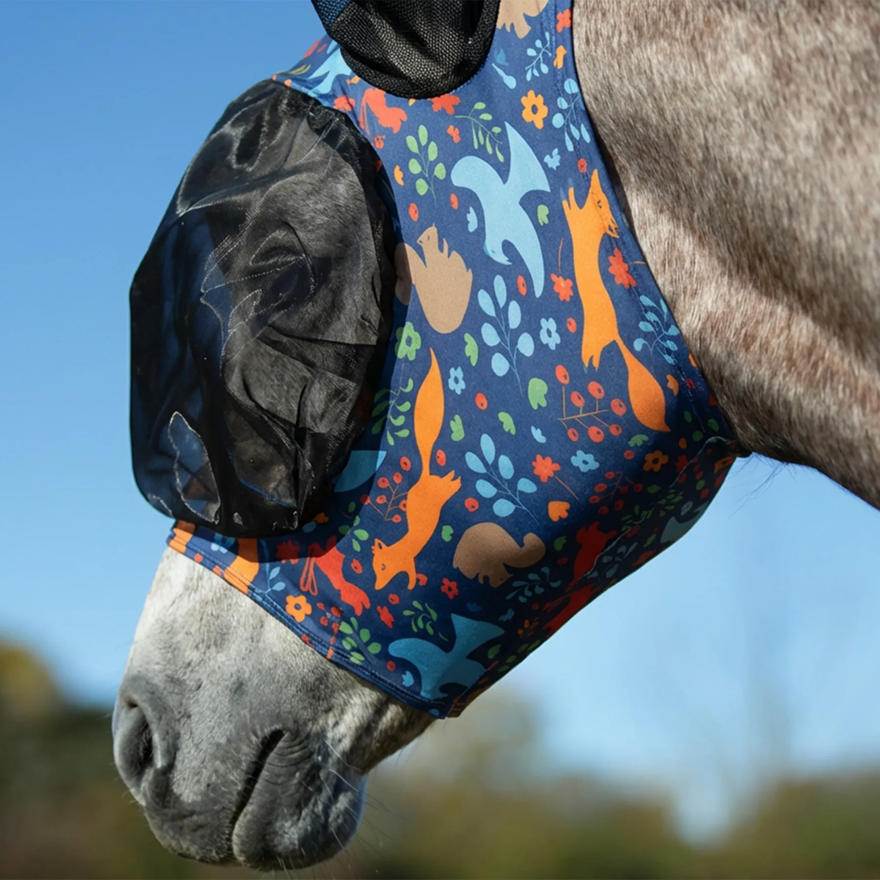 Add a little woodland charm to your horse's summer wardrobe with this snug, stretch-fit fly mask built for comfort and protection. Designed in a fun limited-edition woodland print, this pull-on style mask is made from 4-way stretch UltraFlex® lycra for a secure fit that stays put. Oversized mesh eye covers and soft mesh ears keep pesky bugs at bay, while a thoughtful forelock-saver design ensures your horse's forelock stays tangle-free and healthy. With 95% UV protection, it's a practical pick for sunny, buggy days.