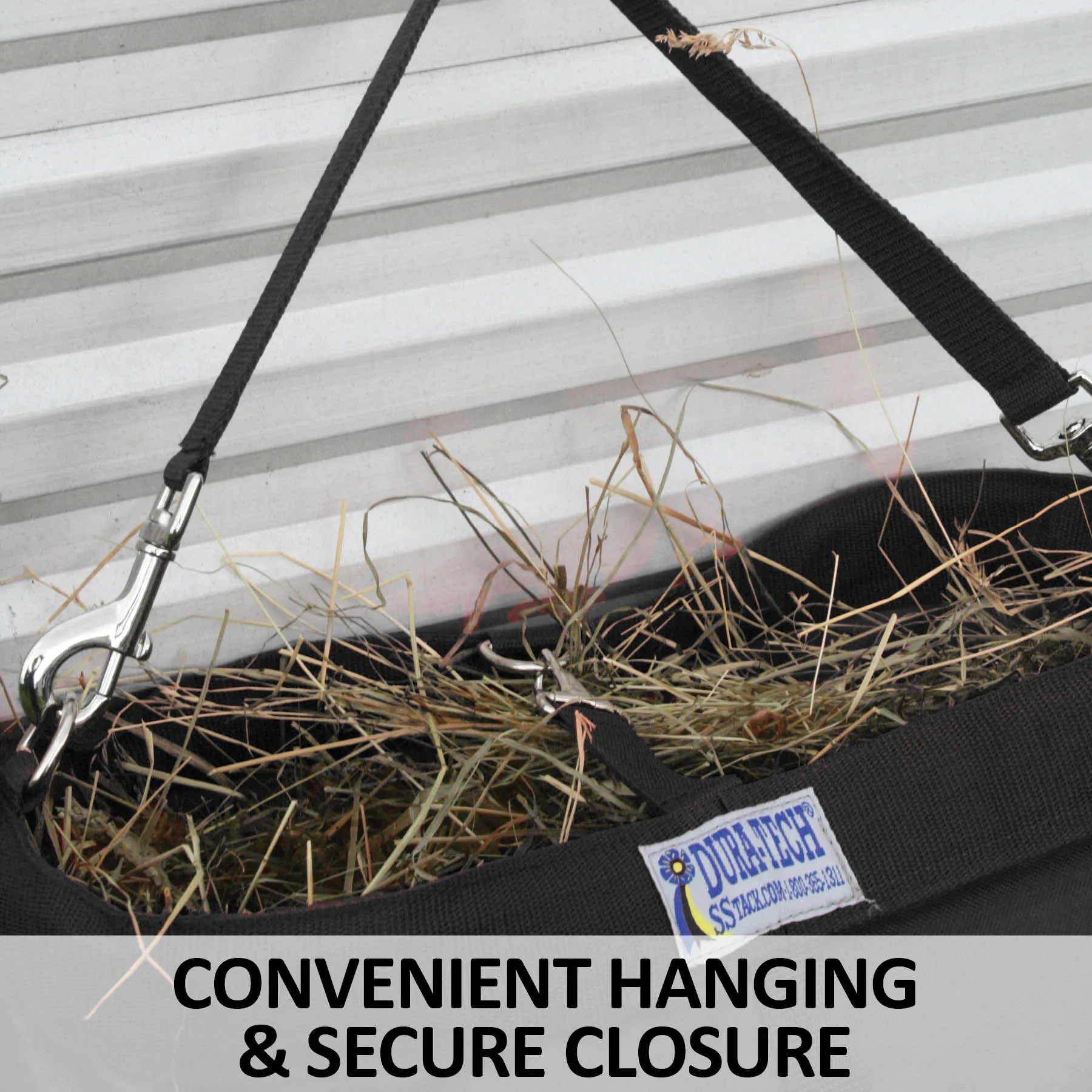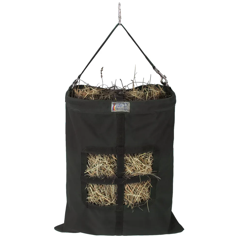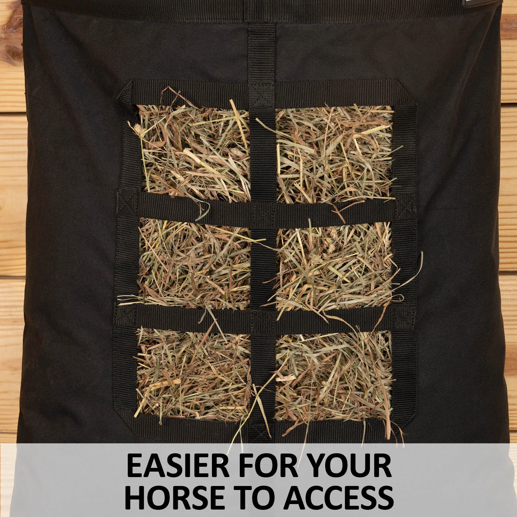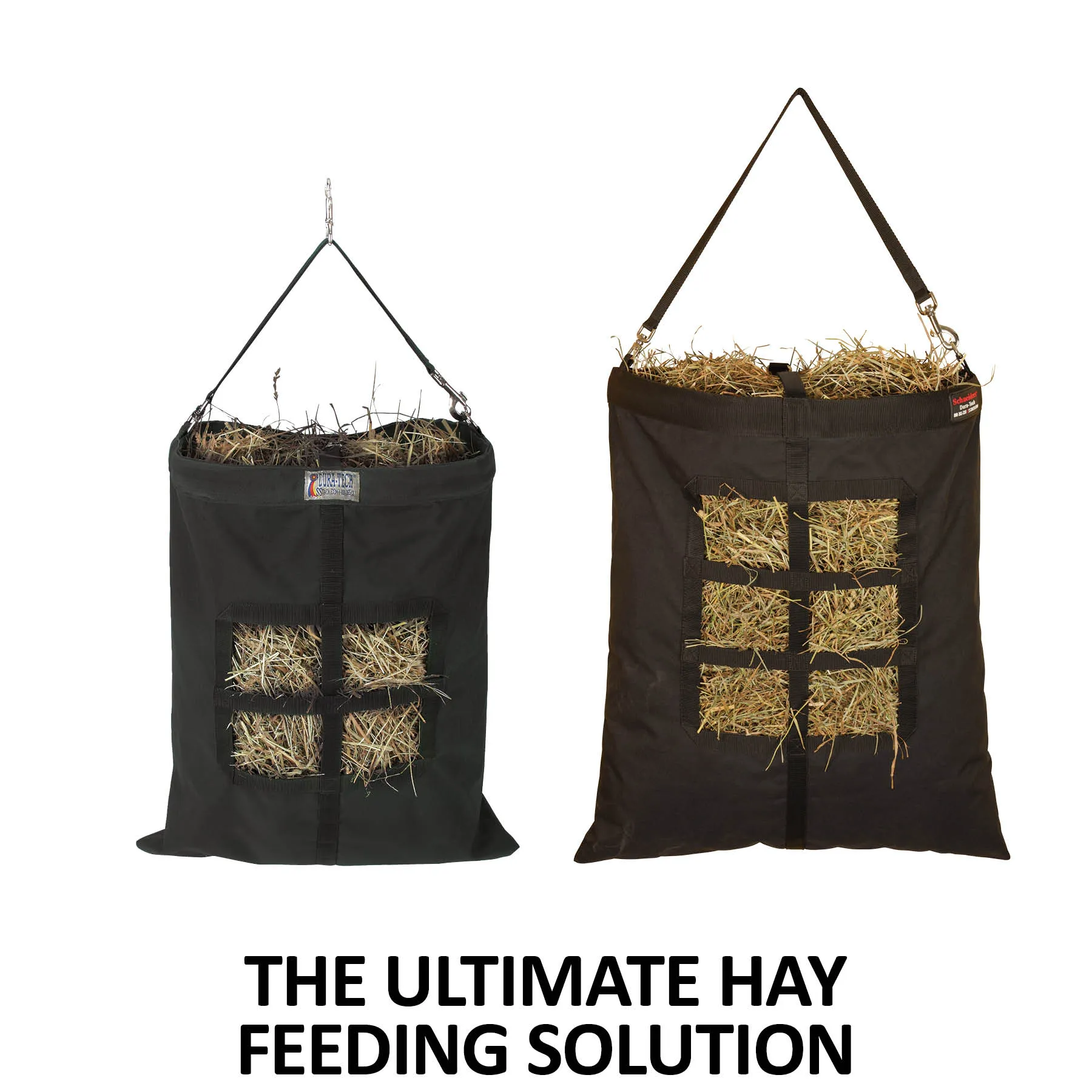 These hay bags are made of a tough fabric to withstand daily use. It provides your horse with hay access without the mess. They fit 2-4 flakes of hay, which minimizes refill frequency - a win-win for you and your horse! The floating snap top provides easy hanging wherever you need it, and the center top strap keeps the top bag sides tight together when filled for ultimate stability.