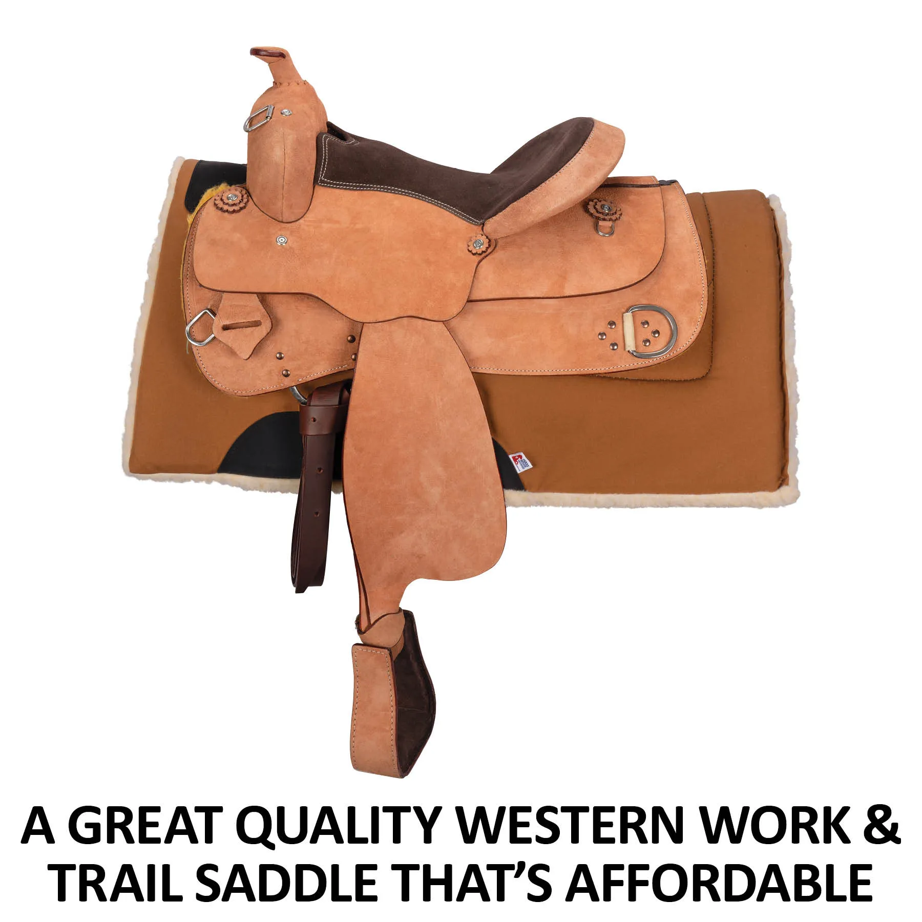 When you want a saddle that works as hard as you do, this work and trail Western saddle is your all-day saddle. Made with heavy-duty hardware, this beautiful saddle is ready for whatever the trail ahead leads to. The roughout design and padded seat keep you in place and comfortable all day, while the semi-quarter horse bars help this saddle fit today's horses, providing a comfortable fit for your horse. The thoughtfully designed cut-out under the fender provides a close contact feel, so you and your horse will communicate perfectly on the trail. Weighing 28 lbs, this saddle is extremely lightweight due to the fiberglass tree.