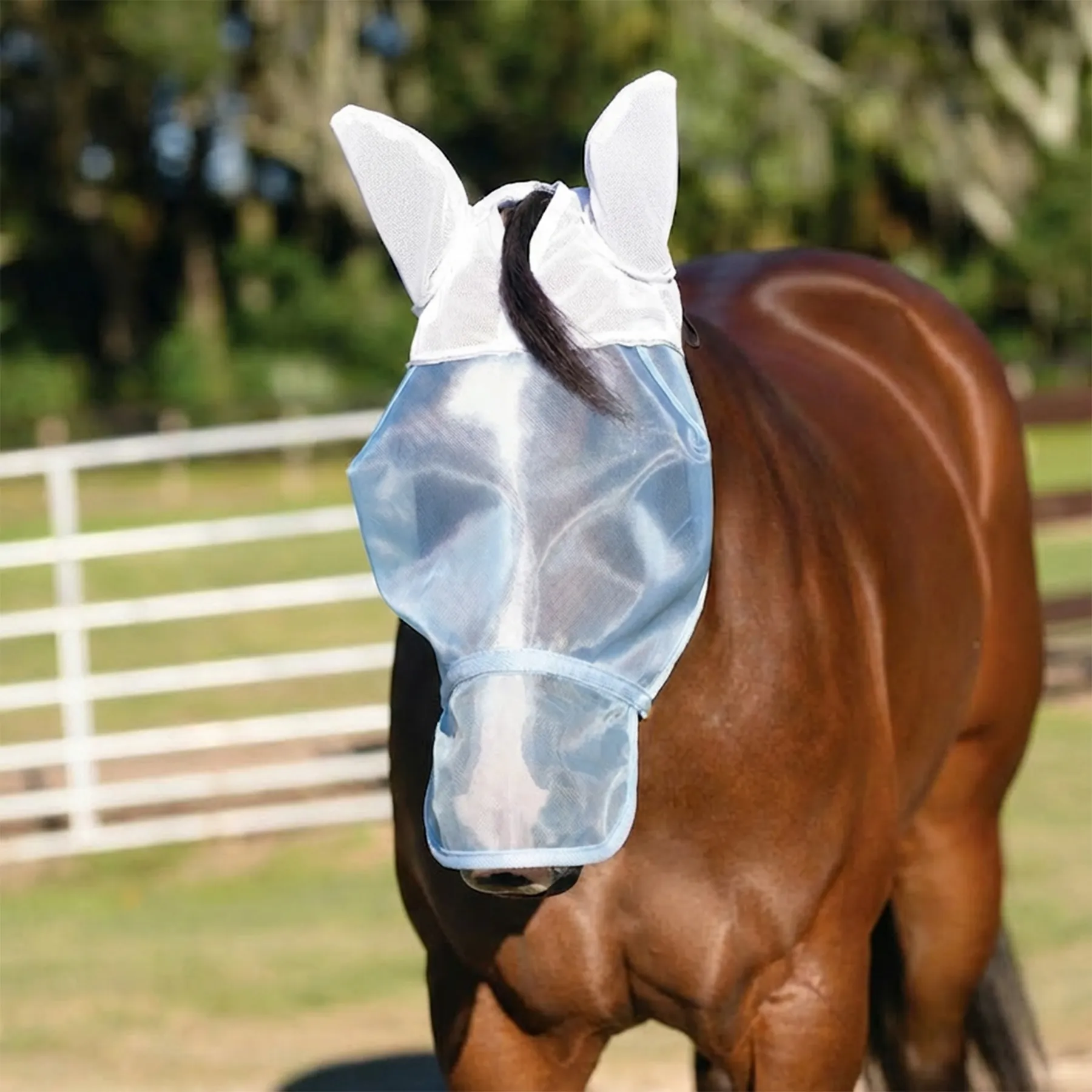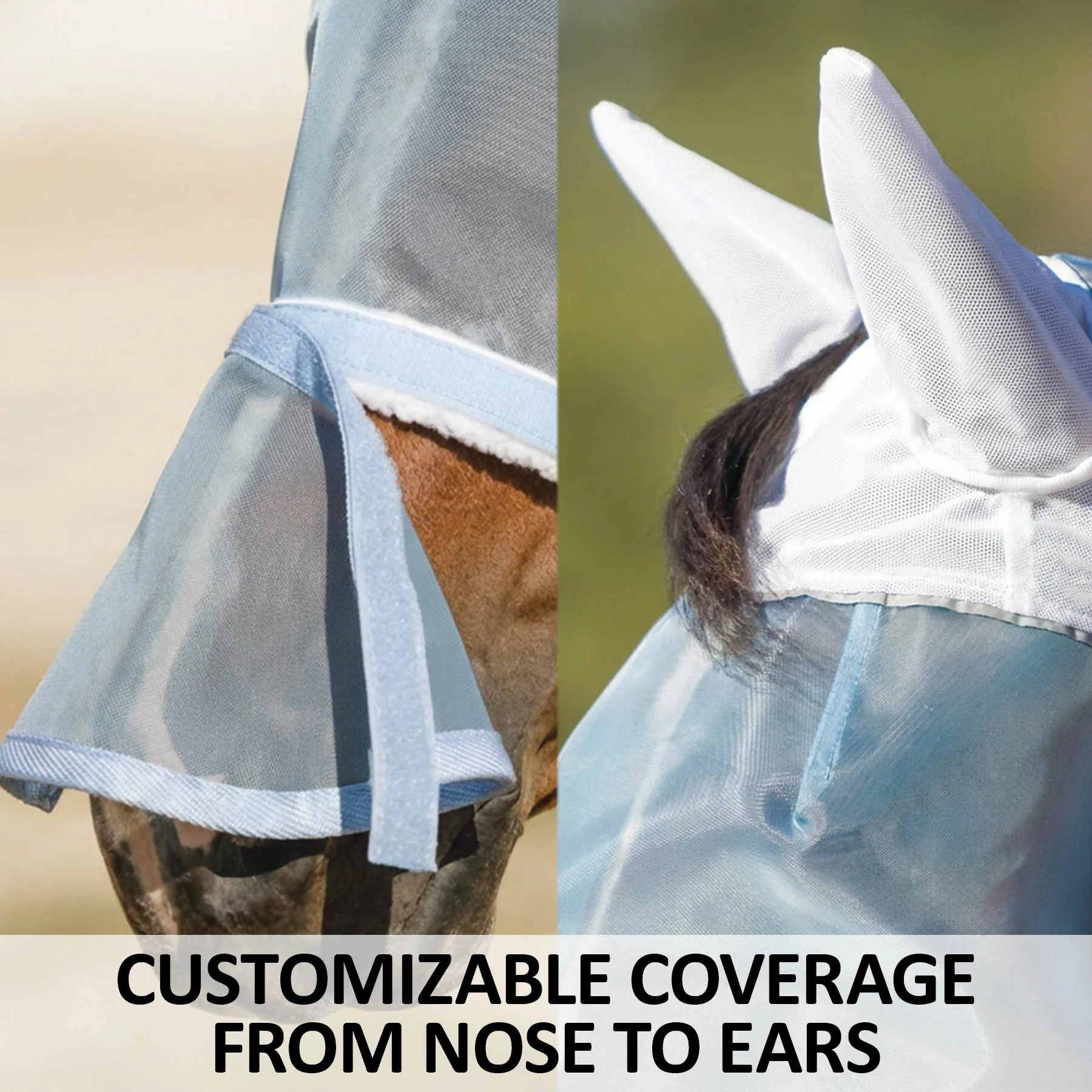 Say goodbye to irritating insects and hello to breathable, all-day comfort. This extended nose fly mask is designed for horses who need full-face protection without sacrificing comfort or movement. Crafted with ultra-fine 350D Mosquito Mesh™ and featuring our patented X-Spand® Lycra Jaw, it hugs the face without restricting your horse's natural jaw motion. Whether it's gnats, midges, or deer flies, this fly mask delivers serious insect defense while letting your horse graze, play, and relax with ease.